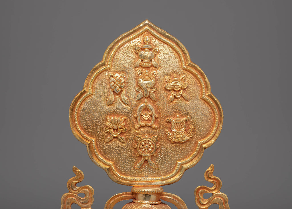 The Sacred Tibetan Eight Auspicious Symbols statue is a magnificent portrayal of ancient Tibetan spiritual symbols, skillfully carved from copper with electro gold plating. This powerful emblem is a key symbol in Tibetan Buddhism, representing blessings, prosperity, and good fortune. The monument features eight beautifully engraved symbols, each symbolizing a different facet of Buddhist teachings, such as the lotus flower, the infinite knot, and the wheel of Dharma. Each symbol has a profound spiritual significance, providing its possessor with calm, protection, and knowledge.