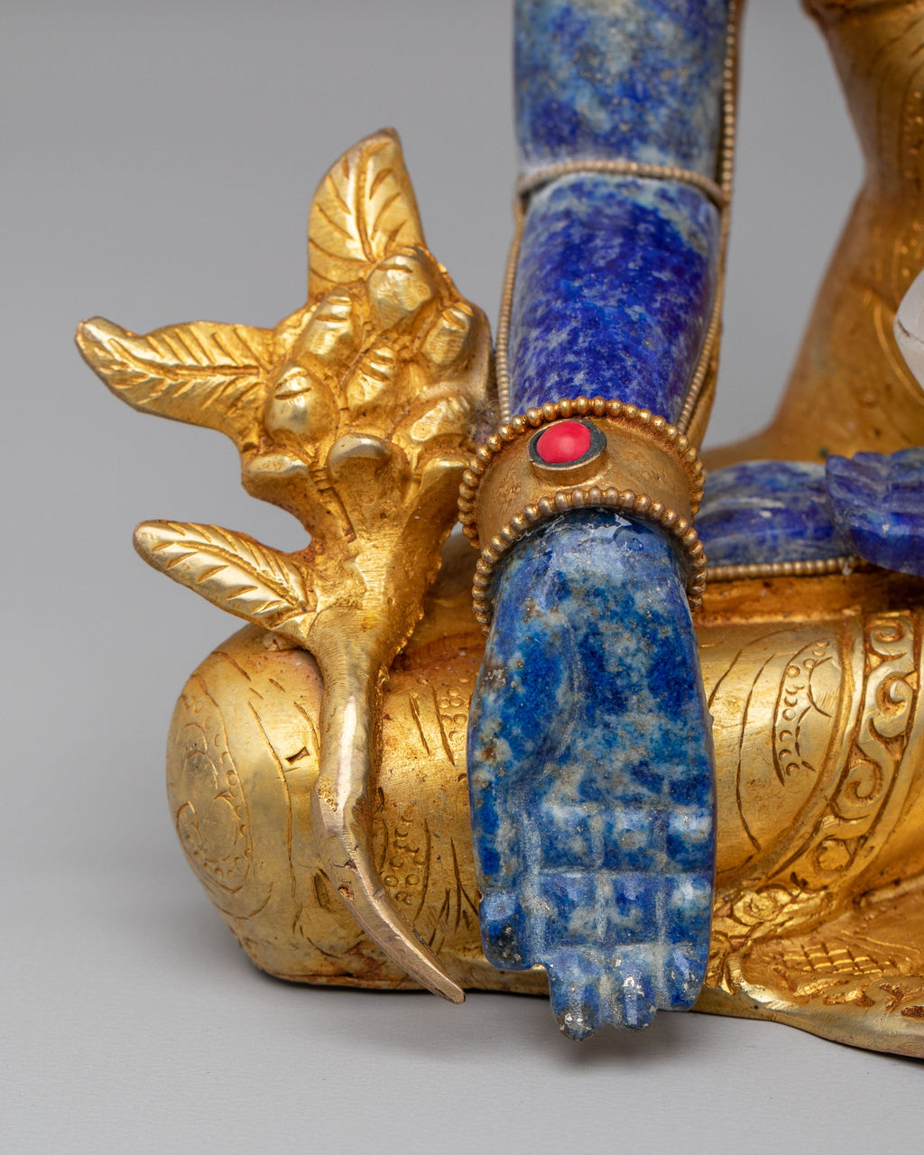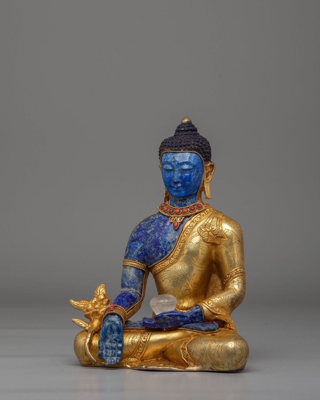 The statue represents the Medicine Buddha (Bhaisajyaguru), revered in Tibetan Buddhism as the embodiment of healing, compassion, and spiritual medicine. Traditional Himalayan design elements are reflected in the calm facial expression, detailed robes, and symbolic posture associated with health, balance, and the removal of suffering. The use of lapis lazuli, a stone traditionally linked to healing and wisdom, enhances the statue’s spiritual symbolism, while crystal and gemstone details highlight sacred artistry.