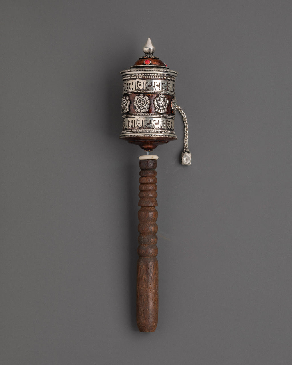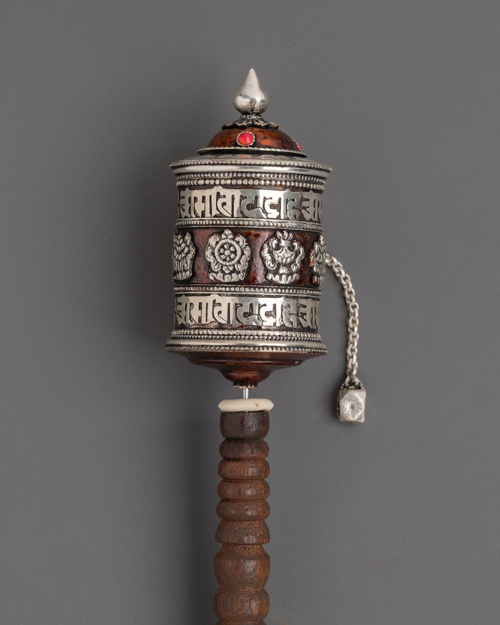 The wheel's body features intricate floral and mantra engravings, highlighting the artistic excellence of Himalayan craftsmanship. The combination of copper and brass emits a warm radiance, while coral stone accents add a sacred aesthetic. A wooden handle ensures comfortable movement, making it a graceful addition to any meditation altar, spiritual space, or mindful corner.