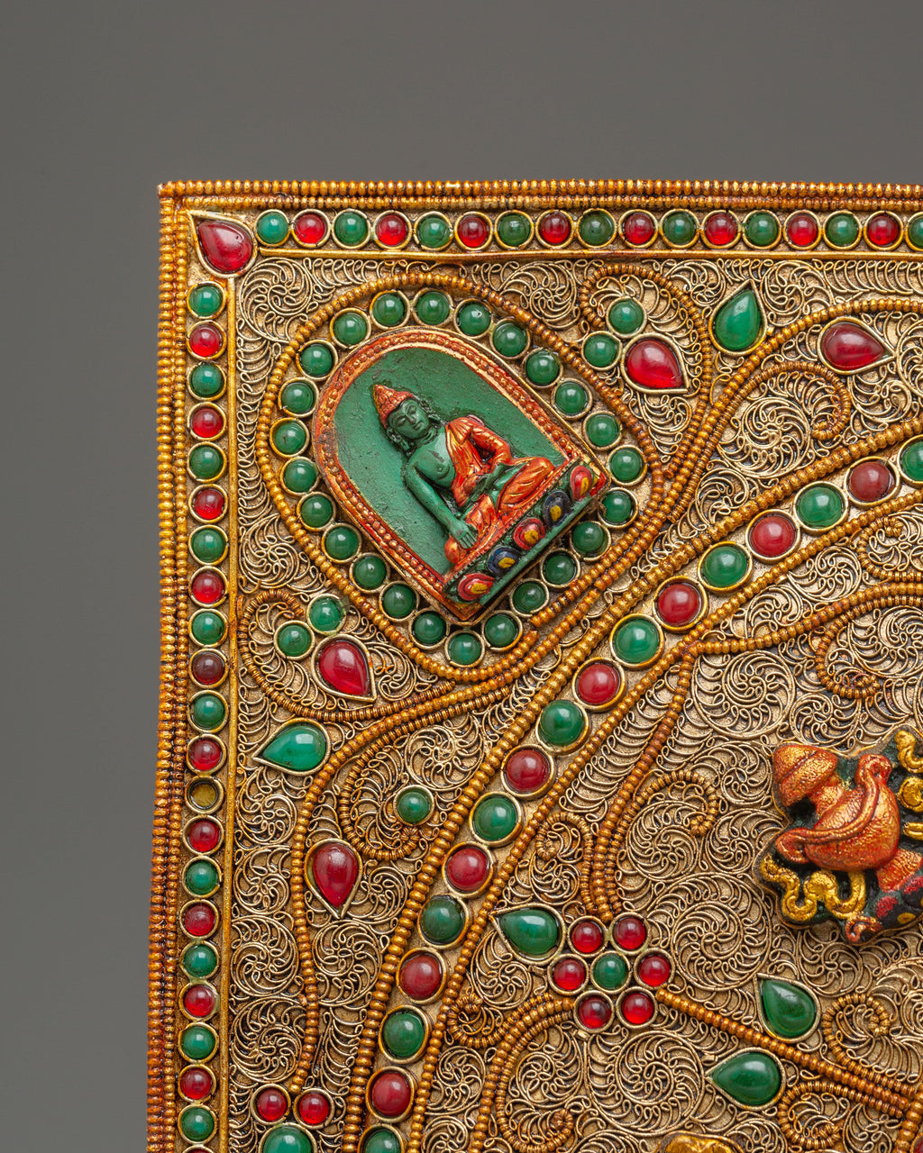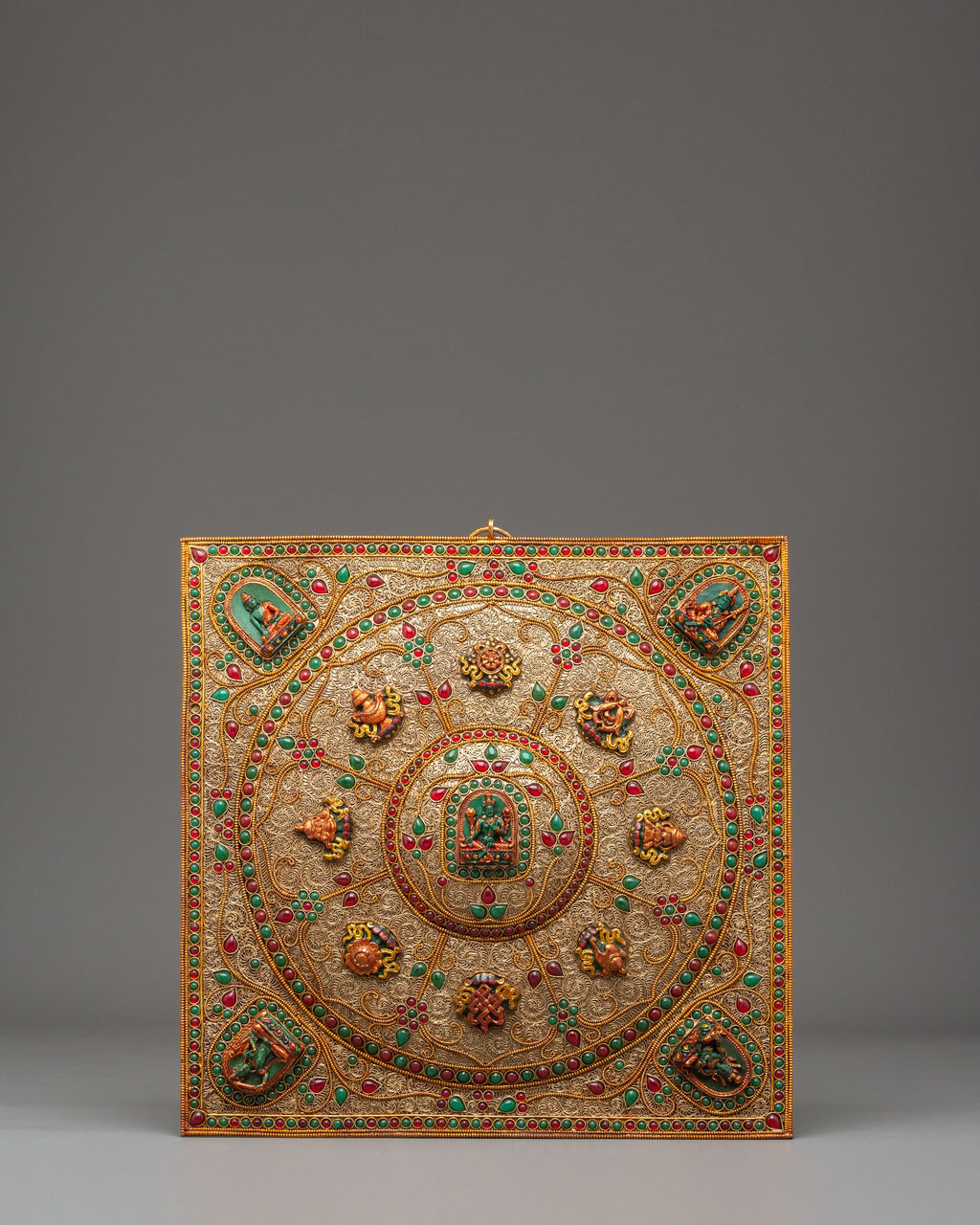 At the heart of this exquisite artwork sit revered deities — Shakyamuni Buddha, the enlightened teacher representing wisdom and compassion; Guru Rinpoche (Padmasambhava), the founder of Tibetan Buddhism who dispels obstacles and negativity; Manjushri, the Bodhisattva of transcendent wisdom; Green Tara, the compassionate savior known for swift protection; and Medicine Buddha, the divine healer symbolizing restoration and well-being. Surrounding them are auspicious symbols — the lotus, conch, and endless knot — all hand-carved with precision, forming a celestial mandala that embodies enlightenment and harmony.