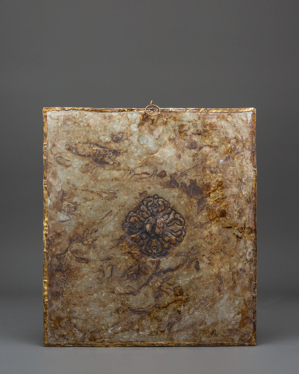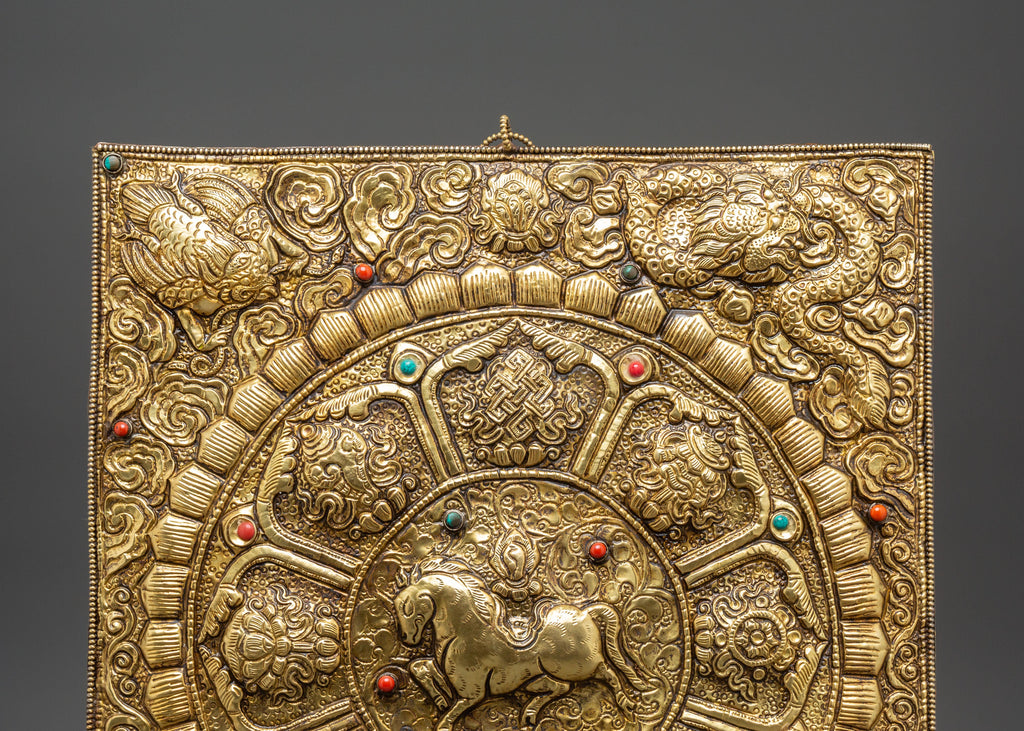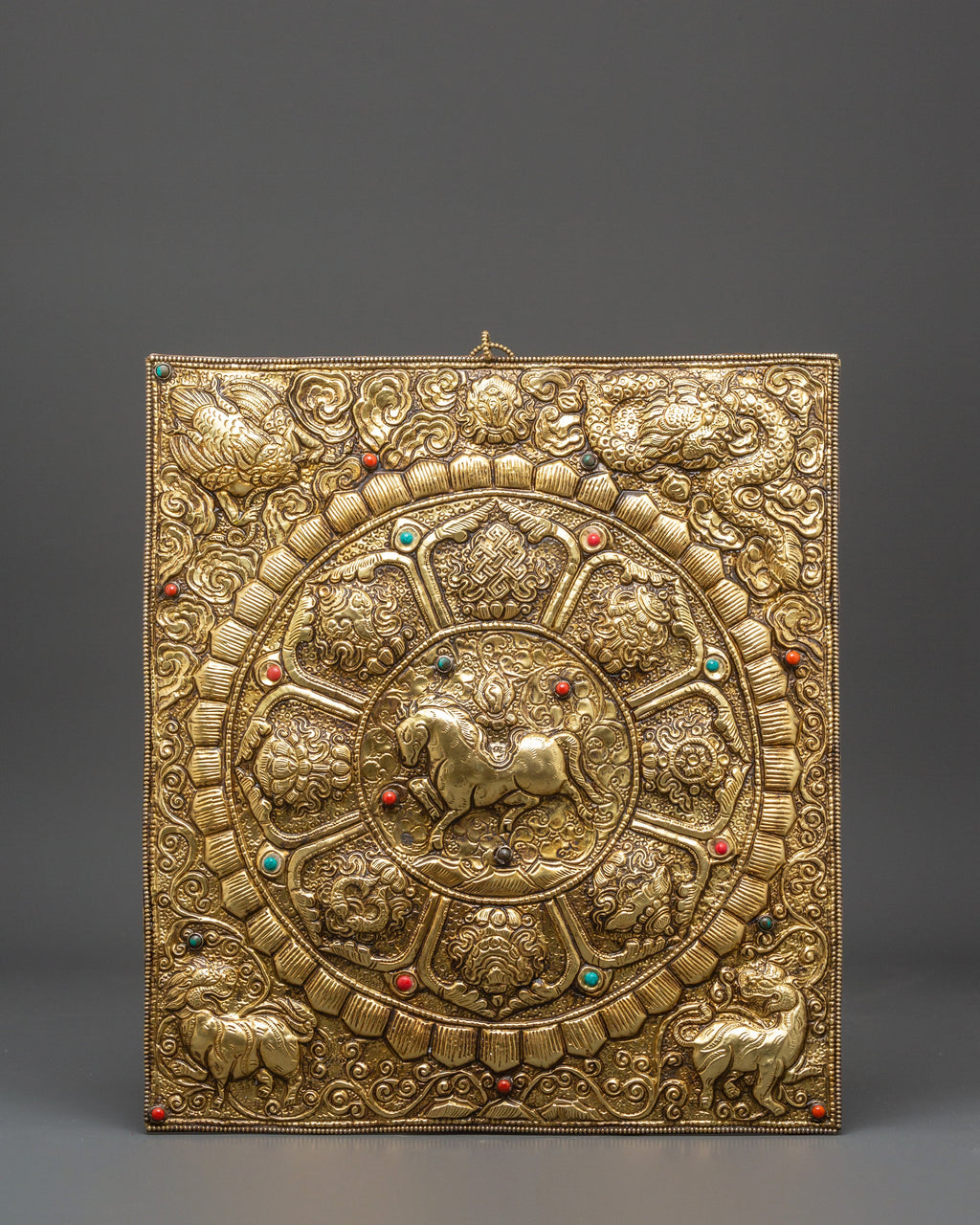 Around the central design, each corner of the wall hanging features intricate auspicious motifs—sacred emblems that embody wisdom, prosperity, and protection. These corner details create a beautiful balance, surrounding the Wind Horse and the Wish-Fulfilling Jewel with spiritual symbolism. The golden brass tone and gemstone accents reflect the sacred harmony found in Tibetan art, connecting body, mind, and spirit.