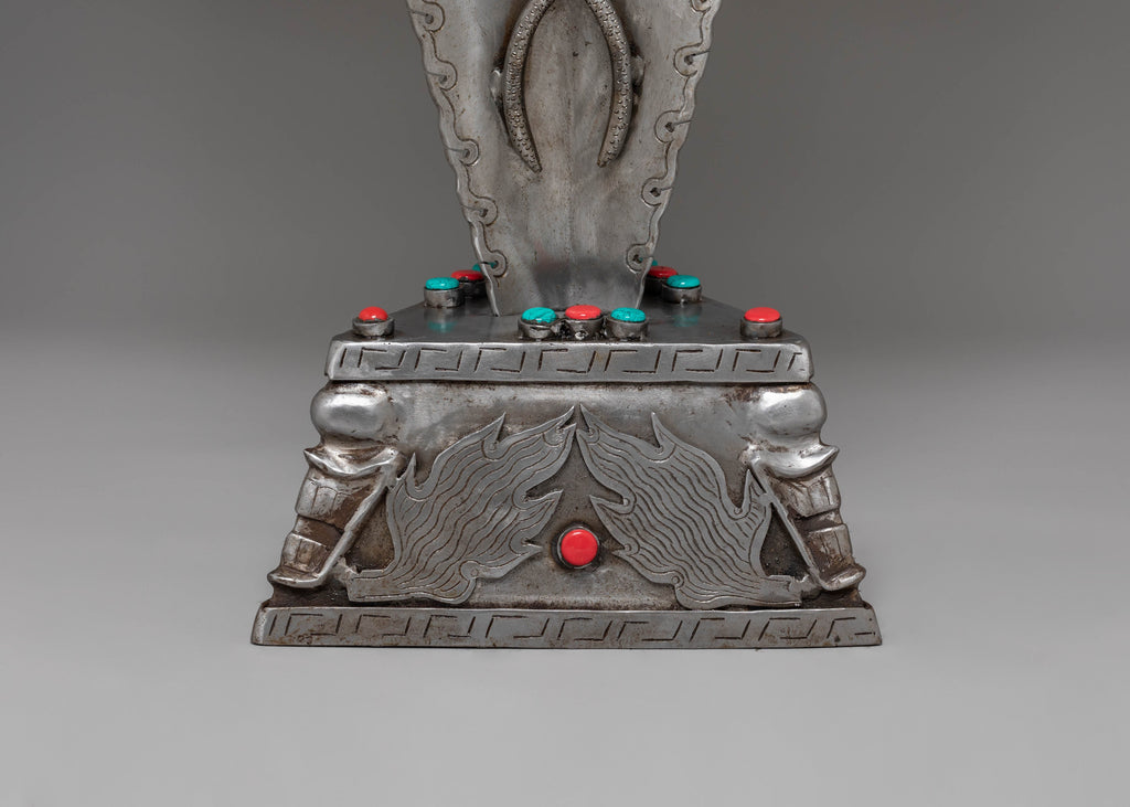 The gemstone inlays add vibrant color and energy to the phurba, enhancing its spiritual potency. These gemstones are believed to amplify the phurba’s protective abilities, bringing harmony and balance to the practitioner. The multiple blades of the phurba represent the cutting through of ignorance, attachment, and illusion, helping the practitioner achieve greater wisdom and enlightenment. This powerful artifact serves as a reminder of the transformative journey toward inner peace and spiritual growth, making it an essential addition for practitioners seeking deeper connection and protection in their rituals.