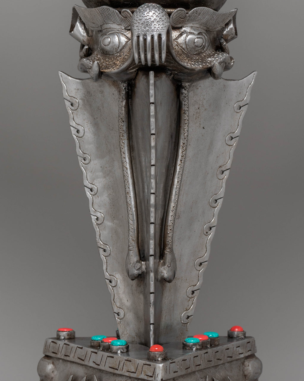 Ideal for collectors, spiritual seekers, and those interested in Tibetan culture, this phurba is more than just a decorative piece; it is a tool for meditation, ritual practice, and energy work. Displayed prominently, it commands attention and reverence, serving as a focal point for spiritual reflection and protection. Whether incorporated into your personal altar or displayed as a cultural artifact, the Sacred Traditional Tibetan Phurba offers both aesthetic beauty and profound spiritual significance. It is an exceptional addition for anyone seeking to deepen their practice, enhance their space with sacred energy, or simply appreciate the artistry of Tibetan metalwork.