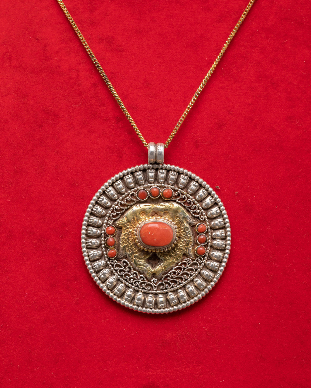 Celebrate spiritual meaning and cultural heritage with this Twin Fish Buddhist Pendant, a striking example of traditional Tibetan artistry. The pendant features two beautifully crafted golden fish swimming in harmony around a central coral stone, symbolizing freedom and spiritual awareness. Detailed silver beading surrounds the motif, along with smaller coral stones that enhance its sacred energy. The silver and gold-plated surfaces create a visually rich contrast, reflecting deep-rooted symbolism and care in craftsmanship.