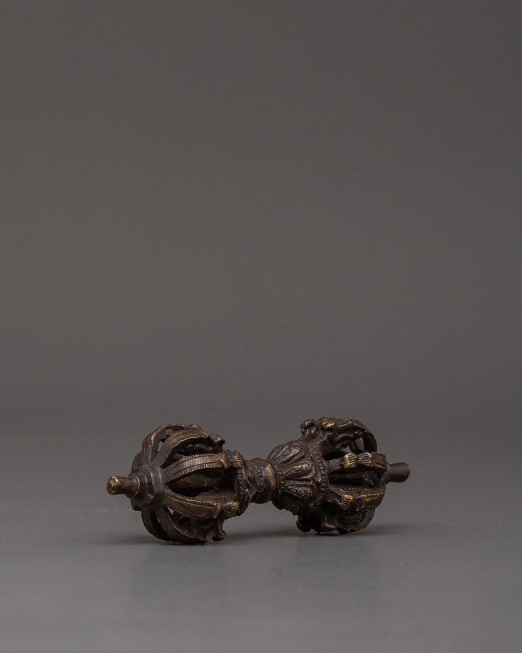 Tibetan Dorje represents the indestructibility and efficiency that overcome all obstacles. Symbolically, Dorje Vajra destroys ignorance. In Tibetan Buddhist rituals, the vajra is often paired with the bell, representing the masculine and feminine, the ying and yang, the effective action, and the compassion. The shape of the Tibetan Dorje is symmetrical, the two pyramidal heads representing samsara and Nirvana, which cancel each other out in its center thanks to the ring of Emptiness. Having a Dorje at home would have positive virtues against the various attacks we suffer.