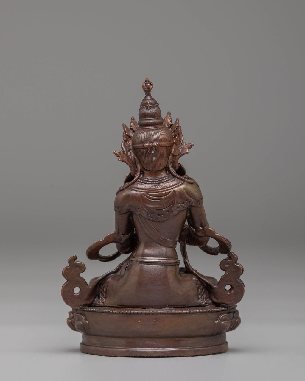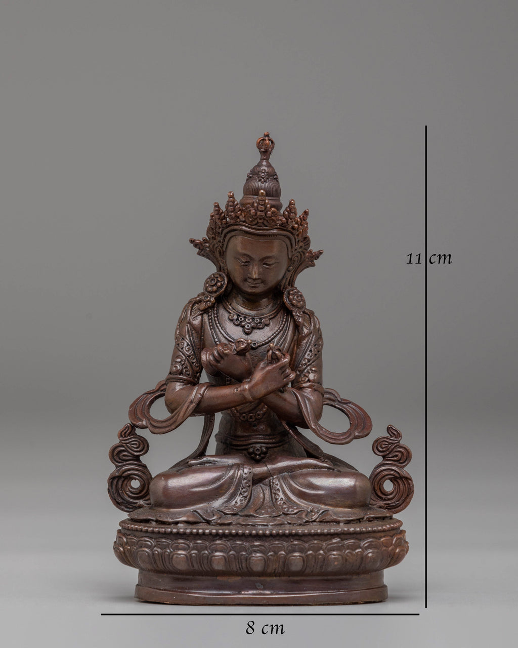 This handcrafted Sacred Vajradhara Buddha statue, made of oxidized copper, embodies divine wisdom and spiritual enlightenment. Standing at 11 cm tall, this intricately detailed statue captures the serene essence of Vajradhara, the primordial Buddha in Tibetan Buddhism. Its unique oxidized finish gives it a sacred and timeless appearance, making it a perfect addition to your meditation space or altar.