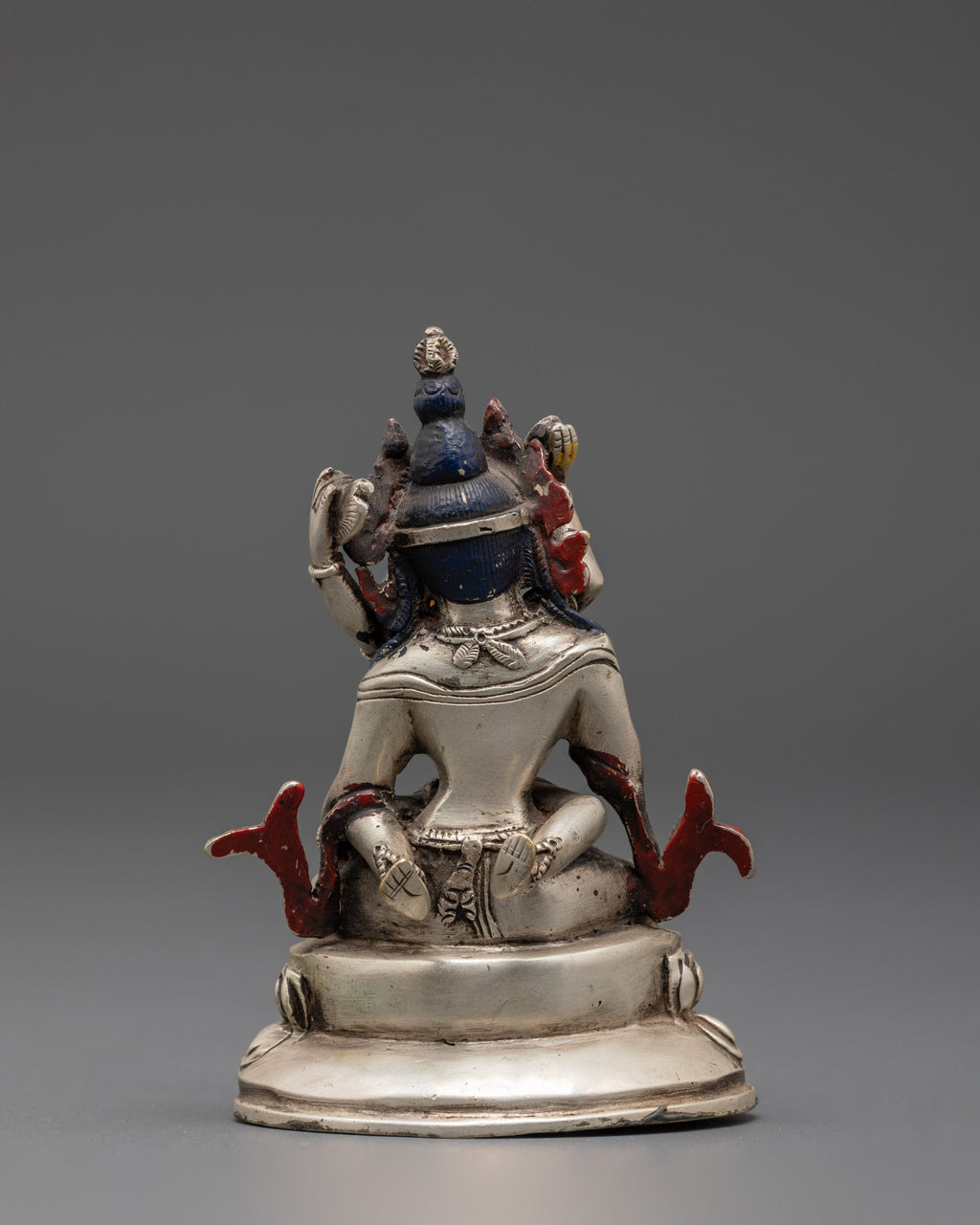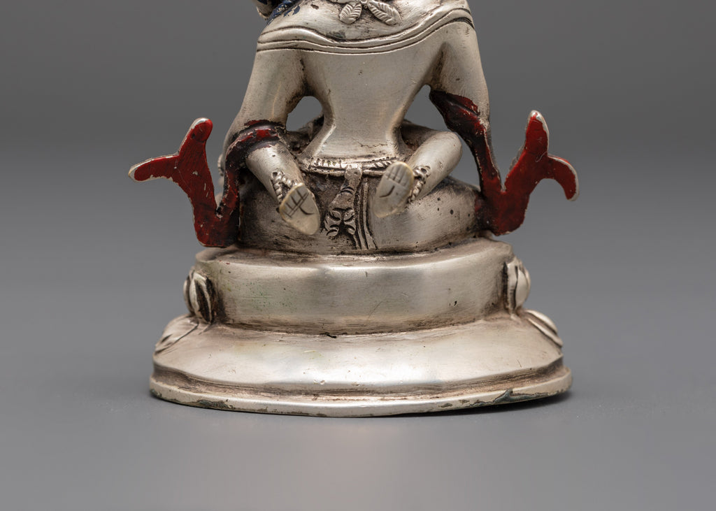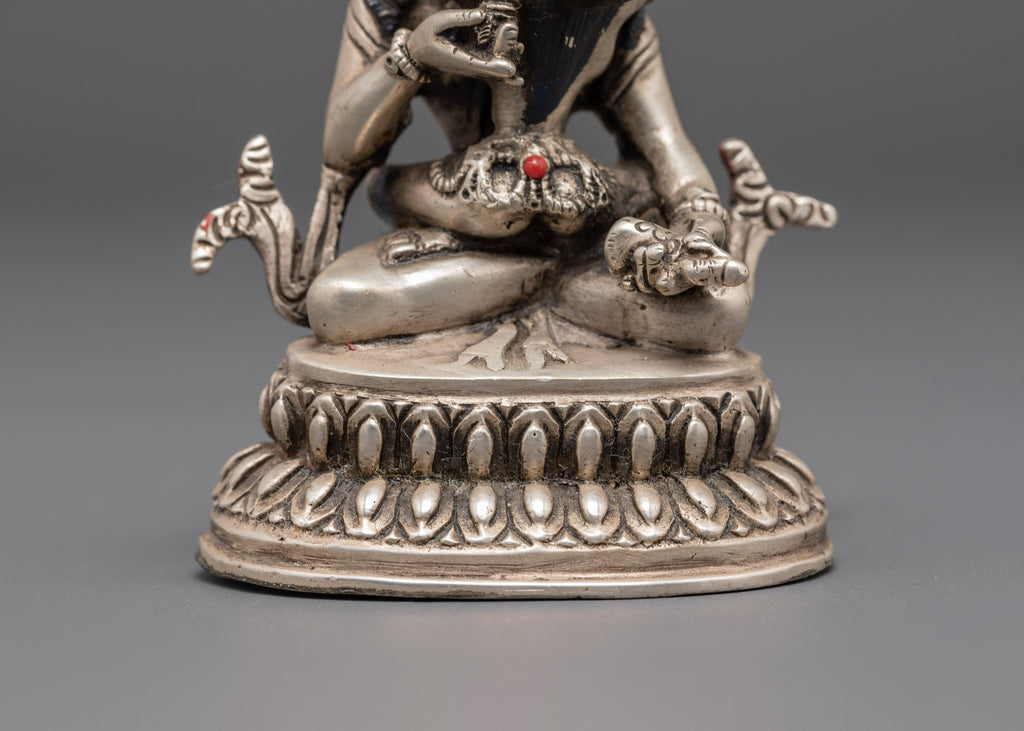This Sacred Vajrasattva with Consort Statue is a stunning handcrafted piece made of copper and plated with silver, with turquoise and coral inlays. This sacred sculpture, measuring 10.5cm in height by 8cm in breadth and weighing 0.30kg, is compact yet meticulously crafted, making it excellent for home shrines, meditation areas, or as a significant addition to Buddhist altar design. The combination of copper and silver represents power and purity, while turquoise and coral stones offer auspicious meaning and spiritual depth.