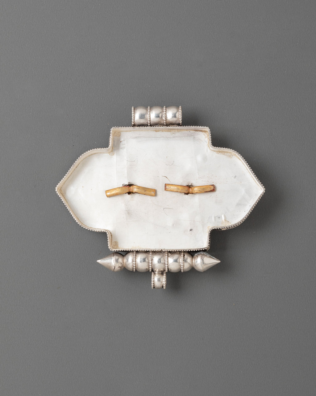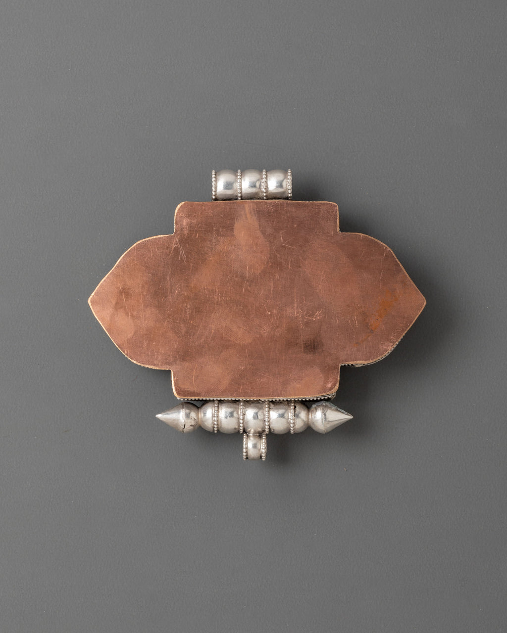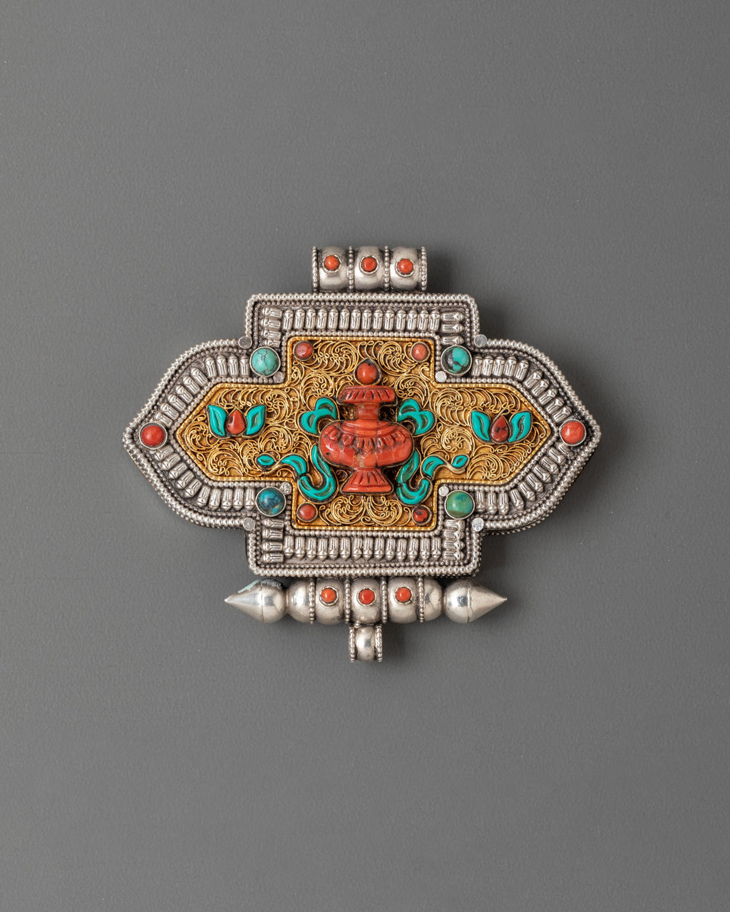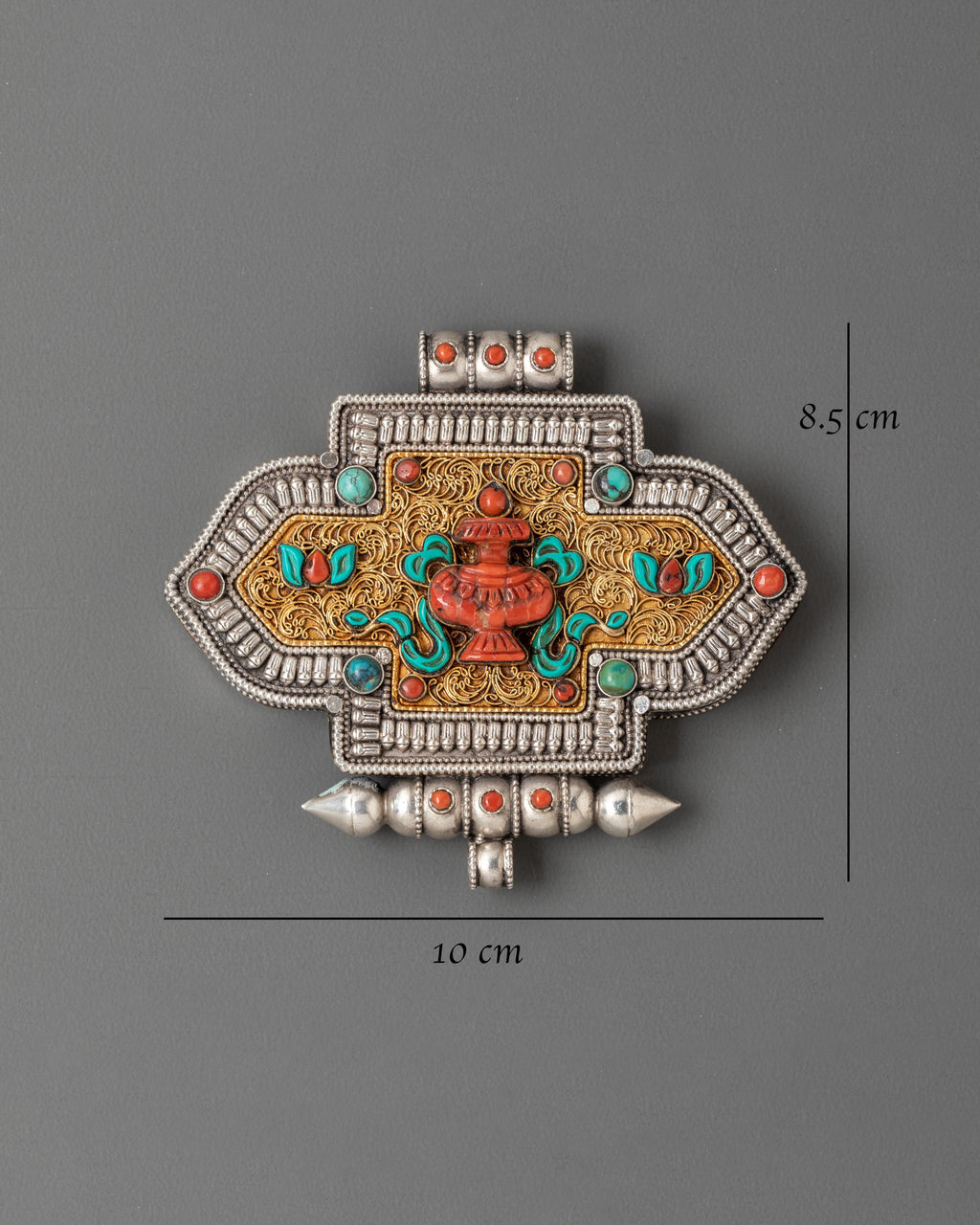 The Sacred Vase Ghau Box Locket is a beautifully crafted piece of spiritual jewelry, featuring intricate silverwork combined with semi-precious coral and turquoise stones. This 8.5cm by 10cm locket showcases a stunning sacred vase in the center, surrounded by delicate floral and leafy patterns that evoke a sense of tranquility and connection with nature. The silver filigree detail enhances the vibrancy of the turquoise and coral stones, making this locket a perfect representation of cultural artistry. This handcrafted locket is deeply meaningful, often used to carry sacred relics or mantras, offering protection and spiritual blessings.
