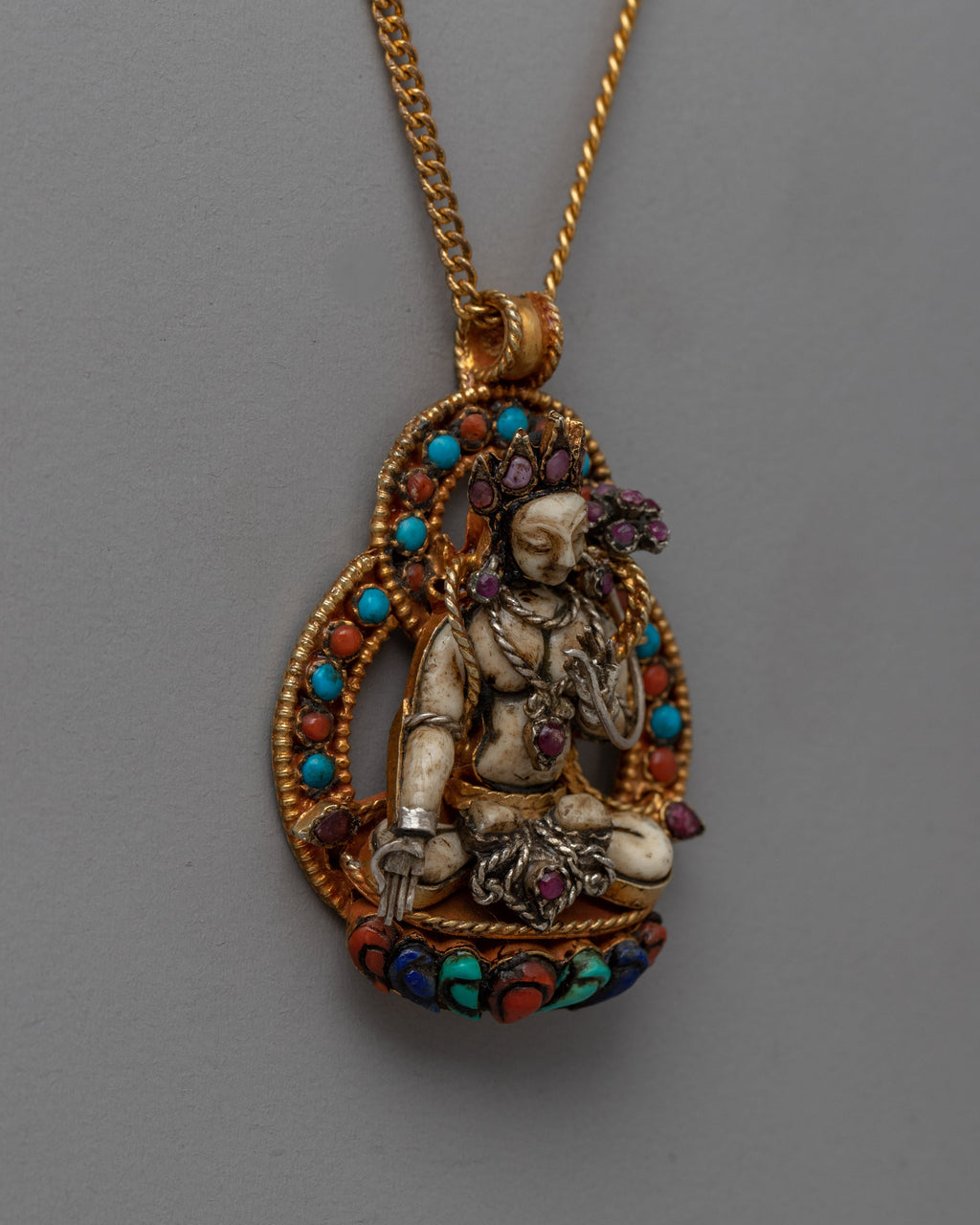 Celebrate White Tara's divine grace and blessings with this gorgeous locket, handcrafted on a gold ginni base and embellished with sacred elements. The beautiful layout includes an inlay of original stones (coral, lapis lazuli, and turquoise), each picked for its distinct spiritual significance. Complementing these vivid stones is a wonderfully detailed conch shell element that represents the Buddha's speech and the propagation of dharma. This locket, measuring 5 cm in height by 3.5 cm in breadth and weighing only 0.020 kilogram, is a little yet meaningful statement of spiritual commitment and creative refinement.