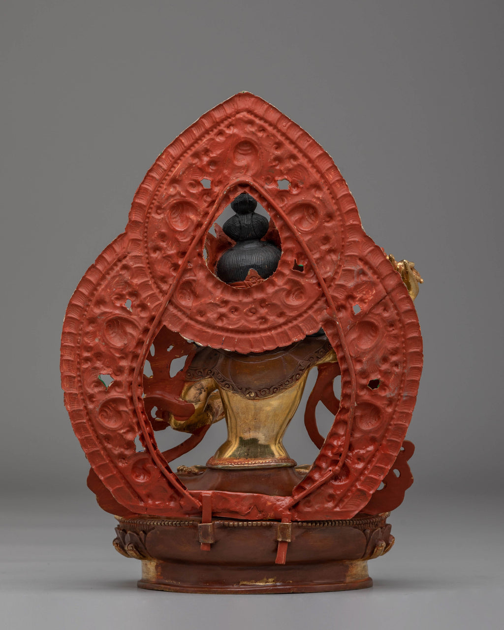 Manjushri is shown holding the flaming sword of wisdom in his right hand, symbolizing the abolition of ignorance, and the Prajnaparamita Sutra in his left hand, representing the embodiment of supreme knowledge. This statue embodies clarity, insight, and intellectual force, making it a meaningful object of devotion and an excellent addition to any location dedicated to wisdom and enlightenment.