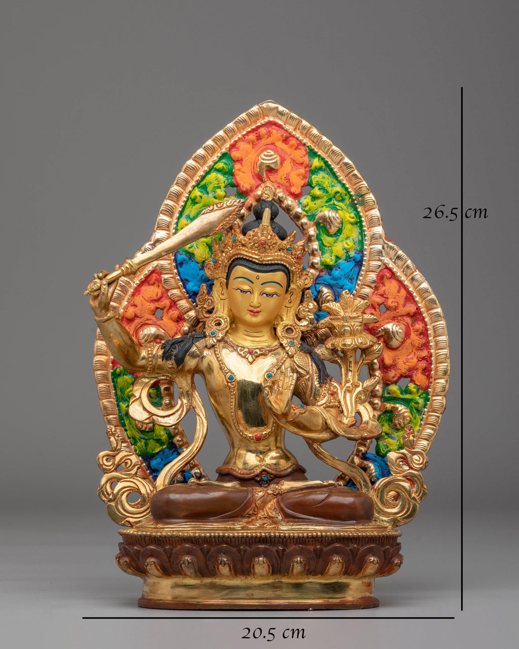 This exquisite Manjushri statue, crafted from copper and adorned with 24K gold plating, represents the Bodhisattva of Wisdom. Standing at 26.5 cm tall and 20.5 cm wide, it is designed to enhance any meditation or altar space. Weighing 1.57 kg, the statue’s substantial presence reflects its divine energy. The gold plating symbolizes spiritual illumination, while the detailed copper body adds depth and warmth, reflecting traditional Himalayan craftsmanship.