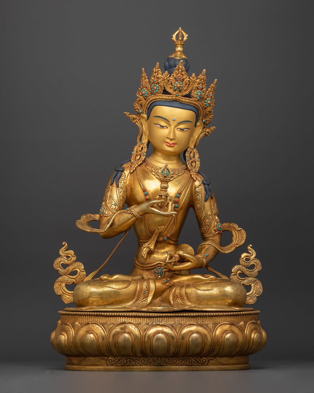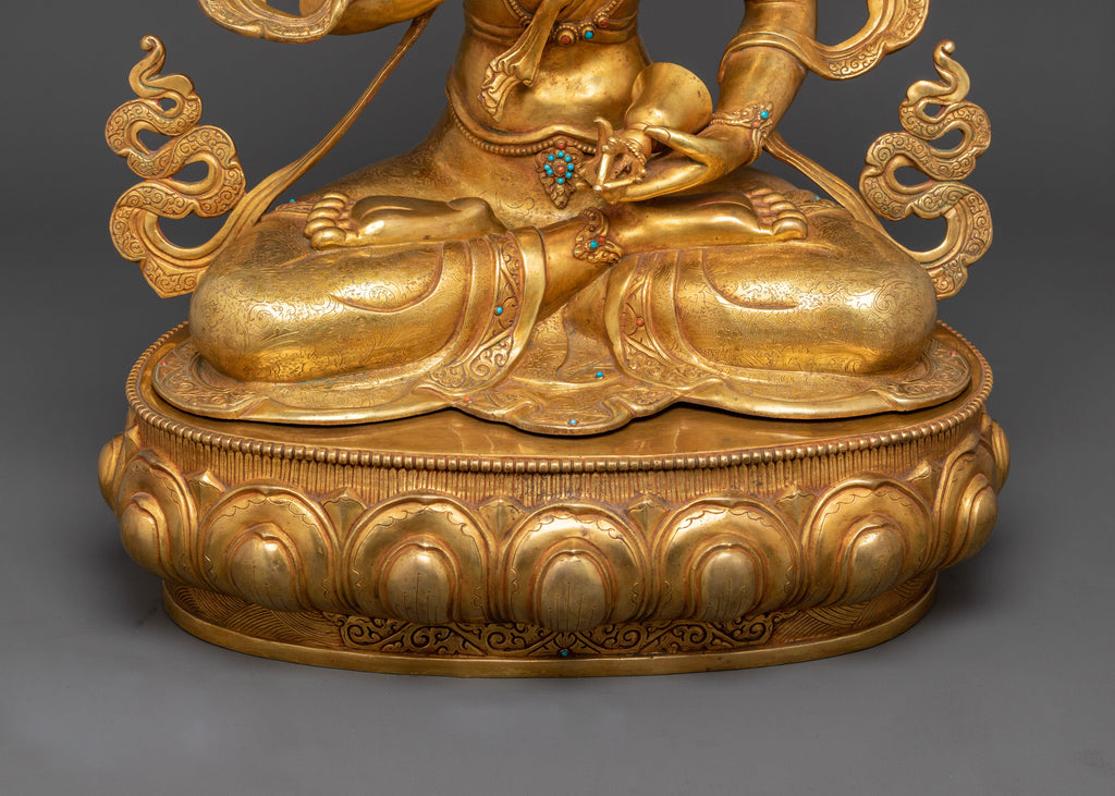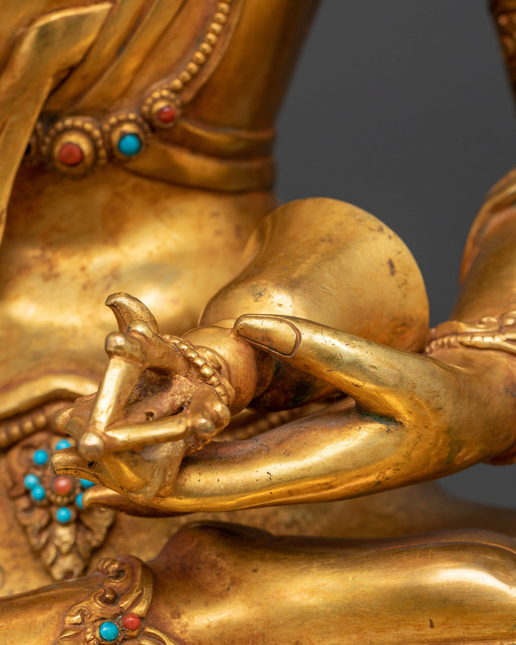 Expert craftspeople in Patan, Nepal—a province known for its superb craftsmanship and spiritual artistry—carefully handcraft this extraordinary sculpture. The statue has a strong copper body that is generously plated in 24K gold, giving it a luminous, heavenly radiance. The detailed aspects of Vajrasattva, such as his tranquil expression, majestic posture, and the symbolic things he holds, which reflect his ultimate spiritual power, are enhanced by the elaborate paintings in gold and acrylic. The statue is further embellished with hand-set gemstones, which give this eye-catching sculpture more depth and brilliant colors.