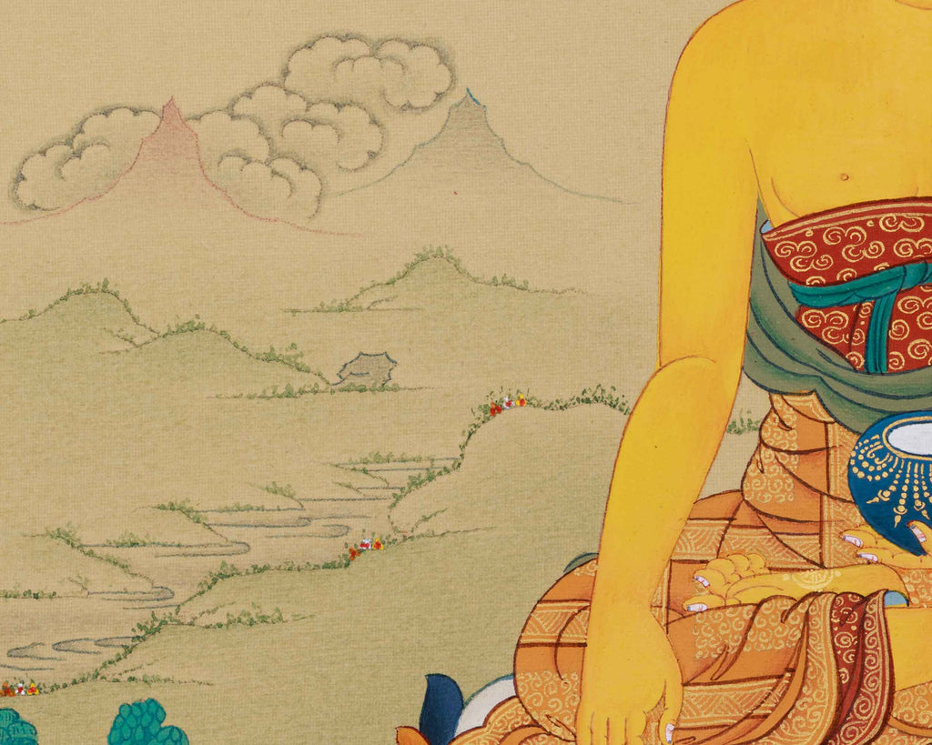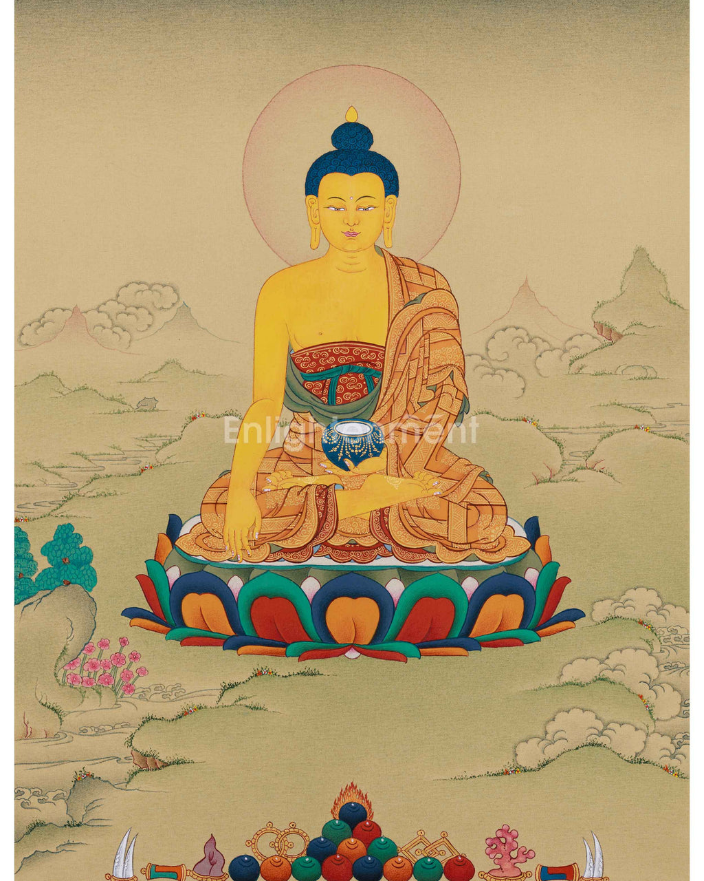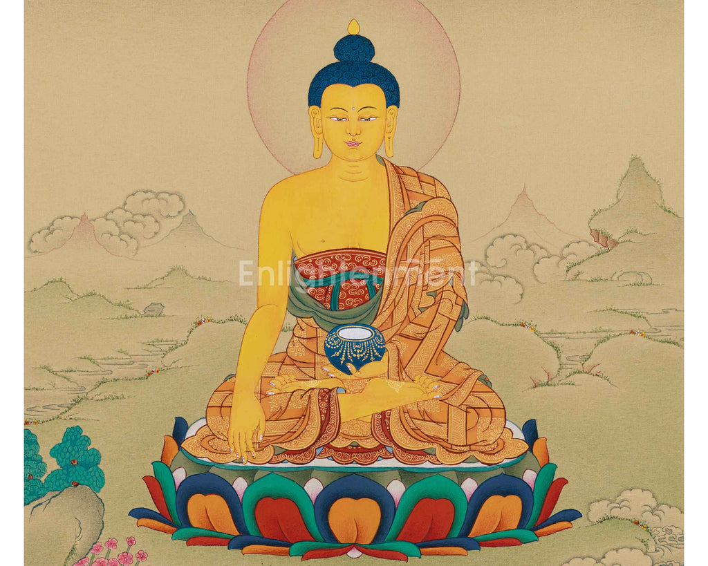 The serene and classic Sage of the Shakya Clan, Shakyamuni Buddha Thangka, is enhanced with 24K gold and hand-painted on exquisite cotton canvas utilizing natural Lhasa stone colors. Gold accents softly highlight sacred features, while mineral hues produce a gentle, earthy luminosity that feels both grounded and brilliant. This thangka, which honors Shakyamuni Buddha as the enlightened teacher who revealed the path to liberation through wisdom, compassion, and conscious awareness, is painted in the elegant Karma Gadri style and holds profound spiritual significance.