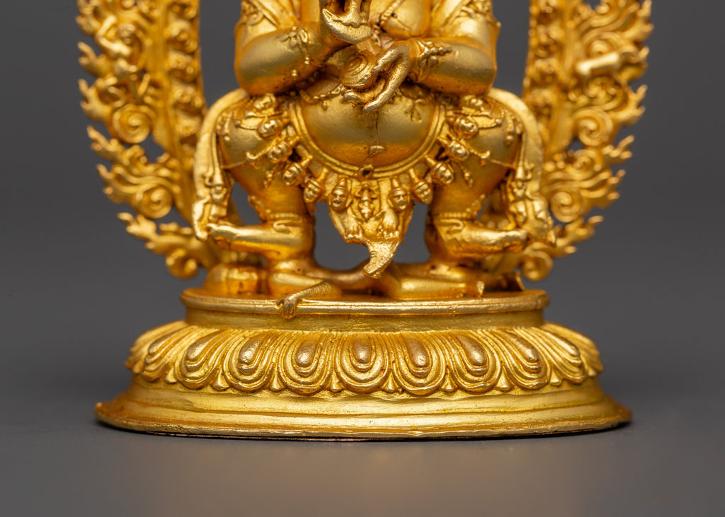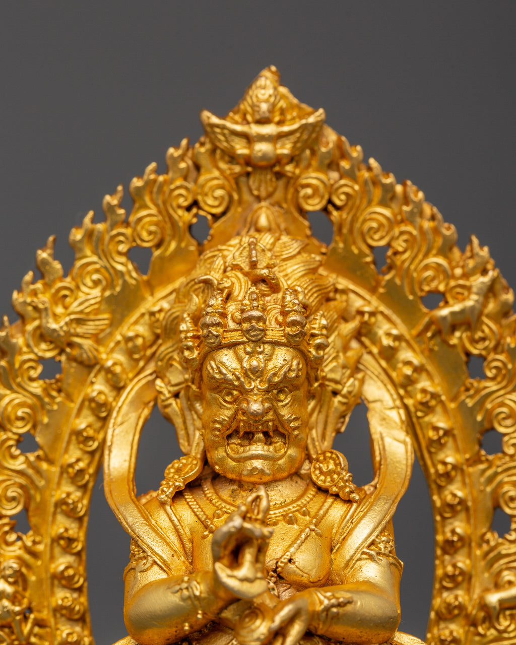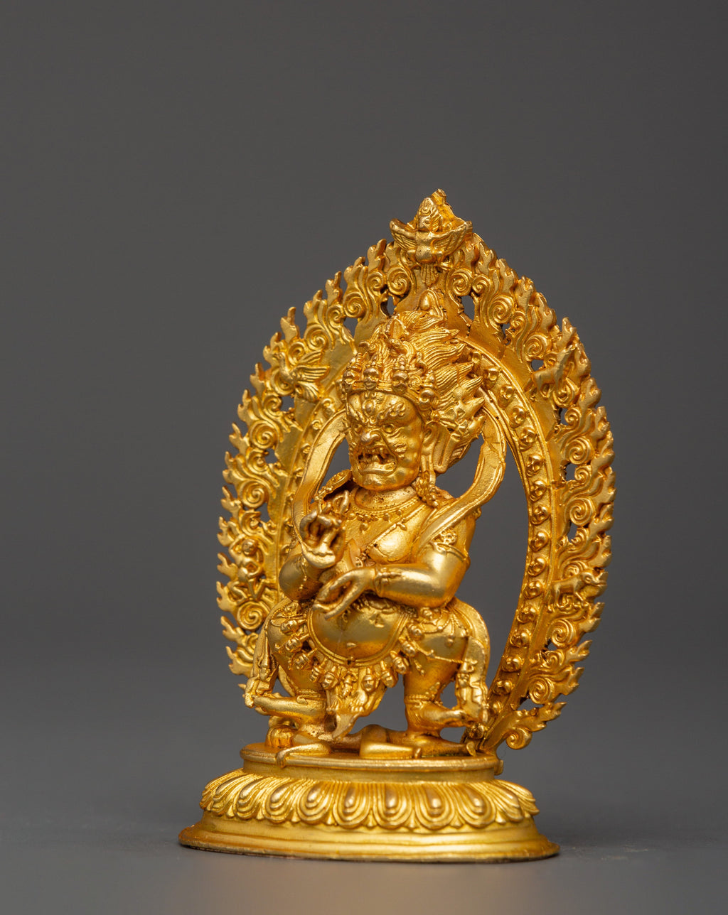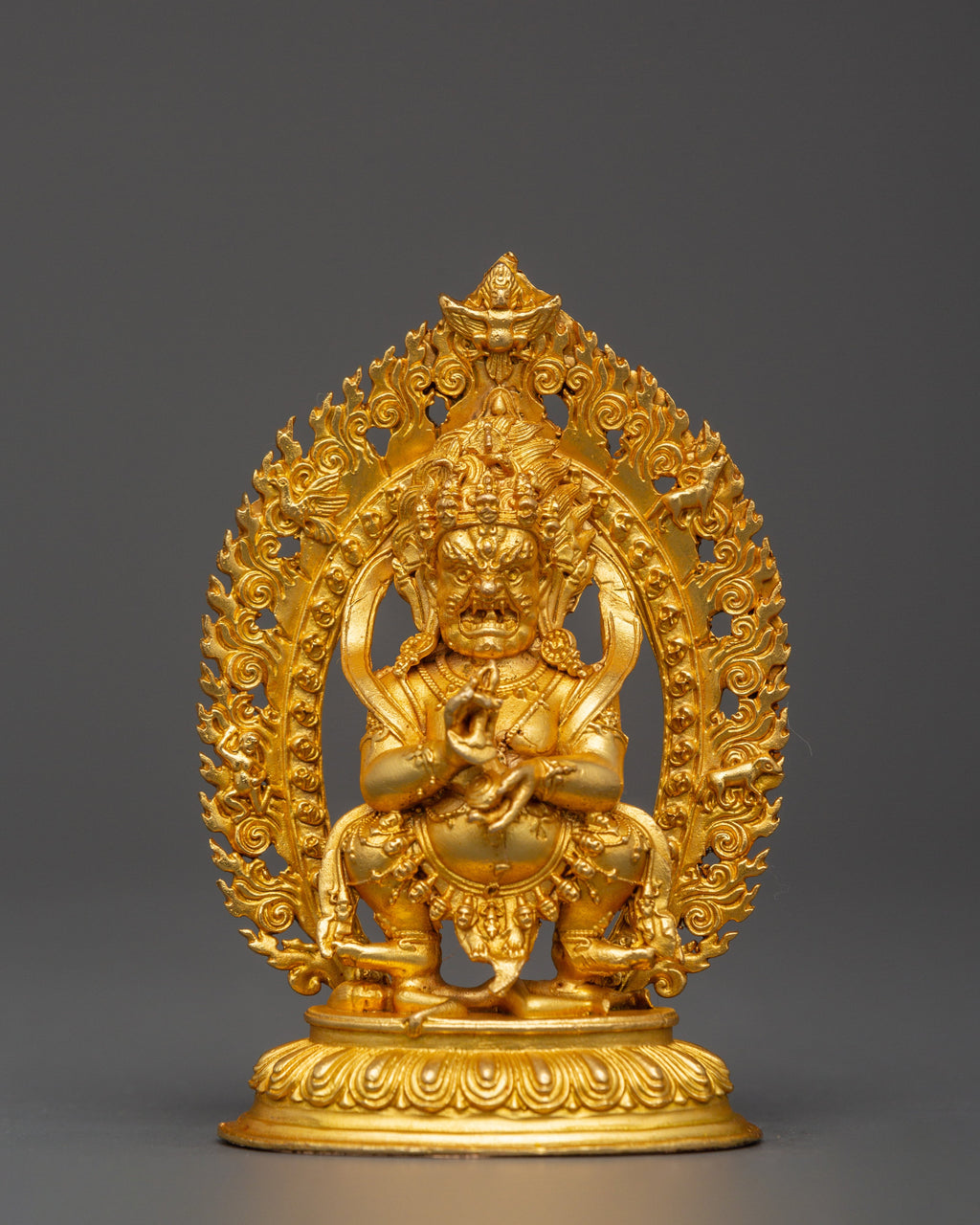 This hand-crafted Shakya Mahakala statue is a potent symbol of protection, wrathful compassion, and fierce defense of spiritual practice. This statue, crafted from copper and plated with gold, measures 9.5cm in height, 6.5cm in width, and weighs 0.17kg, making it suitable for any personal altar or meditation room.