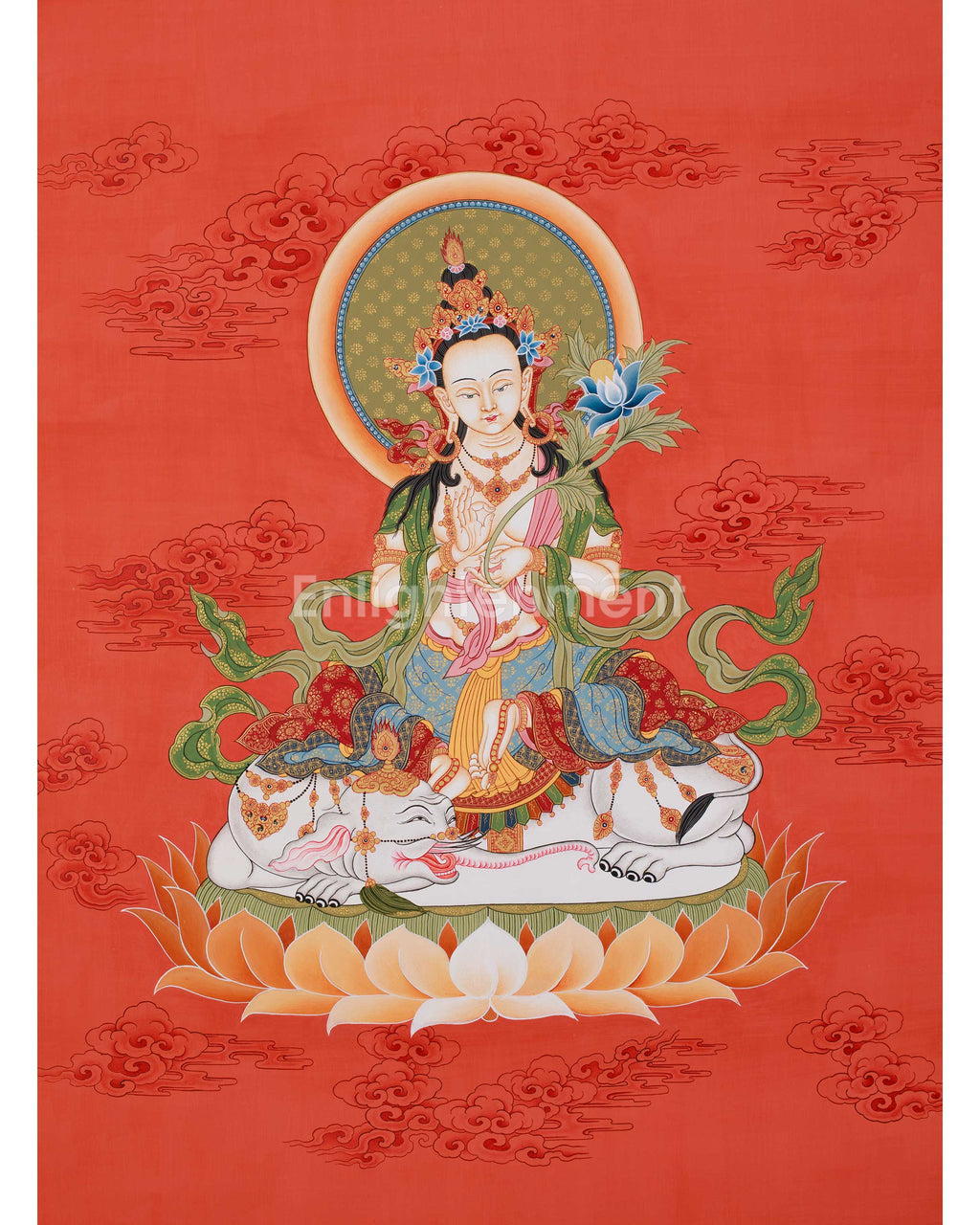 This magnificent Samantabhadra Buddha Thangka is a Tibetan Buddhist artwork representing enlightenment, knowledge, and universal goodness. Samantabhadra, the primordial Buddha, is seated on top of a white elephant, a representation of power, tranquility, and wisdom, upon a lotus base. He symbolizes the ultimate realization of the Dharma and leads practitioners toward spiritual awakening. His position, with his hands in a prayerful mudra, refers to his role as the personification of the highest virtue and compassion. It is carefully painted on cotton canvas in the traditional Tibetan style. Its beauty and spiritual importance are enhanced by the use of genuine 24K gold and acrylic colors.