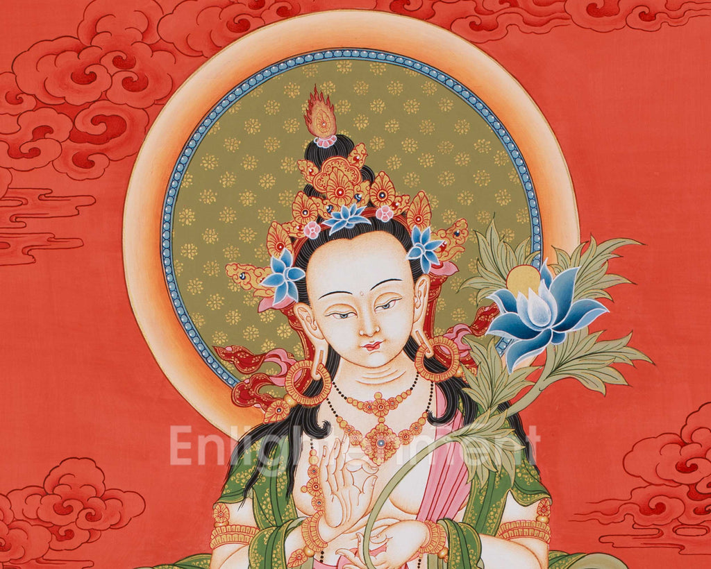 His quiet and gentle glance radiates knowledge and insight. The lavish garments and silk scarf in vivid blues, greens, and reds, embellished with elaborate patterns and golden accents, are exquisite details that perfectly capture his religious essence. The red hues and fluttering clouds in the background give the painting a feeling of comfort and tranquility while emphasizing his heavenly essence and the transcendence of worldly diversions.