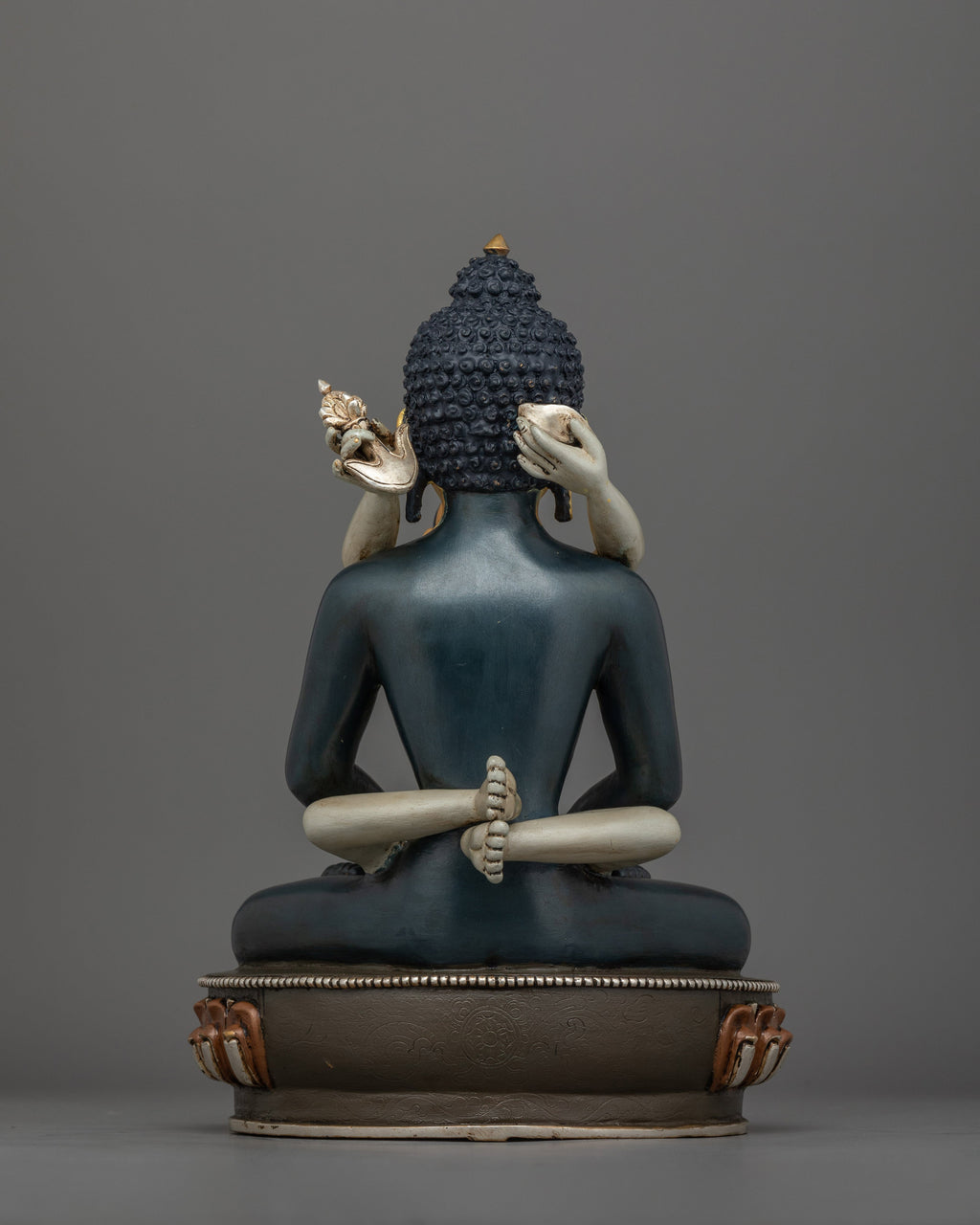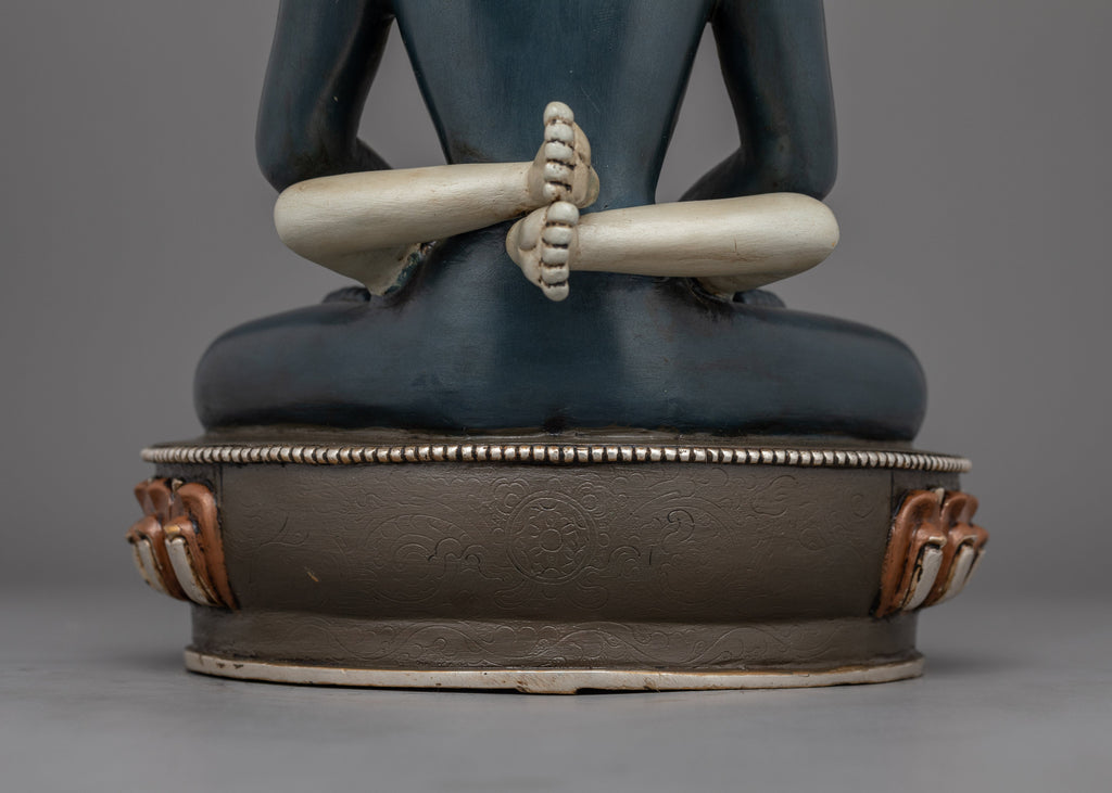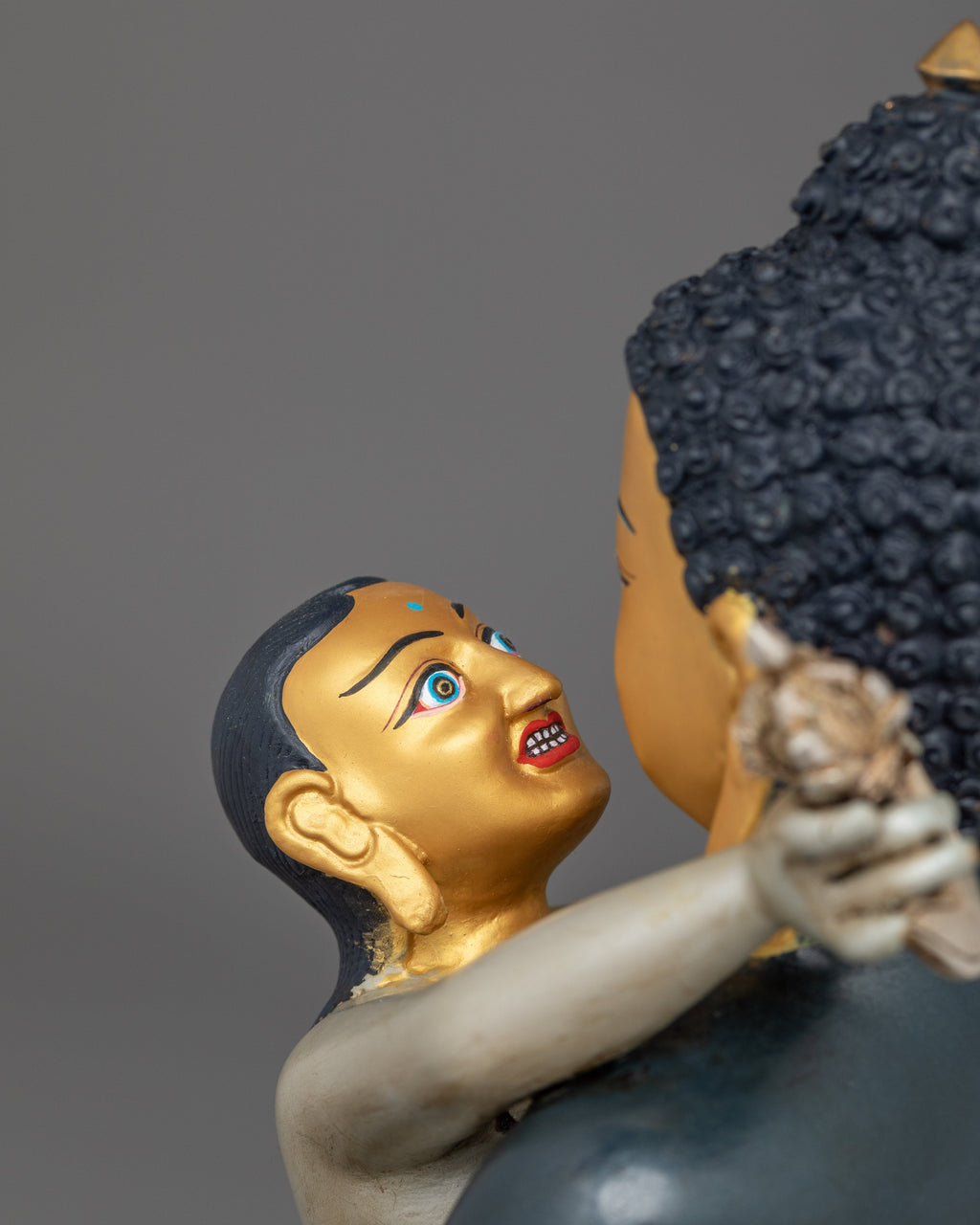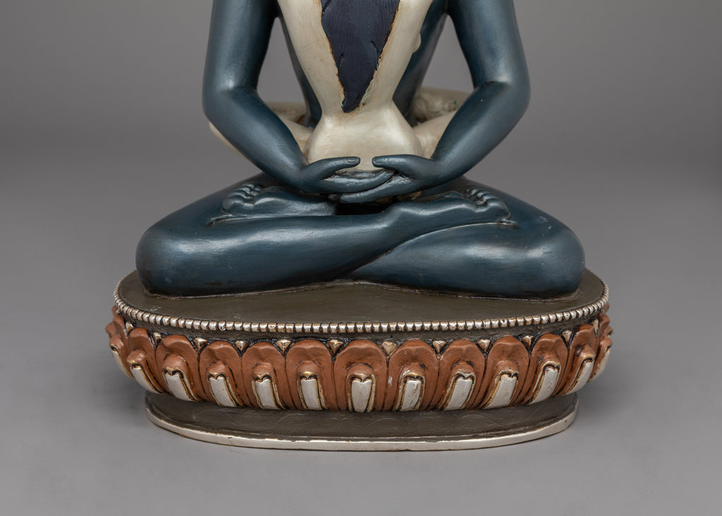 This statue depicts a profound representation of the union of skillful means (upaya) and wisdom (prajna). Samantabhadra represents compassionate action, while Samantabhadri represents the essence of wisdom. Together, they depict the way to ultimate truth and liberation. Their serene expressions demonstrate enlightenment, free of the dualities of existence, while the lotus base on which they sit represents purity and transcendence. This religious sculpture is ideal for personal altars, meditation spaces, or spiritual collections, establishing a profound sense of peace and enlightenment in any environment.