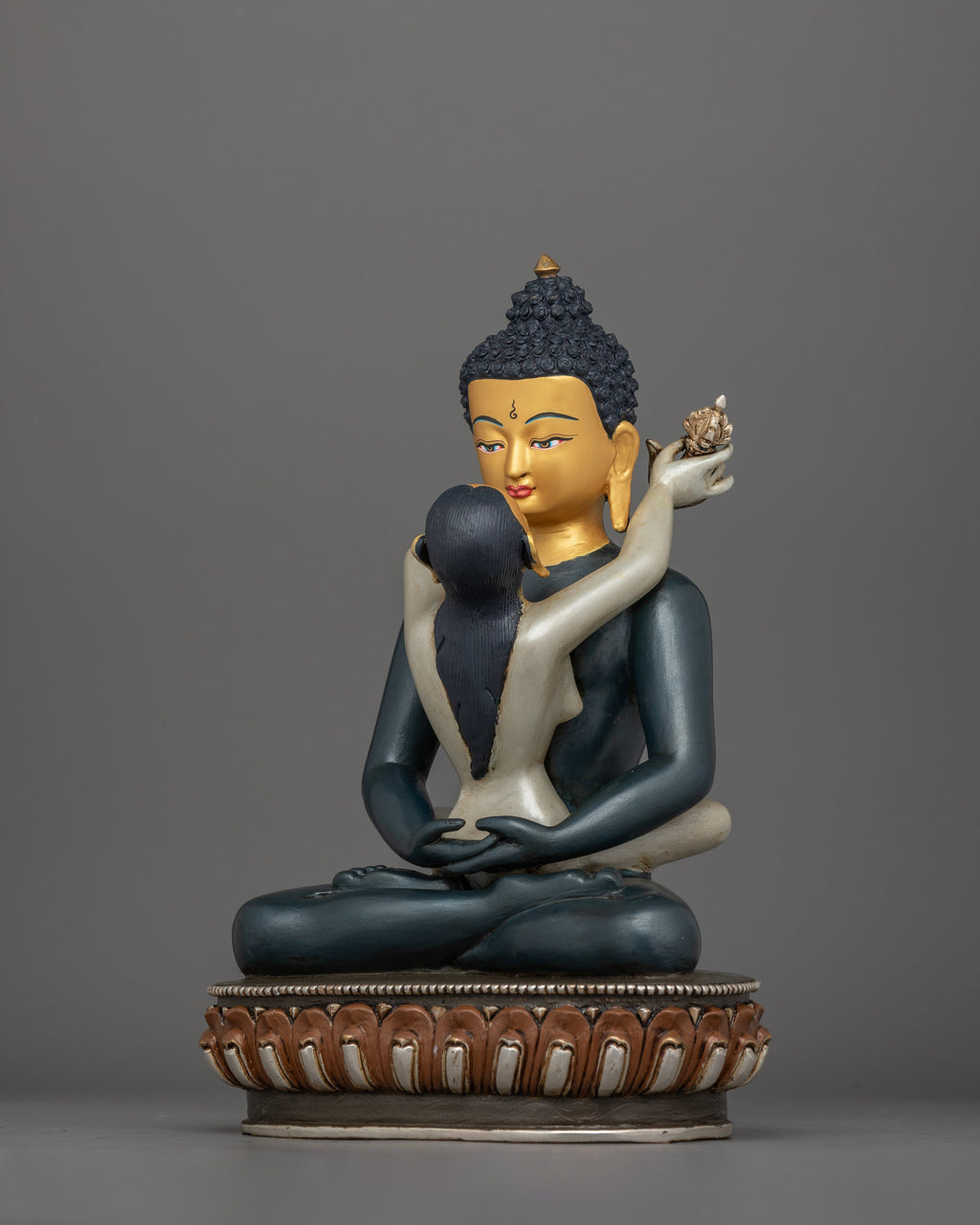 The Samantabhadra with Consort Sacred Buddhist Art sculpture is a profound representation of unity and enlightenment. The intricate gold and acrylic paintings highlight every detail of the Samantabhadra's serene expression and is made of 24K gold gilded copper body. This statue, measuring 11.6"/29.5cm in height and 7.9"/20cm at the base, weighs 4.10 kg and exemplifies the extraordinary creativity of Buddhist craftsmanship. This sacred art piece exudes tranquility and spiritual clarity, making it a perfect focal point for meditation, ritual practice, or a shrine dedicated to the attainment of universal awareness and enlightenment.