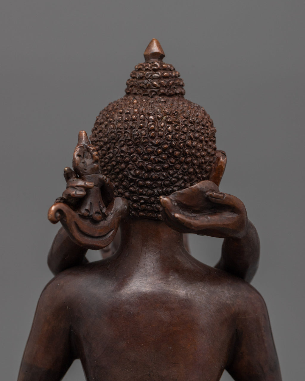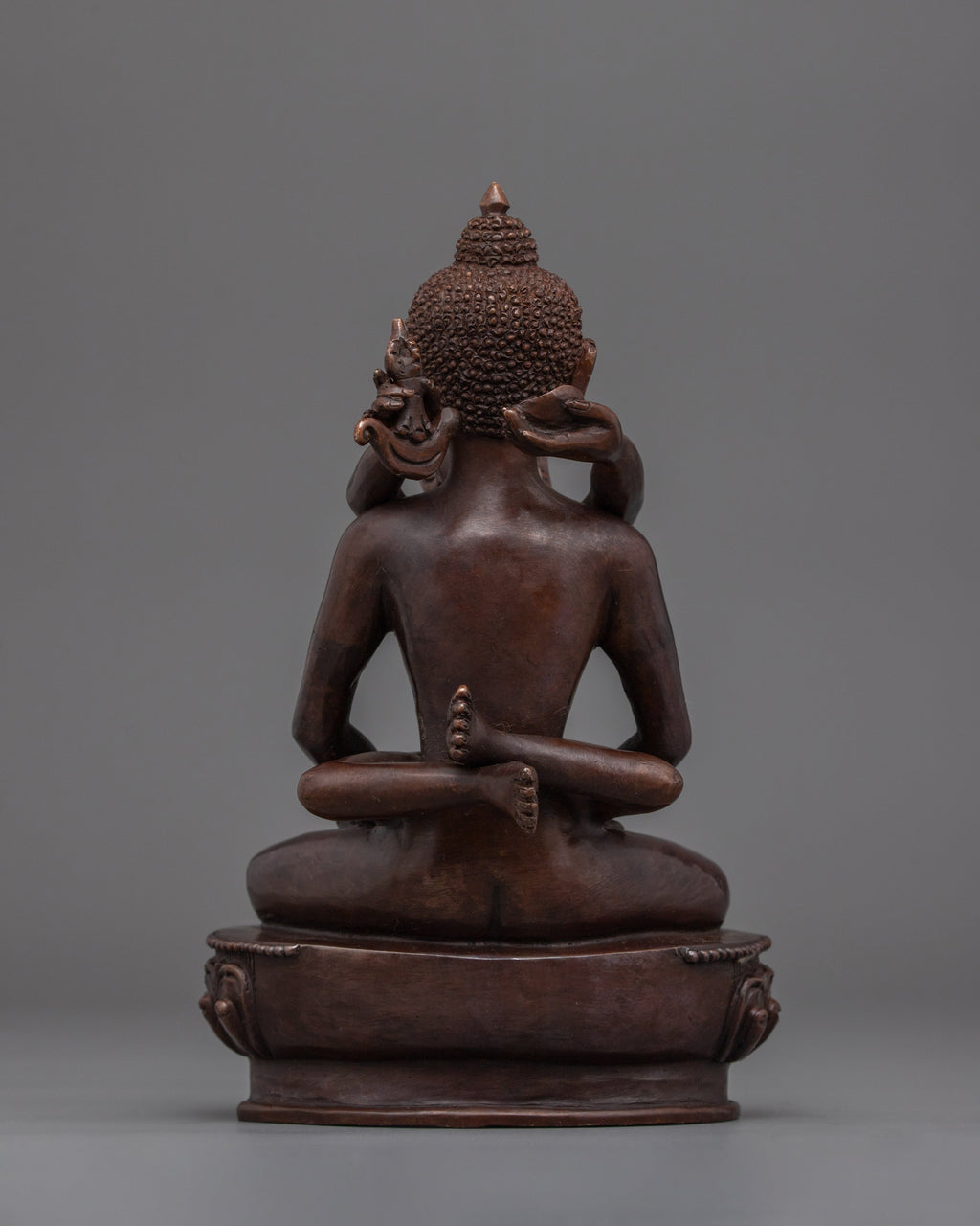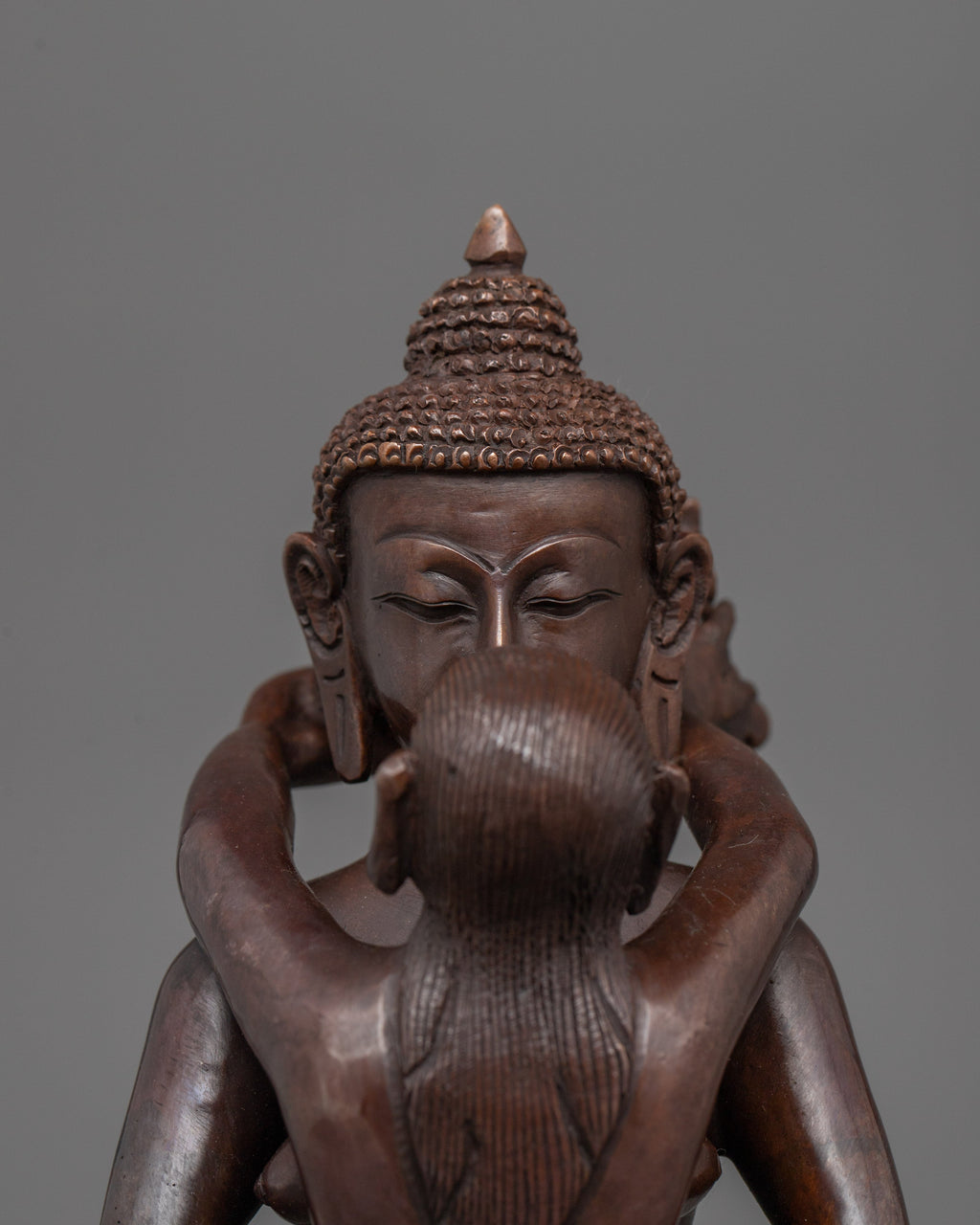 The Samantabhadra Yab Yum Sacred Art Figurine represents unity and harmony in Buddhist symbolism. Crafted with an oxidized copper body, this statue portrays the essence of Samantabhadra, the embodiment of wisdom and enlightenment, in a dynamic embrace with his consort, reflecting the perfect balance of wisdom and compassion. This item weighs 1.65 kg and is 8.3"/21cm in height and 5.1"/13cm at the base, making it ideal for any sacred space.
