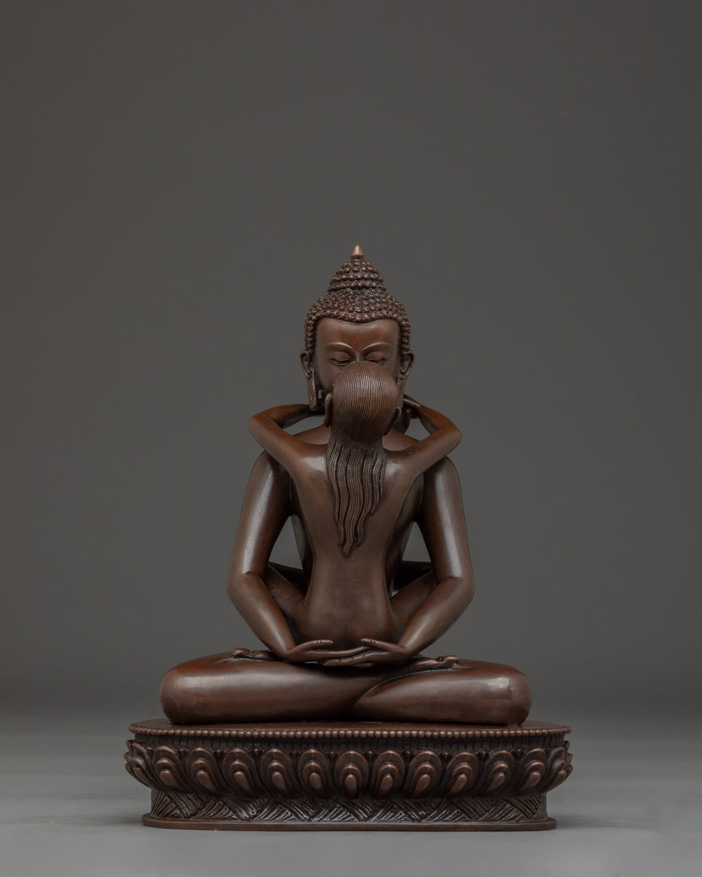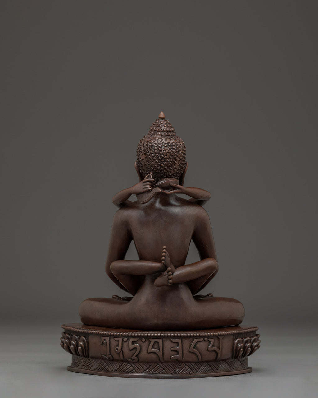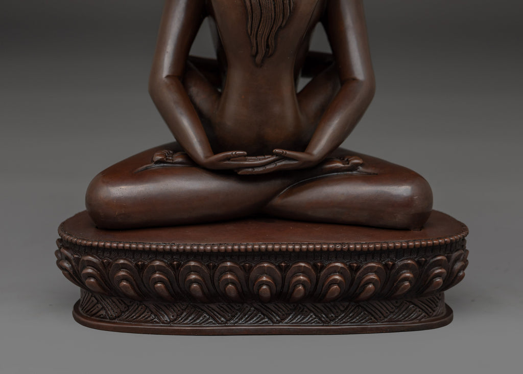 Samanthabhadra with consort Statue measuring 8.5” (21.5 cm) in height with a 6.7” (17 cm) base and weighing 1.84 kg, is intricately handcrafted from oxidized copper. Depicted in the yab-yum posture with his consort Samantabhadri, this statue symbolizes the union of primordial awareness and emptiness—the essence of the Dzogchen teachings in the Nyingma tradition of Tibetan Buddhism. Ideal for meditation spaces or sacred displays, this statue serves as a powerful representation of non-dual wisdom and the enlightened state beyond form.