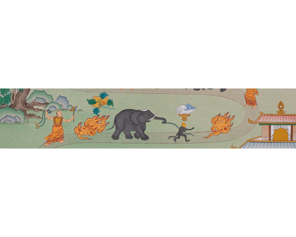 The Samatha Meditation Thangka beautifully illustrates the path to mental clarity and tranquility during meditation. Created on cotton canvas with earthy stone colors and genuine 24K gold, it features the revered Karma Gadri technique. Samatha Meditation is a key practice in Buddhism that emphasizes achieving mental calmness and focus. This Thangka depicts a meditator beginning with a restless mind, symbolized by elephants and monkeys, and progressing toward profound tranquility and control over thoughts. The visuals showcase the gradual journey of soothing the mind and sharpening attention on the present, which is essential in Samatha meditation.