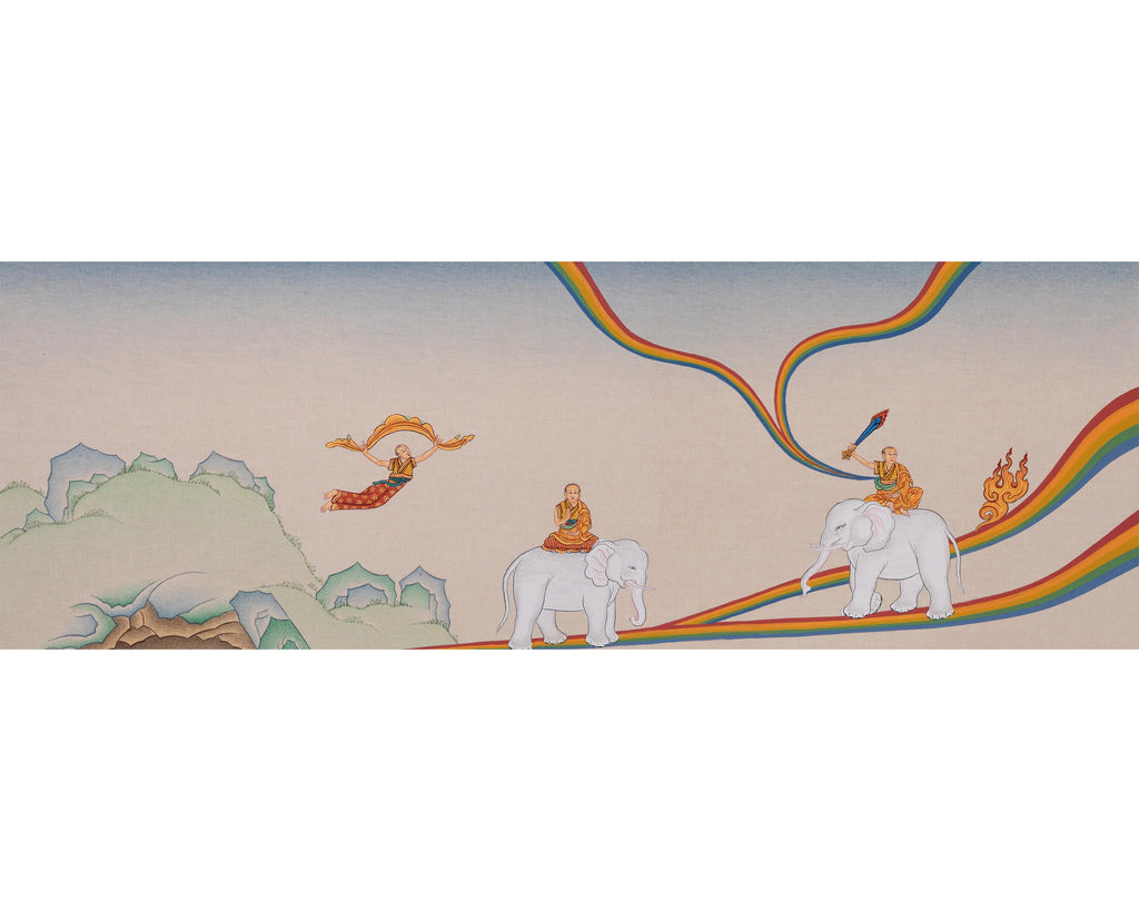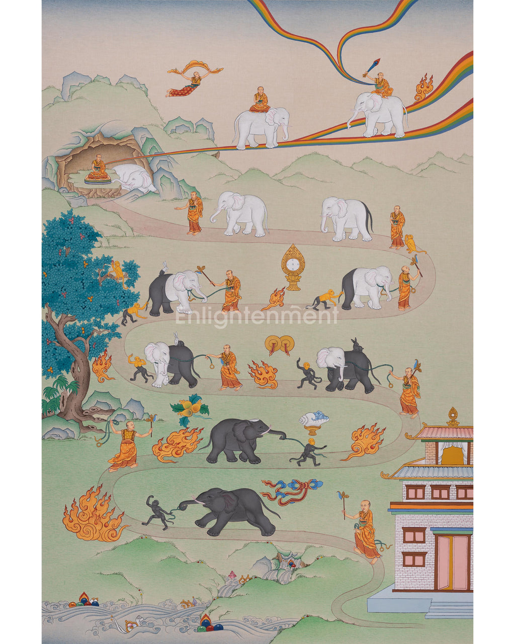 Attainment of Shamatha: The monk rides the elephant across the rainbow, symbolizing the mental bliss of mastering Samatha meditation.