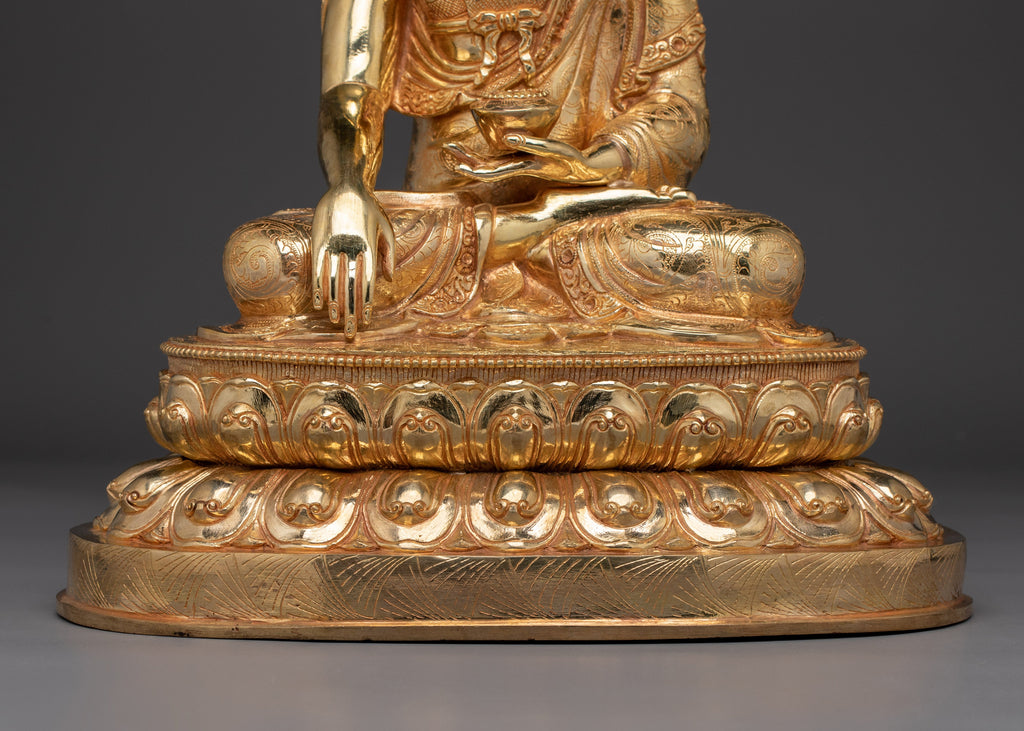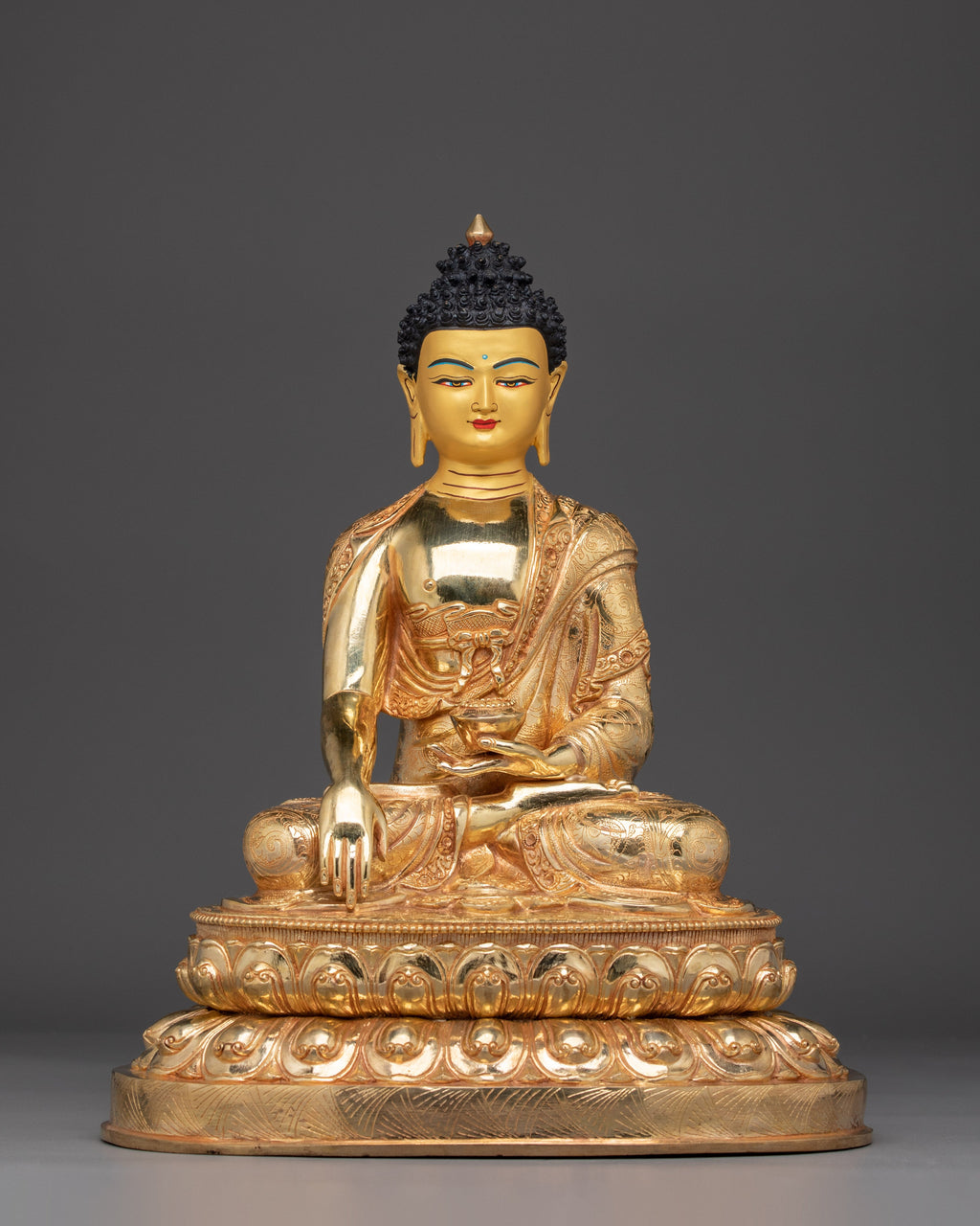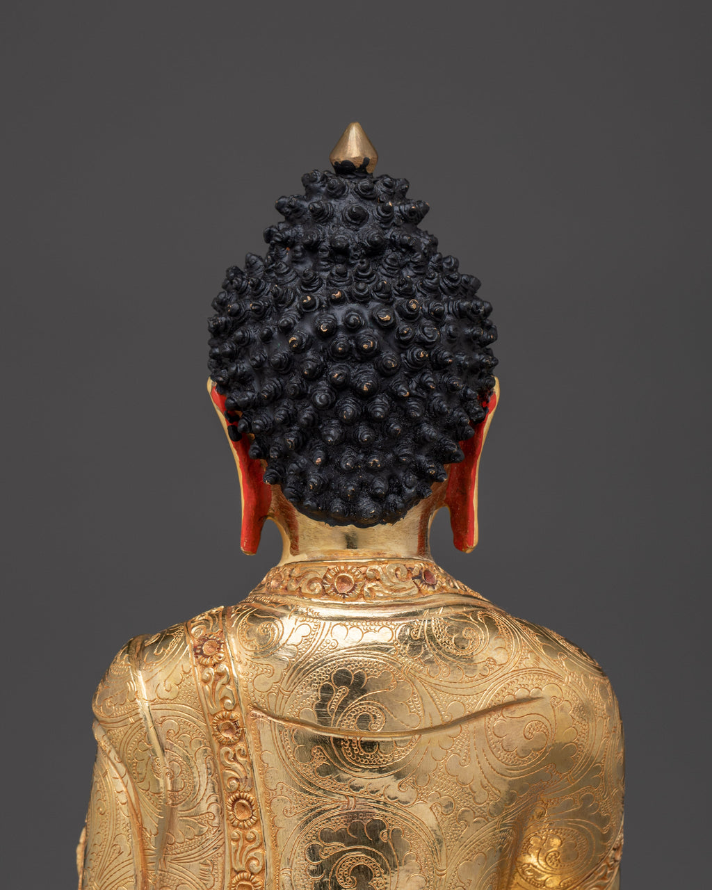 Shakyamuni Buddha is depicted sitting in the lotus pose (padmasana), indicating his steady concentration and mastery over the distractions of the material world. His right hand stretched toward the earth in the bhumisparsha mudra, representing his moment of enlightenment, as he invited the earth to witness his awakening. The left hand, lying gently in his lap in dhyana mudra holding an alms bowl, depicts the profound state of meditation and mindfulness that leads to insight and clarity.