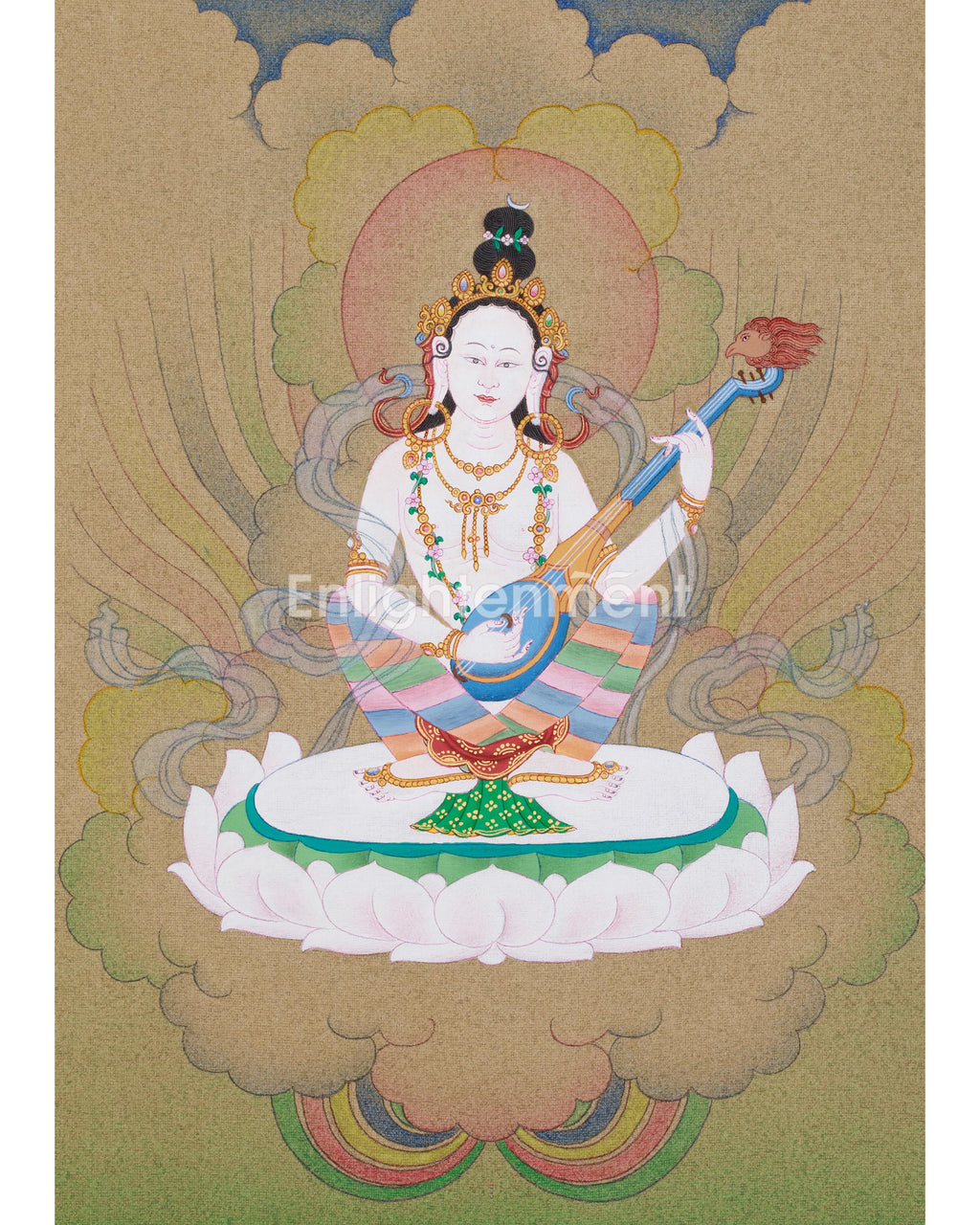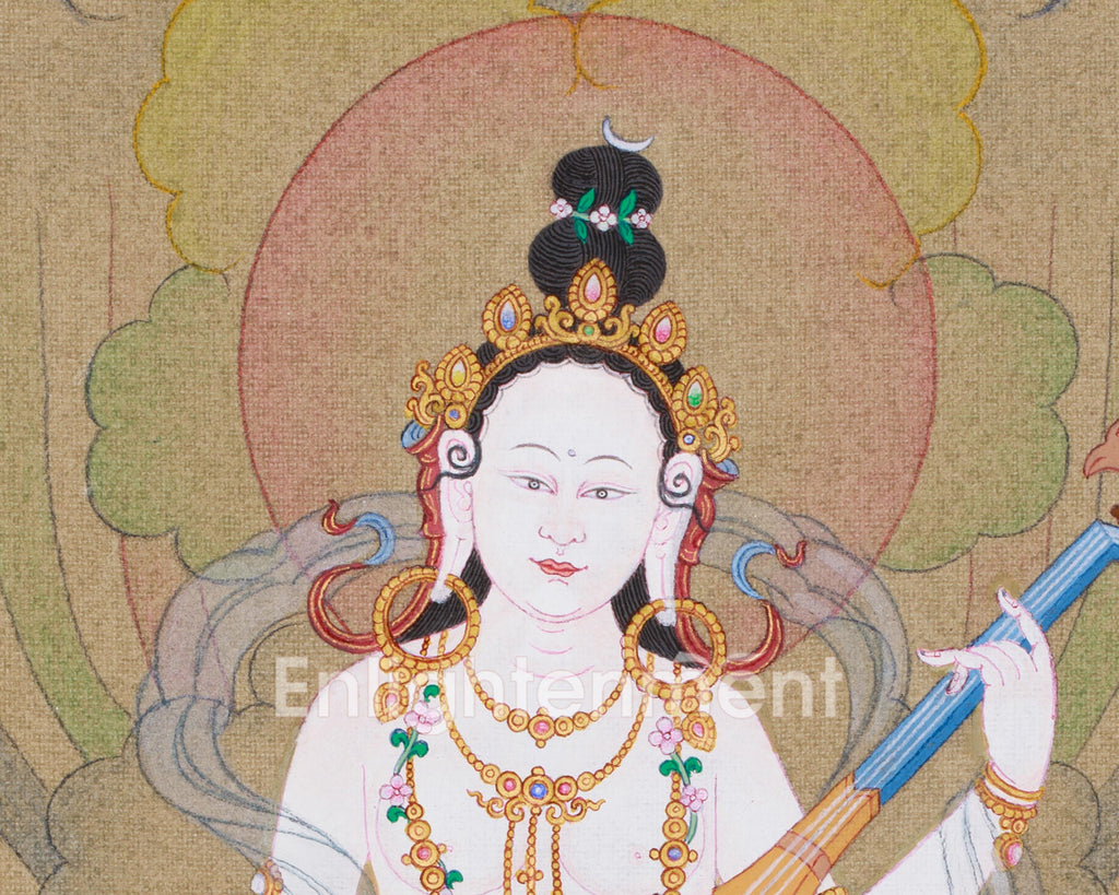 Original Saraswati Thangka | Hand-Painted Tibetan and Hindu Artwork | Divine Goddess of Knowledge and Creativity