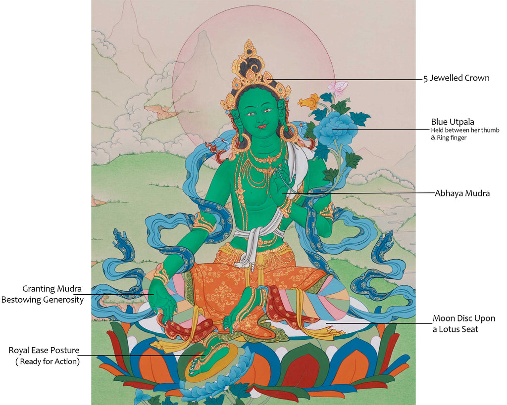 Green Tara is celebrated for her swift response and profound compassion, symbolizing mercy and offering protection against various challenges. In this thangka, she is shown seated on a lotus, representing spiritual purity and enlightenment. Her right leg is stretched out, demonstrating her ability to respond to prayers and offer protection. She holds a blue utpala in her left hand, and her right hand is in a granting mudra, indicating the act of bestowing generosity. The lotus also signifies the purity of her teachings, while the detailed gold accents reflect her compassionate nature. Her tranquil and kind demeanor emphasizes the vital role of compassion and mercy on the spiritual journey.