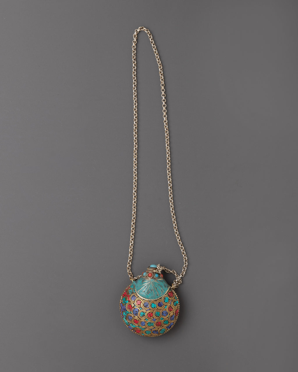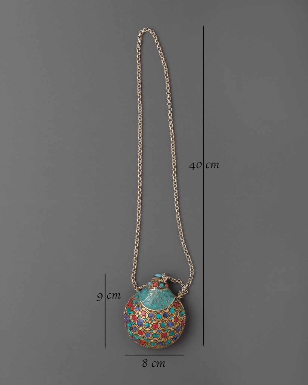 This handmade piece is crafted from white metal and features artificial stones. The bottle measures 9cm tall, making it a delicate yet significant piece to wear. The 40cm chain gives a vintage touch, heightening the traditional impression. Whether worn during meditation or as a conversation starter, this Tibetan Snuff Bottle Necklace connects you to Tibetan spiritual traditions, which believe in the healing effects of these stones.