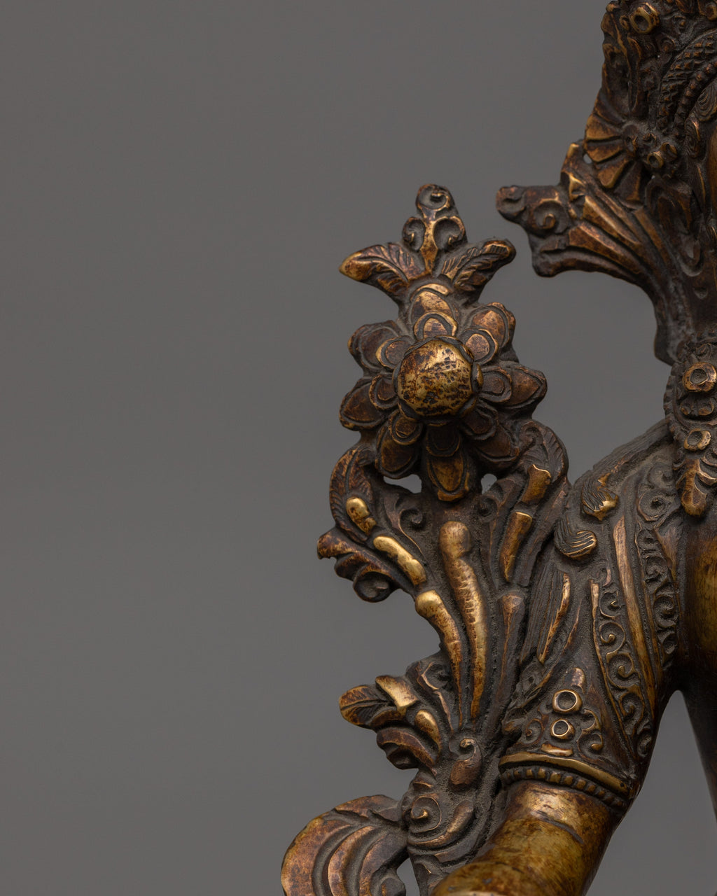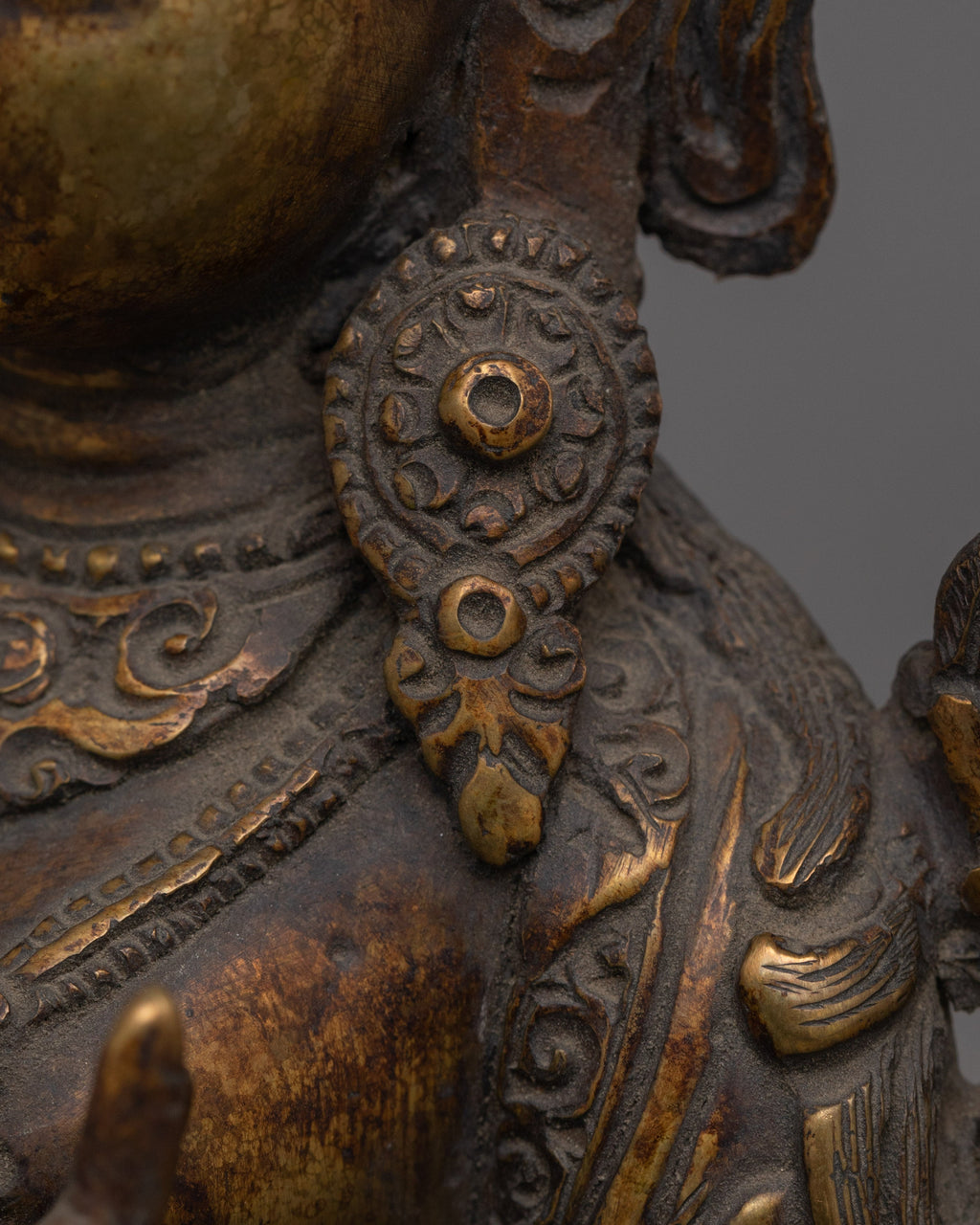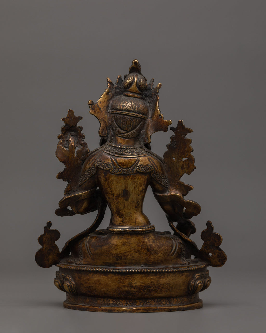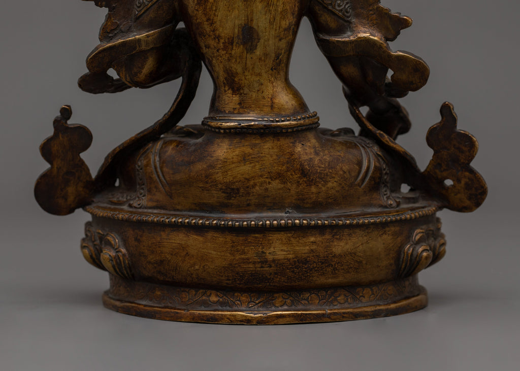 The Sculpture of Buddhist Deity White Tara, measuring 9.4 inches (24 cm) in height and 7.5 inches (19 cm) at the base and weighing 1.85 kg, is crafted from an oxidized copper body with an antique finish. Designed by talented Nepalese artisans, this detailed sculpture is ideal for altars, meditation areas, or as a meaningful decor item for individuals seeking awareness in their daily life.