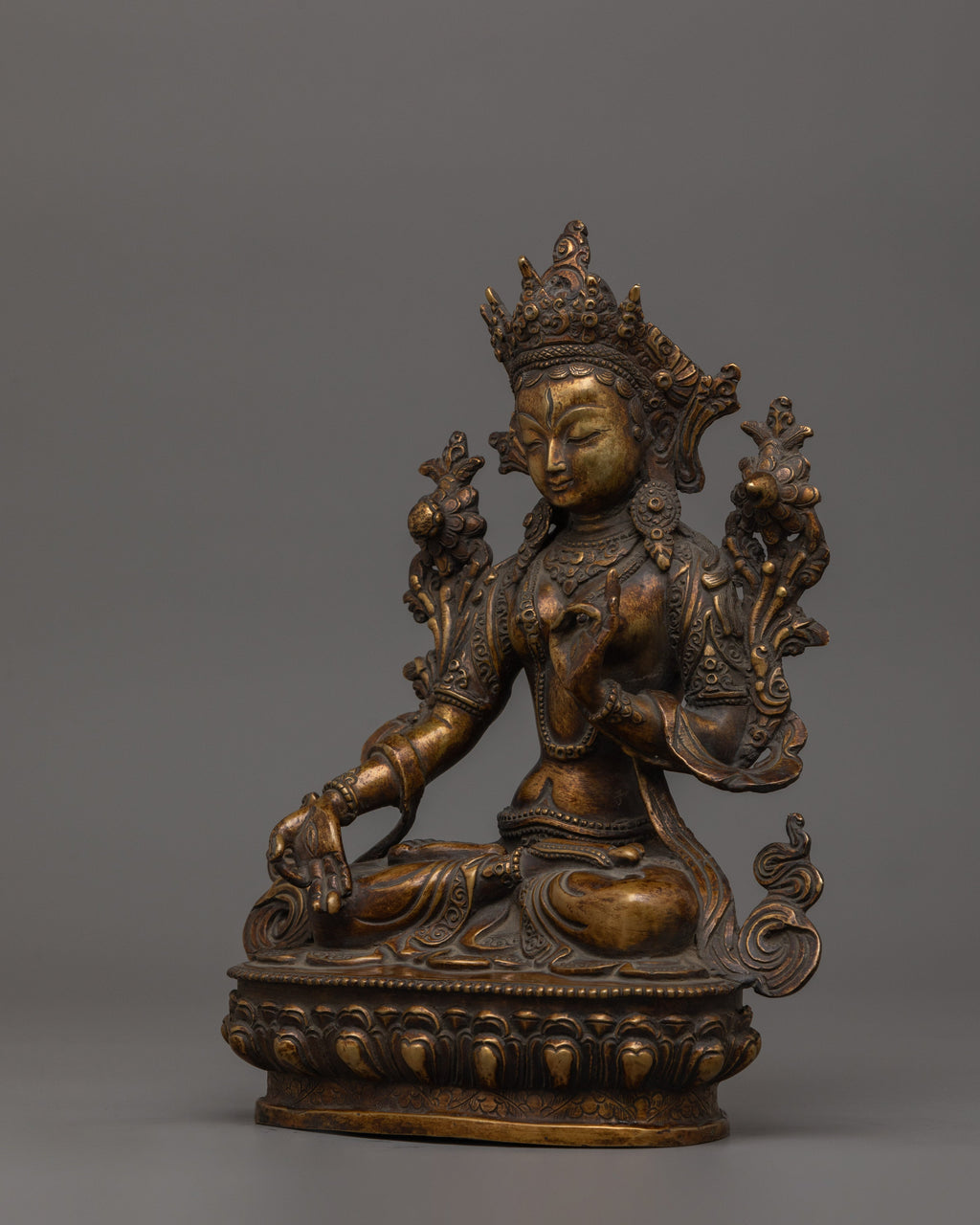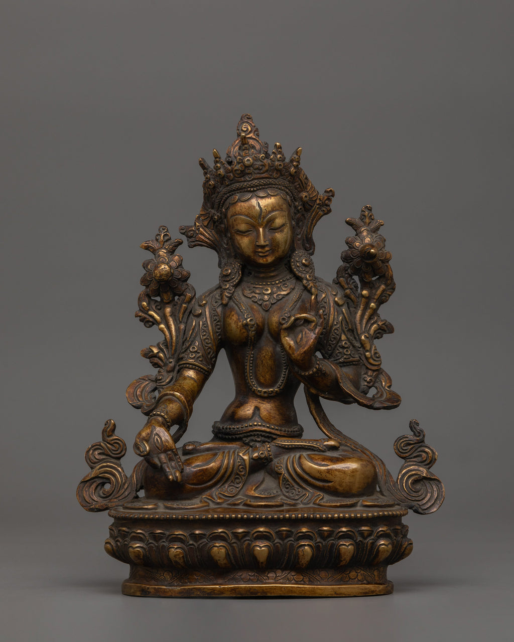 Handmade Sculpture of Buddhist Deity White Tara with Oxidized Copper Body and Antique Finish
