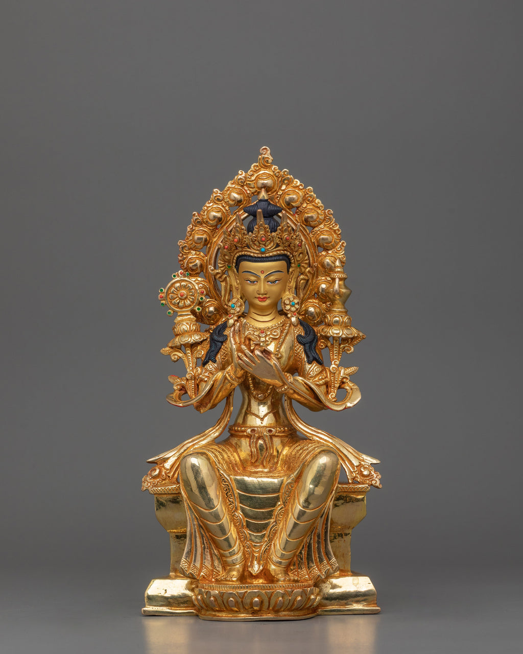 The Sculpture of Future Buddha Maitreya stands at 11.2”/28.5 cm in height with a 5.9”/15 cm base and weighs 2.52 kg. This statue represents Maitreya, the Future Buddha, who is prophesied to appear in a future era to renew the Dharma and lead beings toward enlightenment. The statue is gilded with 24K gold, gold, and acrylic paintings and copper body and adorned with gemstones. Designed by talented Nepalese artisans, this detailed sculpture is ideal for altars, meditation areas, or as a meaningful decor item for individuals seeking awareness in their daily life.