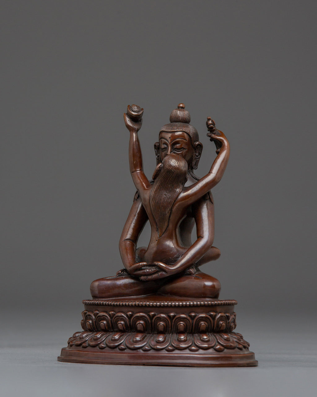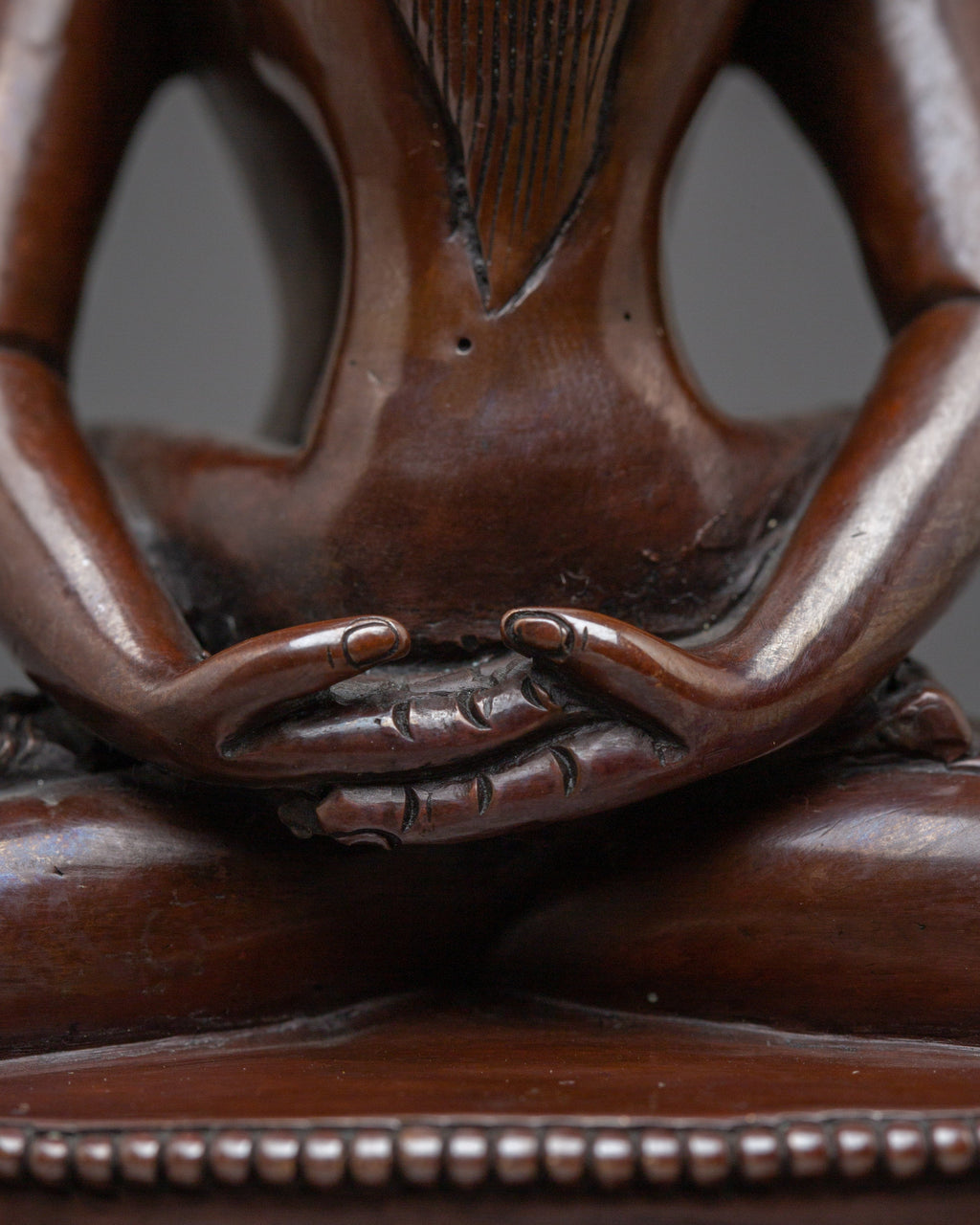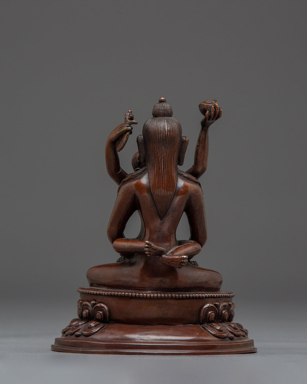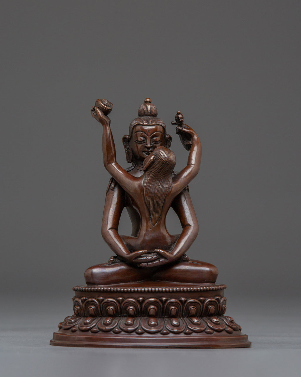 The sculpture of Samanthabhadra with Consort measures 5.5”/14cm in height and 4.3”/11cm at the base and weighs 0.73 kg. It is skillfully handcrafted from an oxidized copper body and depicts the union of ultimate wisdom and compassion in its purest, formless state. Revered in Tibetan Buddhism as the primordial Buddha in eternal embrace with his consort, this statue symbolizes the non-dual nature of reality and is a powerful addition to any meditation or sacred space.