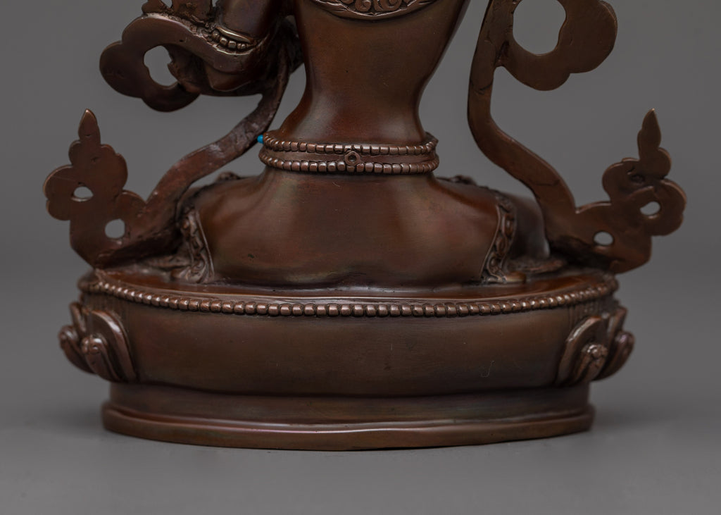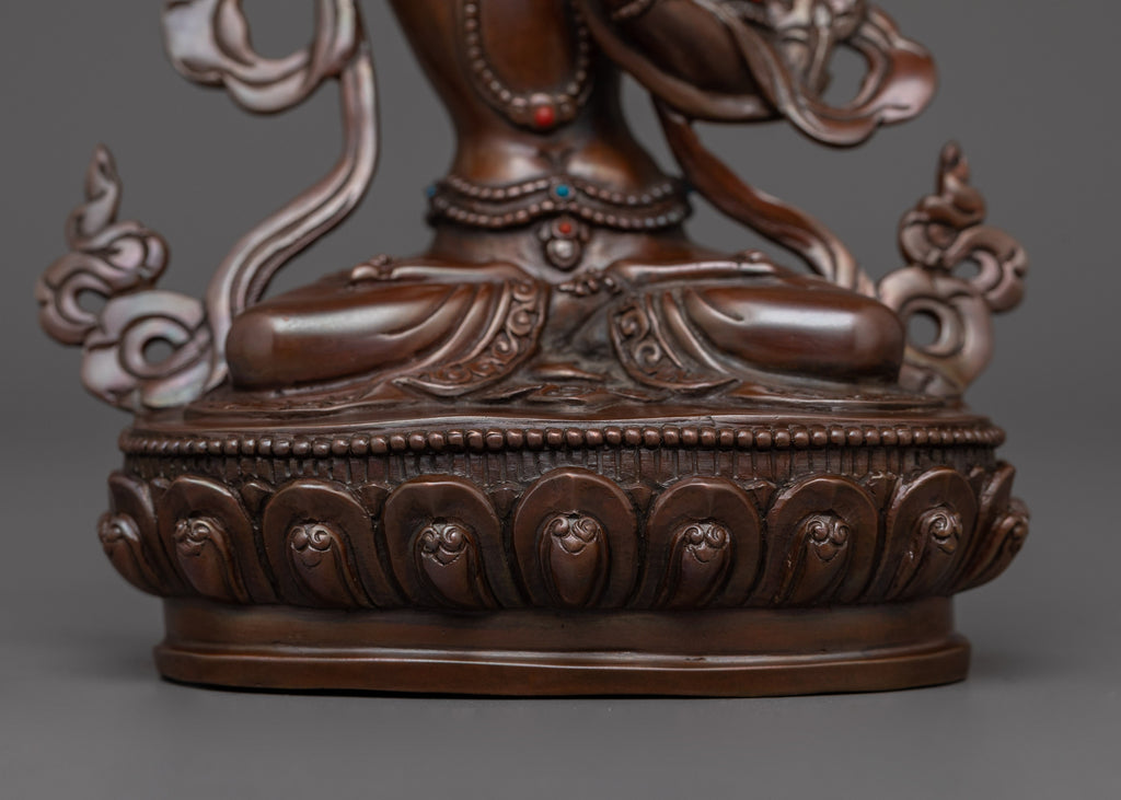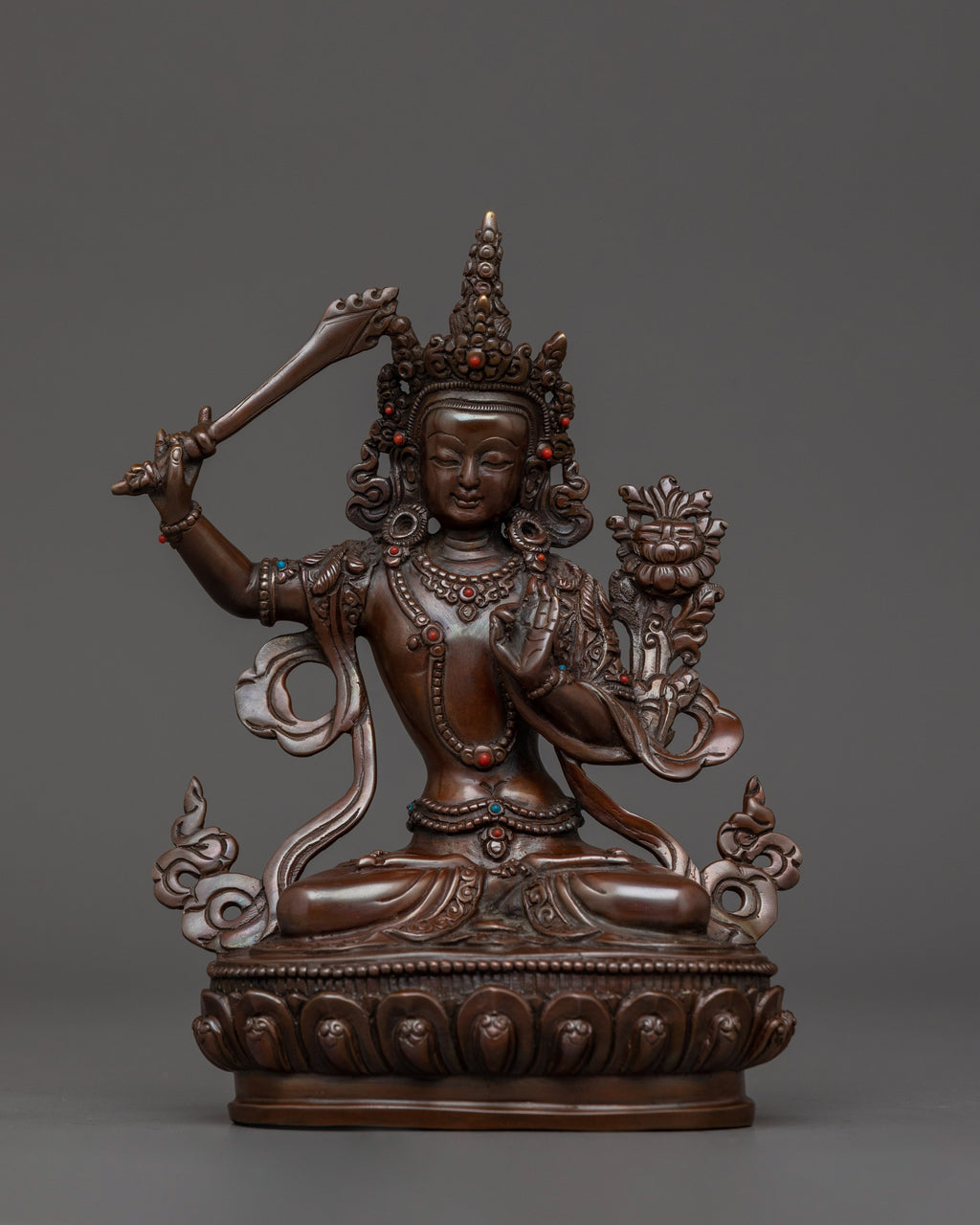 The Sculpture of Tibetan Buddhist Manjushri stands at 6.3 inches (16 cm) in height and has a base of 4.5 inches (11.5 cm). Weighing 0.65 kg, it is made from oxidized copper, which gives the statue an ancient, timeless appearance. The figure's body is adorned with exquisite gemstones, enhancing its spiritual beauty and significance. The design captures the essence of Manjushri, the Bodhisattva of Wisdom, symbolizing clarity and insight. This piece is a stunning decorative item and a powerful representation of wisdom and enlightenment in Buddhist art.