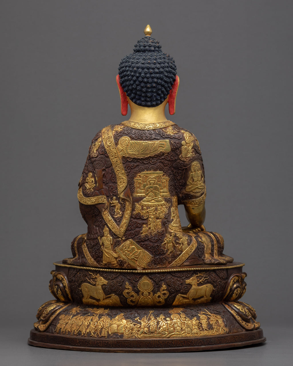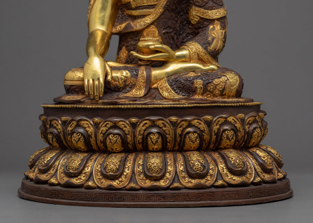 This Seated Buddha Shakyamuni Sculpture was crafted exclusively by the most skilled craftsmen of Nepal to depict the brilliance of Lord Buddha. The statue was carved with the finest of materials, carved from a copper body and gilded with 24k genuine gold. The statue has been depicted seated atop a moon disc lotus as he is wrapped with kasaya robes over his body. The intricate design carved on the lotus flower and robes represents the stages of the buddhas life. The statue took months of hard work and dedication to complete.