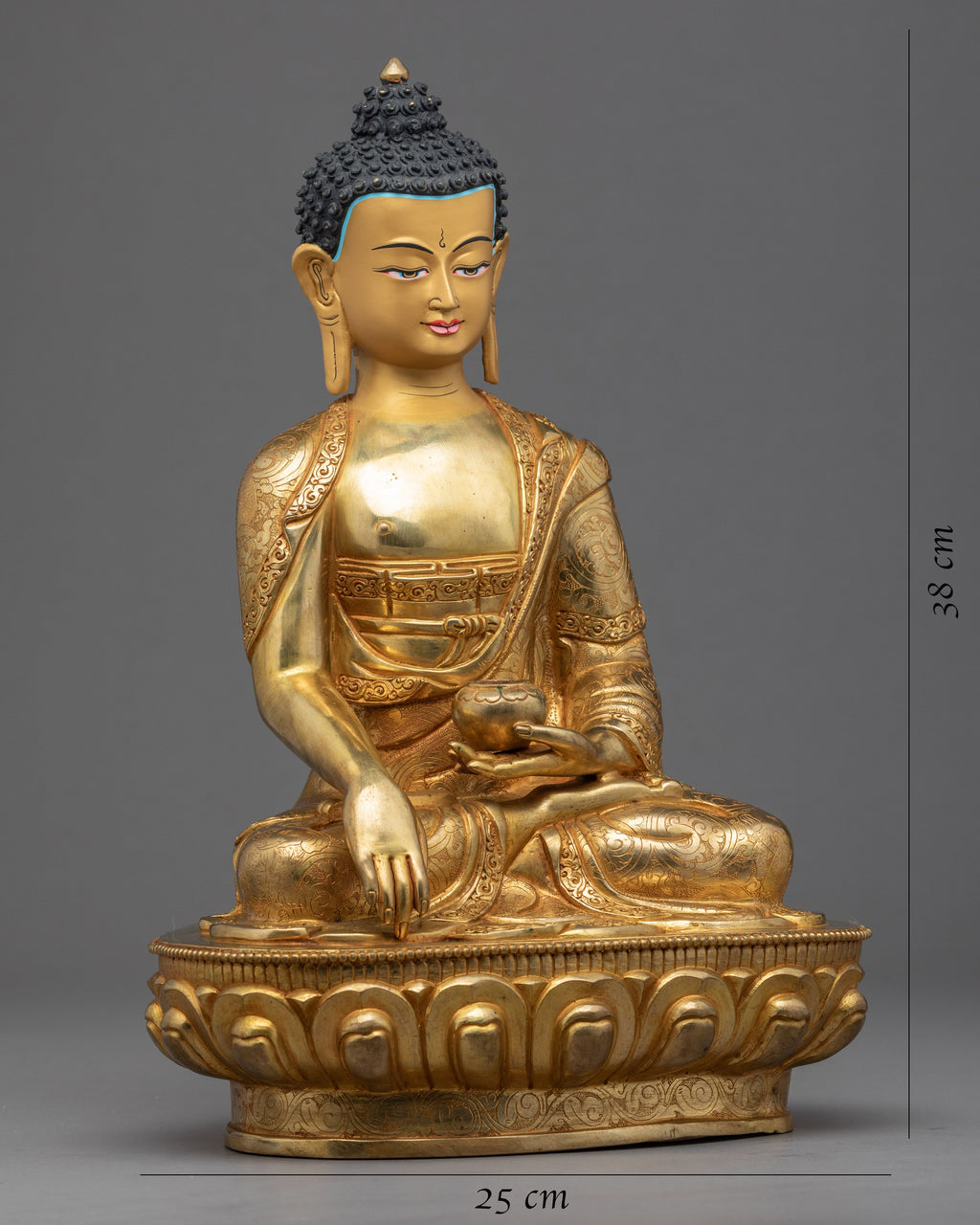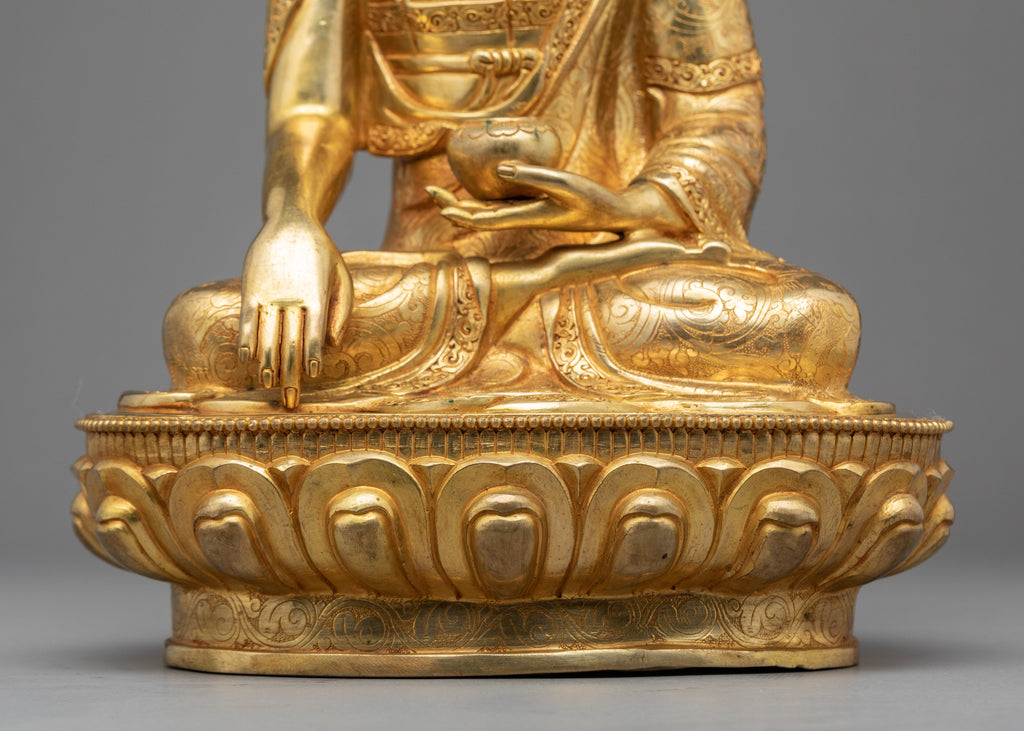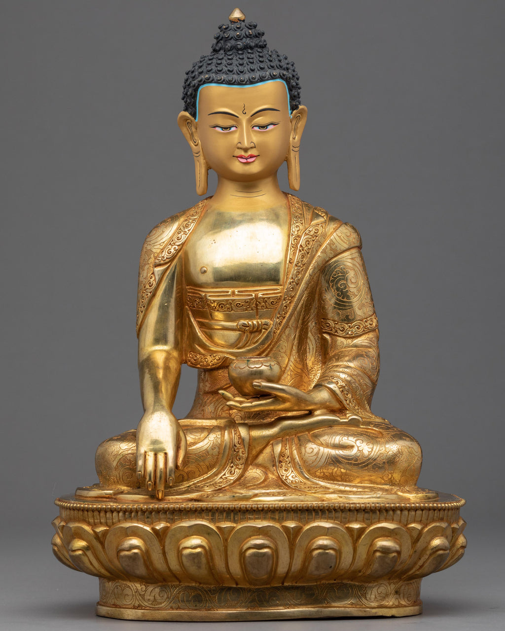 The Seated Buddha Siddhartha Sculpture was hand-carved in our studio using traditional Himalayan techniques. This statue was crafted using a copper body and then gilded with 24k genuine gold, which signifies the importance of the deity. His right hand is lightly touching the ground beneath him, while his left hand is holding an alms bowl while seated on a finely hand-carved lotus seat. Our painters worked extremely hard for months to create the unique patterns and features of this statue. This figure can be used in a variety of Buddhist rituals and meditation exercises, and it will be the perfect gift for a practitioner like you.