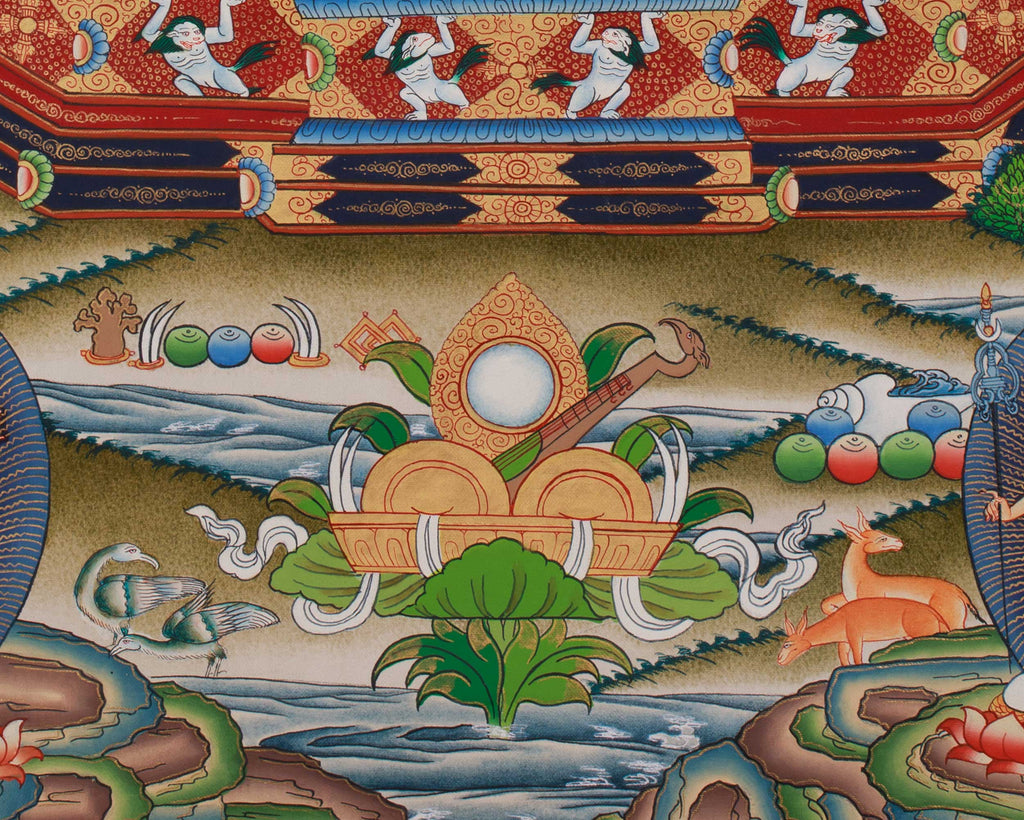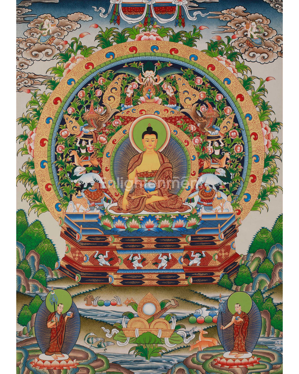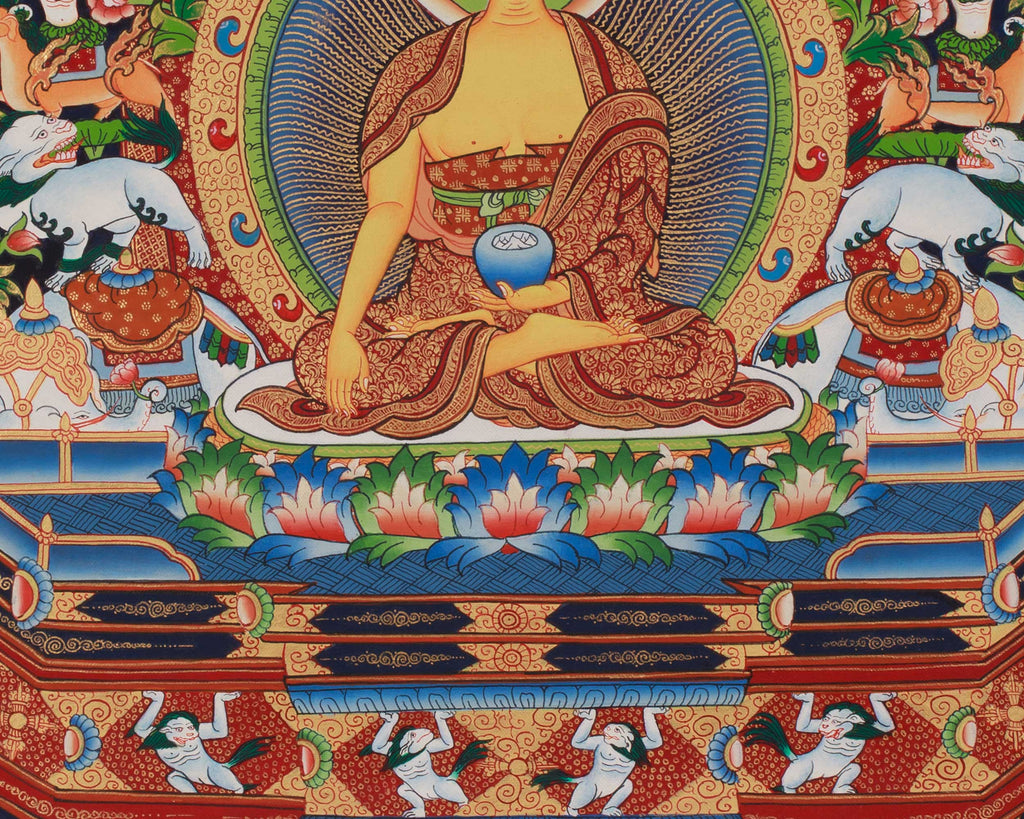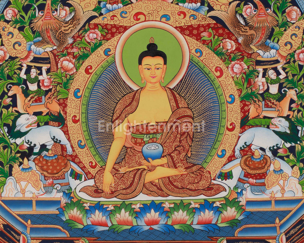 This thangka depicts Shakyamuni Buddha seated in a meditative posture atop an elaborate, tiered throne embellished with lotus motifs, symbolic animals, and ornamental patterns that signify stability, purity, and enlightened authority. Beneath him, his two disciples are respectfully positioned, emphasizing his role as the supreme teacher and spiritual guide. Encircling the central figure are lush landscapes, celestial beings, and decorative elements that establish a sacred environment imbued with harmony and protection. The symmetry, intricate detailing, and harmonious color palette exemplify high-quality traditional craftsmanship. This thangka is ideally suited for a meditation room, altar, or study space—inviting its tranquil, grounding presence into your environment and fostering a deeper connection to the Buddha’s eternal teachings.