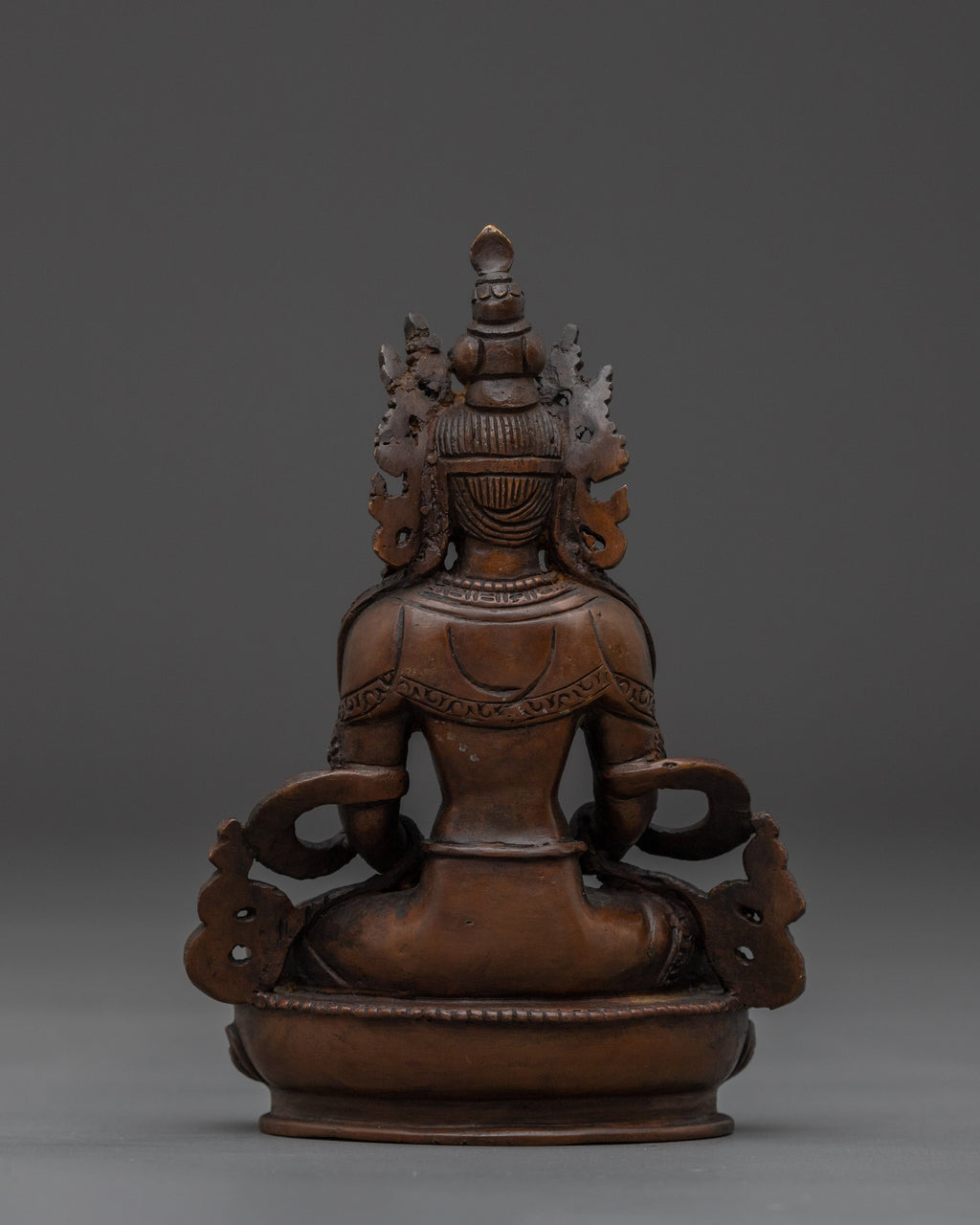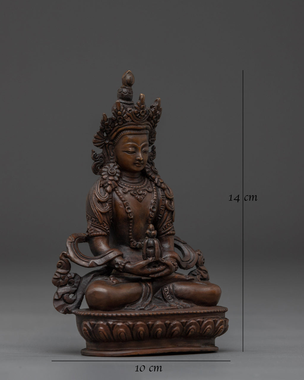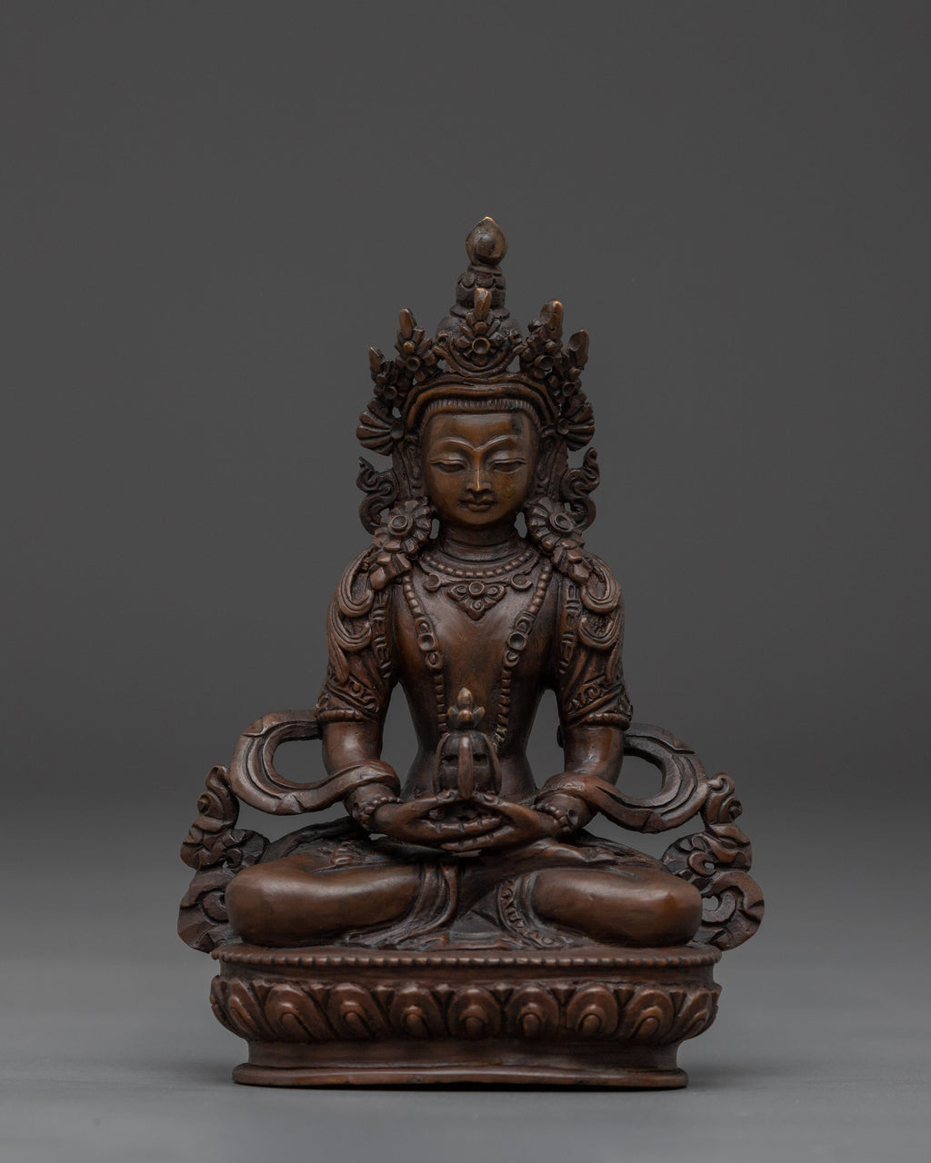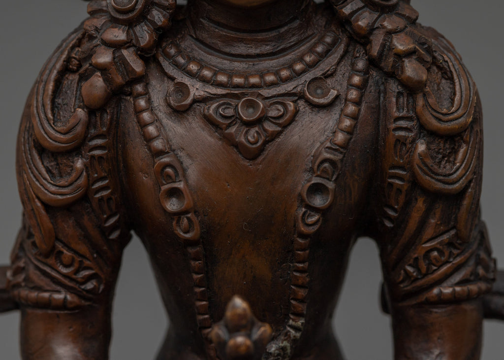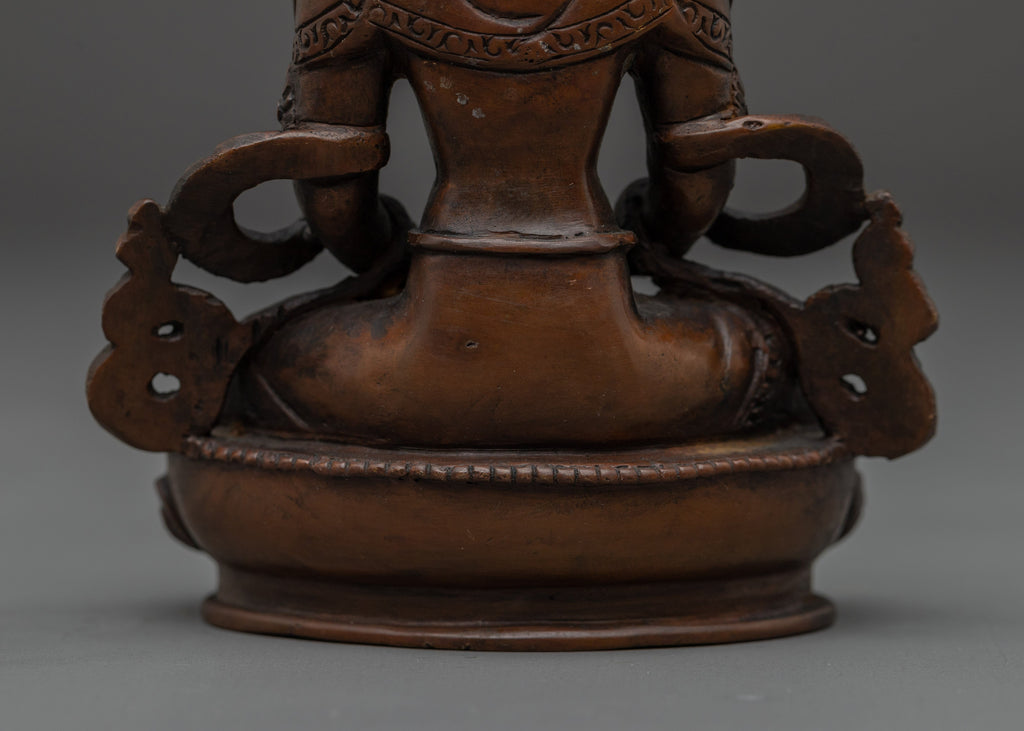 This Serene Amitayus Artwork is known as the deity of longevity, representing eternal life, knowledge, and spiritual blessings. This statue measures 5.5" (Height) x 3.9" (Base) and weighs 0.51 kg. It is made from fine oxidized copper. This artwork is created by expert Nepalese craftsmen representing the holy creativity of Himalayan Buddhism and would make an ideal addition to altars, meditation rooms, or sacred collections.