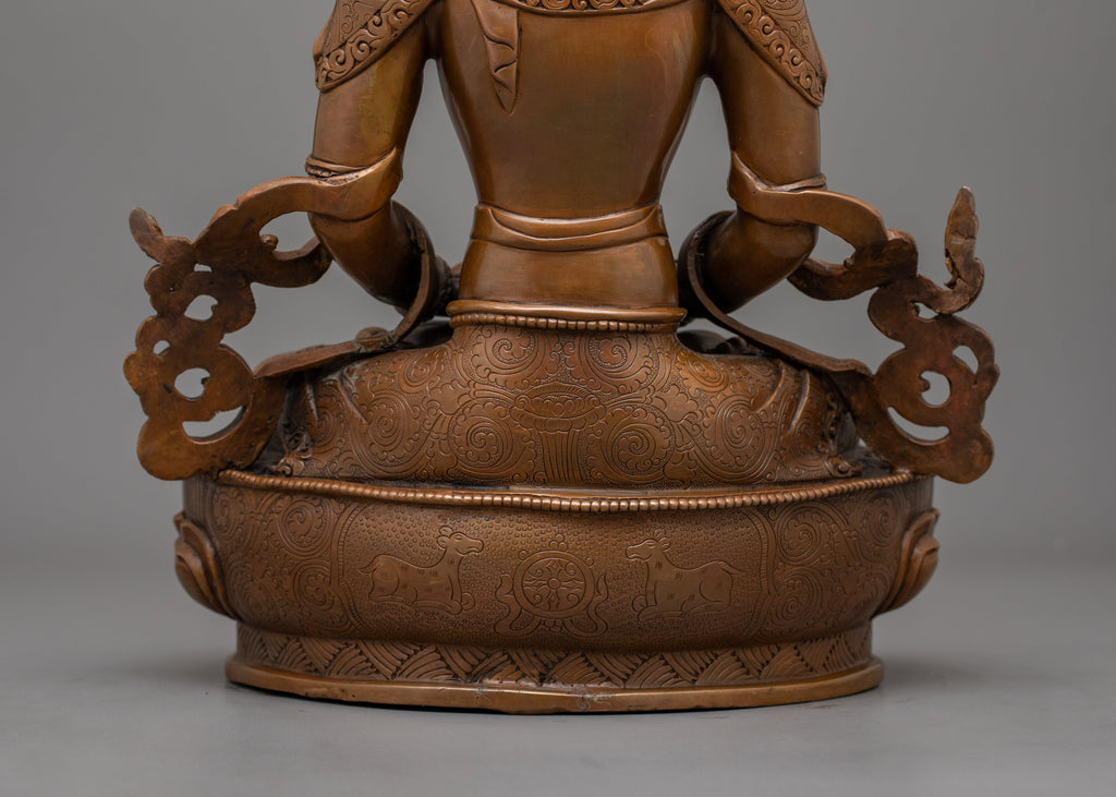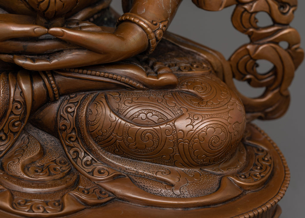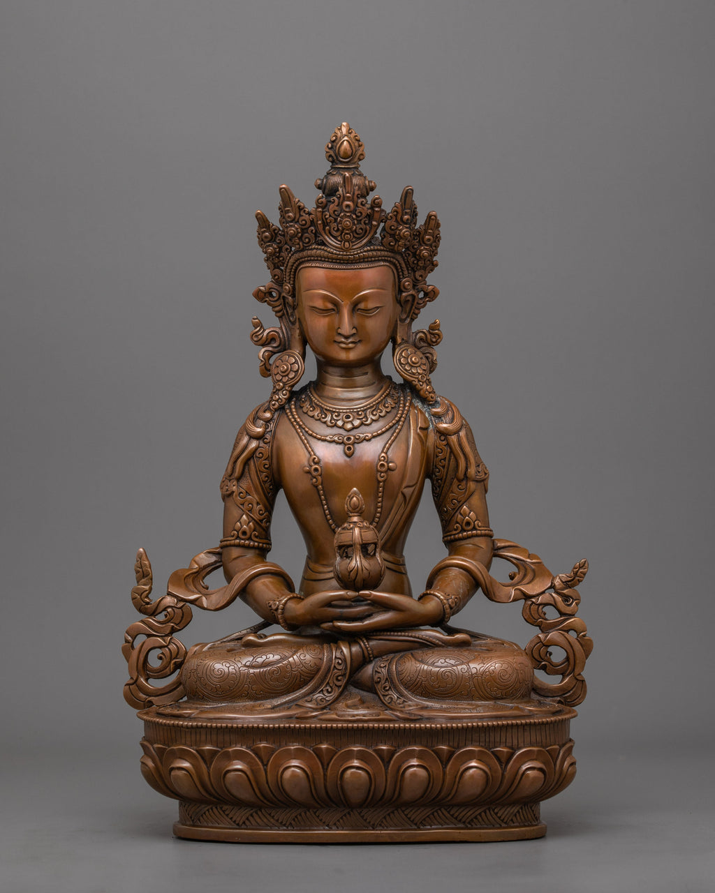 This Serene Amitayus Buddha of Longevity Statue represents eternal life, knowledge, and spiritual blessings. This statue measures 13.0" (Height) x 8.7" (Base) and weighs 3.32 kg. It is made from oxidized copper. This artwork is created by expert Nepalese craftsmen representing the holy creativity of Himalayan Buddhism and would make an ideal addition to altars, meditation rooms, or sacred collections.