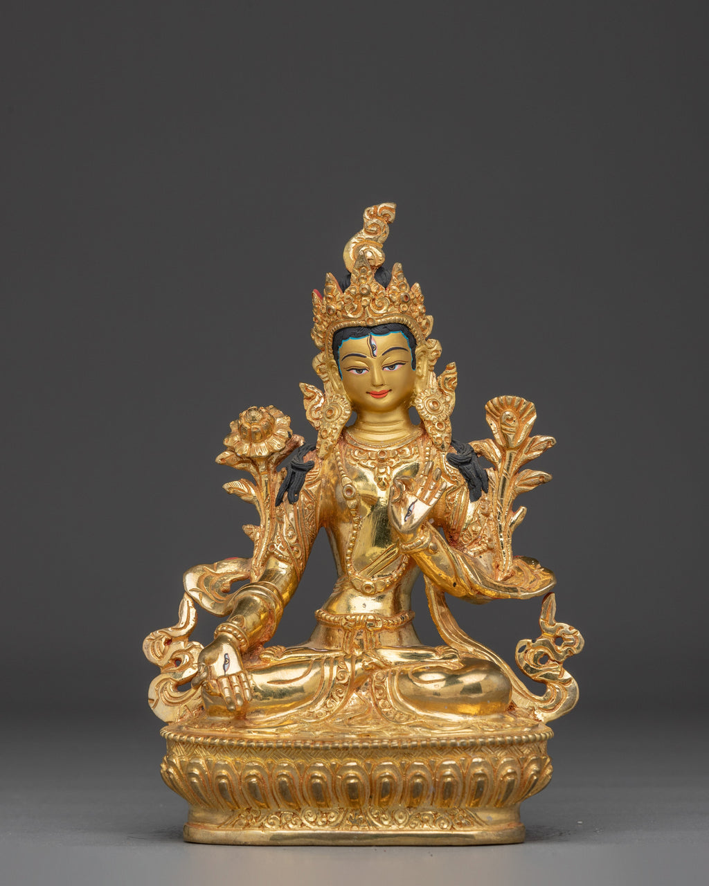 This Serene Bodhisattva White Tara Art is a symbol of compassion, healing, and longevity, radiates divine grace and spiritual blessings. This wonderfully handcrafted statue, which measures 8.9" (Height) x 6.5" (Base) and weighs 1.33 kg, is made of copper, 24K gold gilding, gold, and acrylic paints. This figure, crafted by talented Nepalese artisans, symbolizes the spiritual traditions of Himalayan Buddhism, making it an important addition to altars, meditation places, or sacred collections.