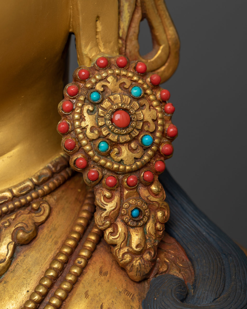 This statue, skillfully made from a copper body and embellished with 24K gold gilding, radiates a celestial brilliance. The elaborate gold and acrylic paintings depict Chenrezig's sympathetic look as well as the gorgeous, flowing robes that represent his purity and spiritual authority. Weighing 17.55 kg, its significant presence heightens the holiness of its surroundings, making it an essential addition to personal meditation spaces, yoga studios, or spiritual centers.