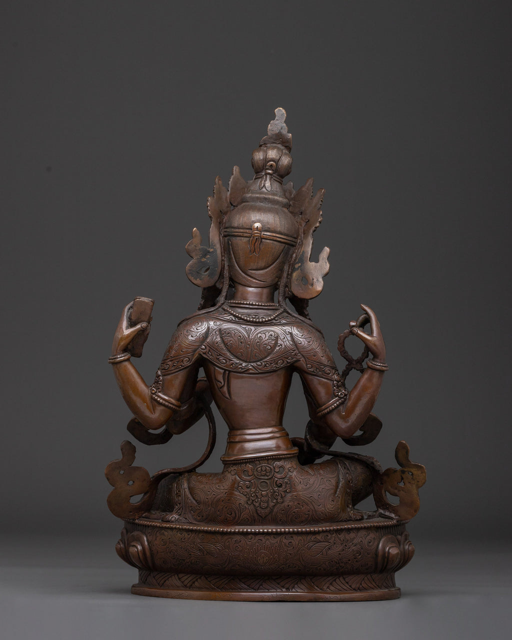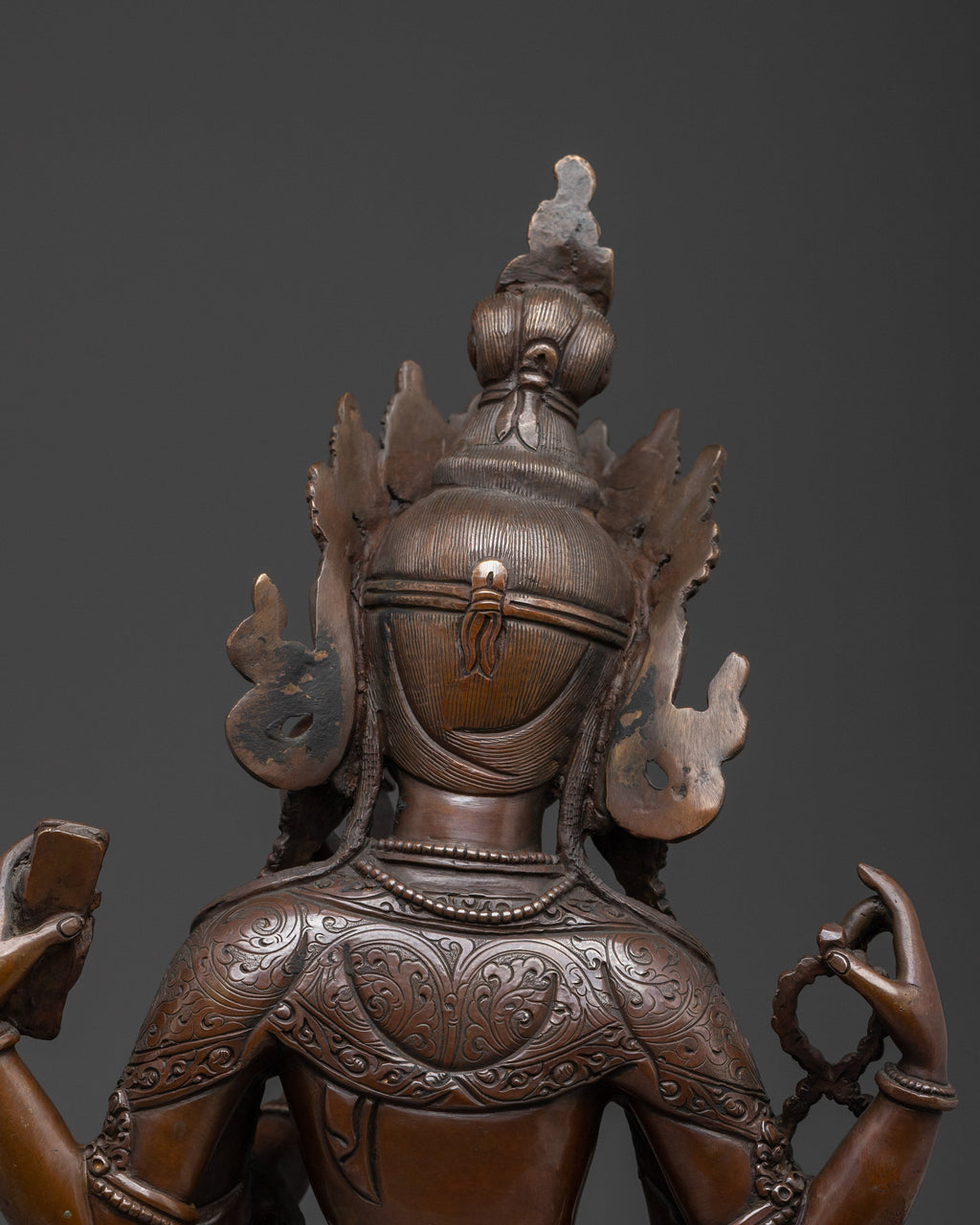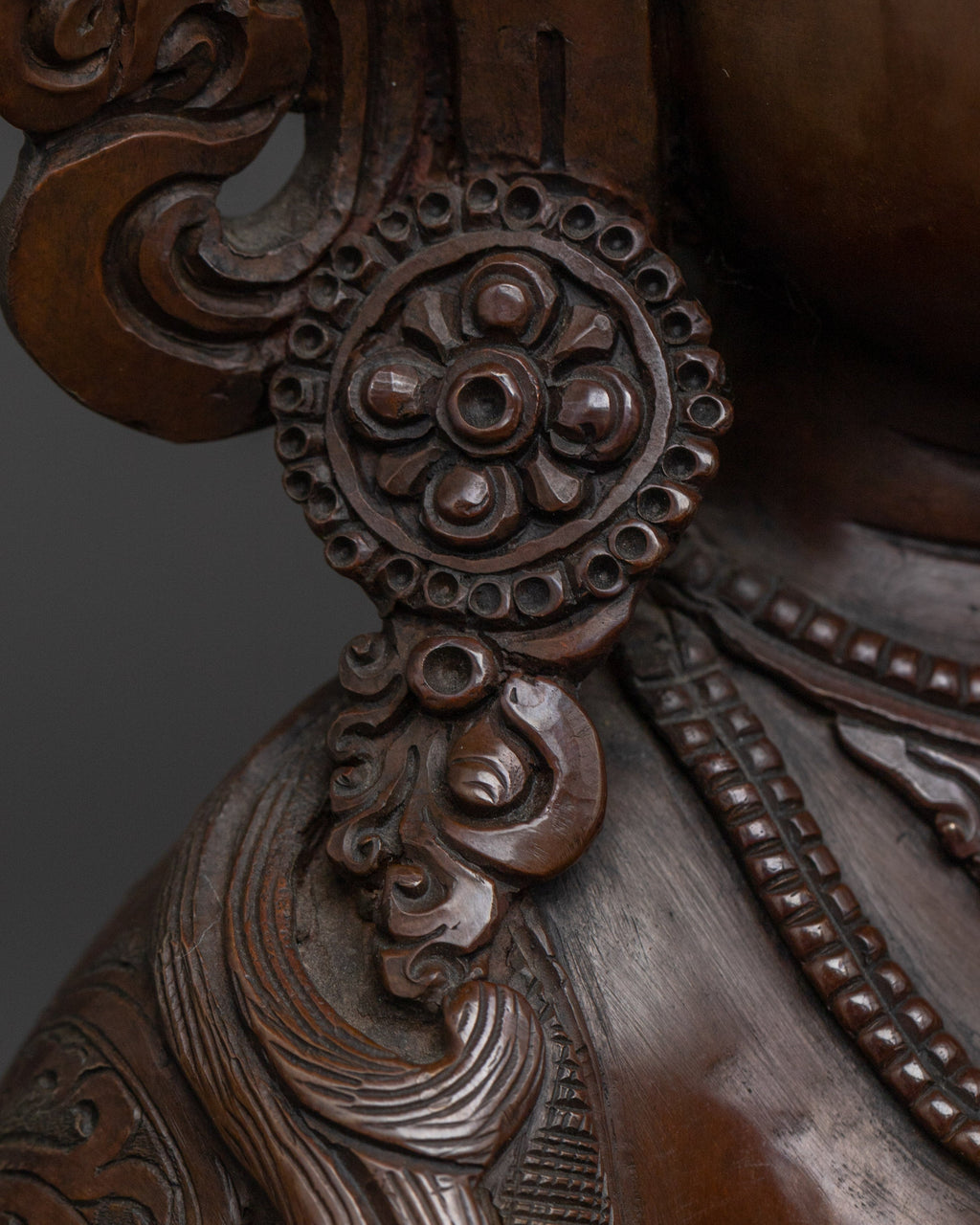 This Handcrafted Serene Saraswati Statue, also known as Bharati, measures 13.8”/35cm in height and 9.3”/23.5cm at the base and weighs 4.78 kg. Made from an Oxidized Copper Body, this statue is expertly crafted by skilled Nepali artisans. It embodies the calm and graceful nature of Saraswati, the goddess of knowledge, music, and the arts, making it a meaningful addition to meditation spaces, personal altars, or spiritual collections.