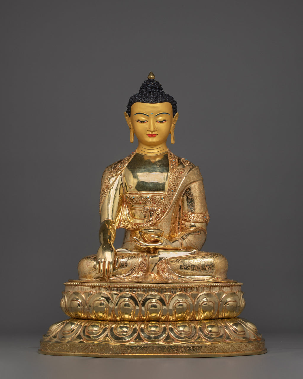 Shakyamuni Buddha is depicted in a calm, meditative state with half-closed eyes, embodying profound inner peace and an awakened presence. His right hand is in the bhūmisparśa mudrā (earth-touching gesture), signifying the moment he called the Earth to witness his enlightenment. His left hand holds an alms bowl, symbolizing renunciation and the simplicity of the monastic path. Atop his head rests the uṣṇīṣa, representing supreme wisdom, while his hair is styled in snail-like coils, referencing the well-known story of snails protecting him from the sun during prolonged meditation. He sits gracefully in the vajra posture on a moon disc lotus base, conveying stability, spiritual purity, and unwavering focus. This refined iconography honors the profound presence of the historical Buddha—serene, dignified, and deeply symbolic.