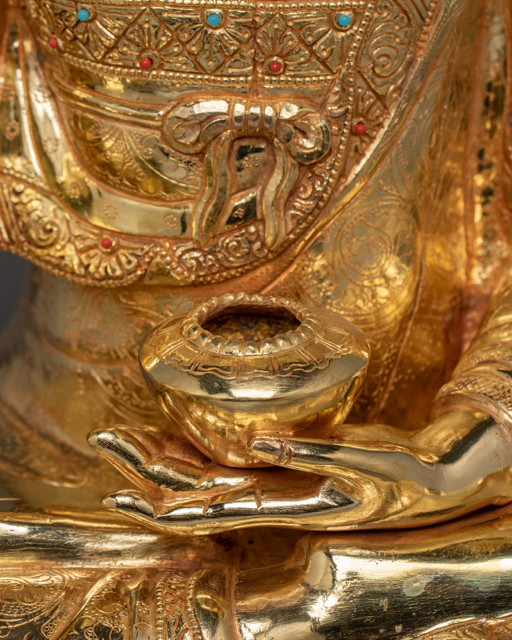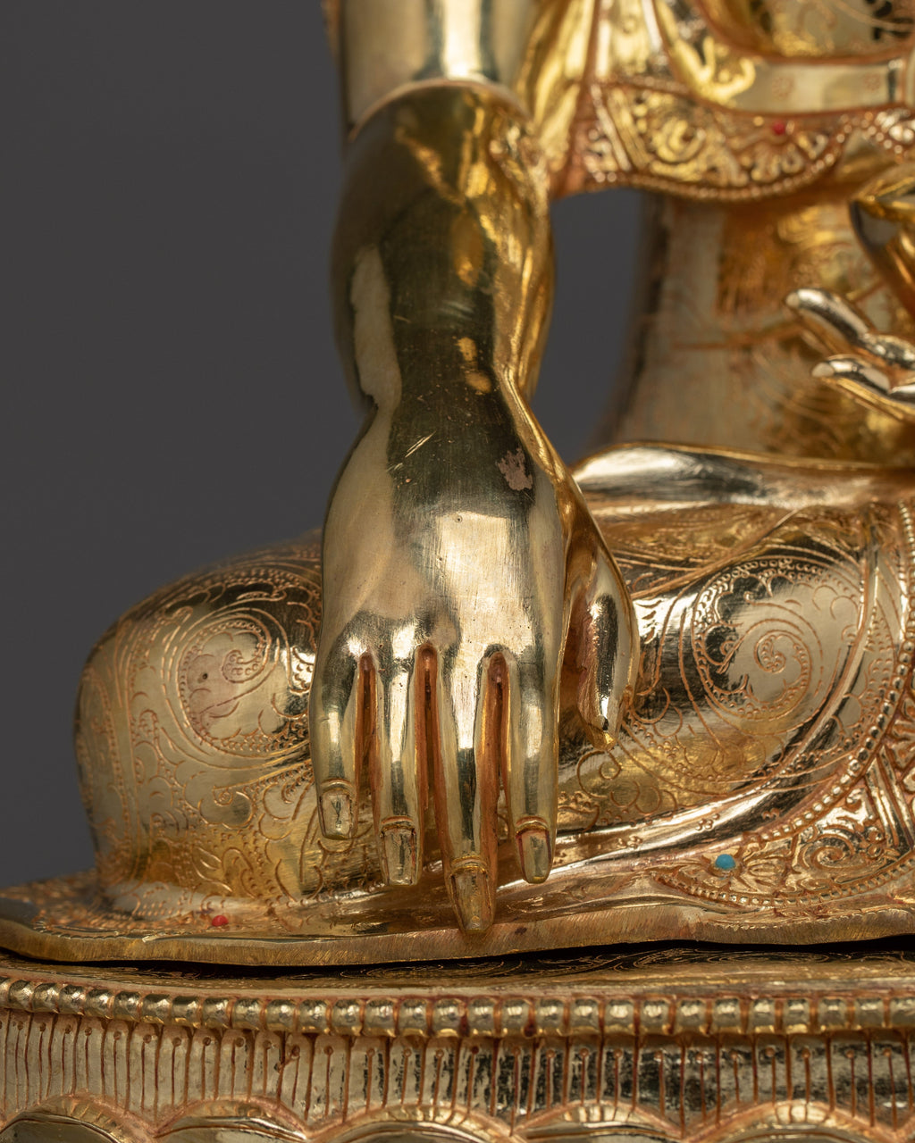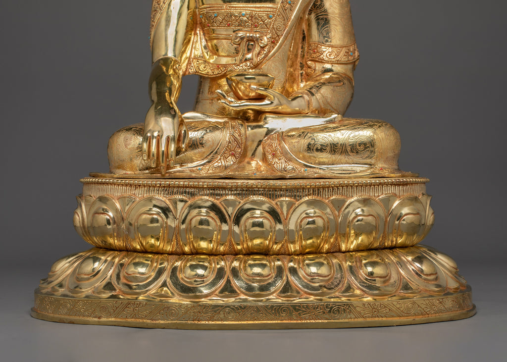 Shakyamuni Buddha is depicted sitting in the lotus pose (padmasana), indicating his steady concentration and mastery over the distractions of the material world. His right hand stretched toward the earth in bhumisparsha mudra, representing his moment of enlightenment, inviting the earth to witness his waking. The left hand, lying gently in his lap in dhyana mudra holding an alms bowl depicts the profound state of meditation and mindfulness that leads to insight and clarity.