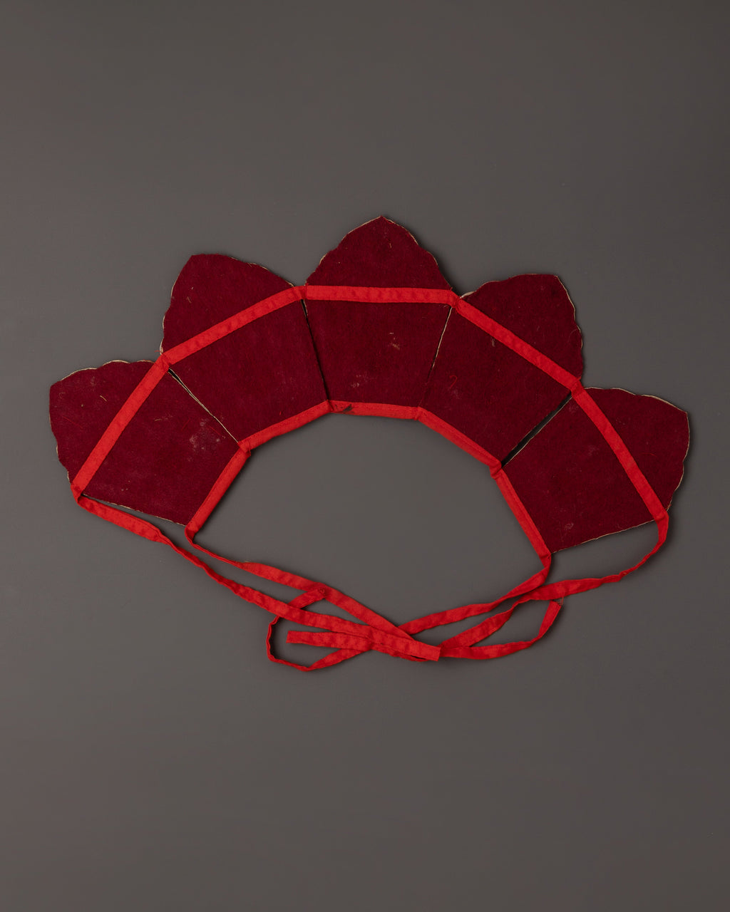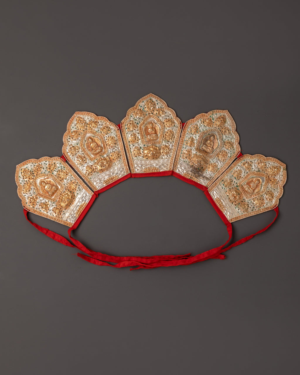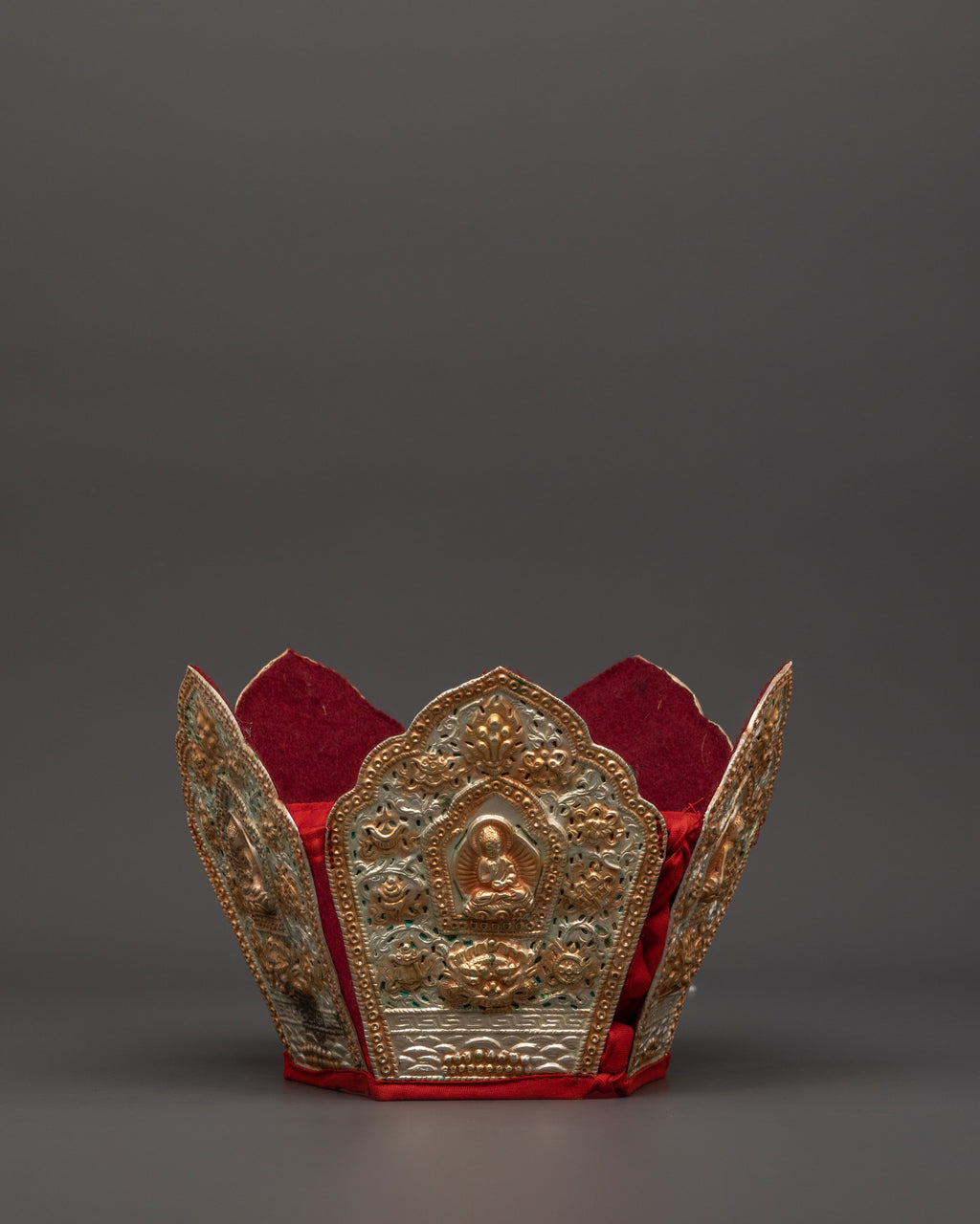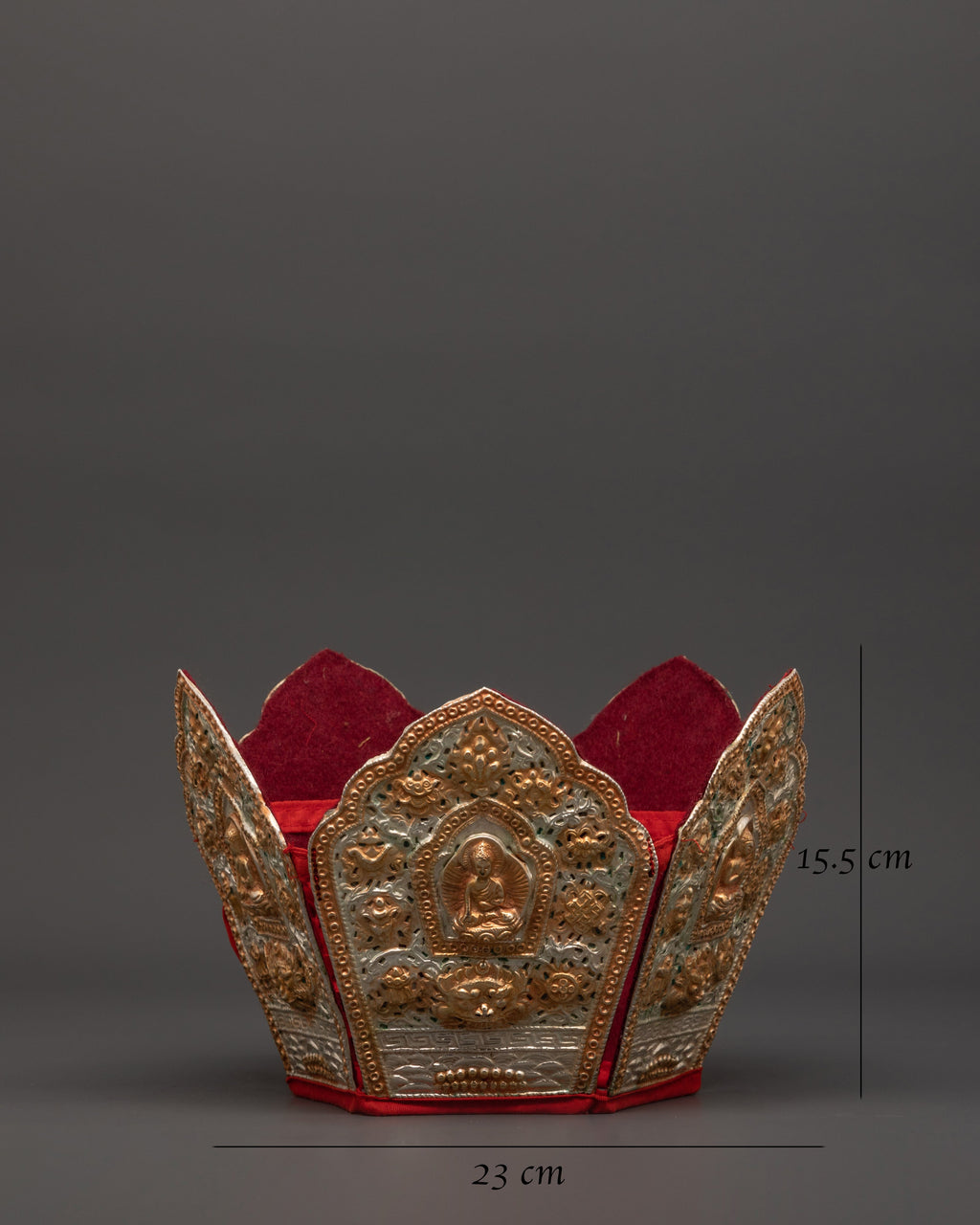 The Five Dhyani Buddhas Crown is a stunning Tibetan sacred art, handcrafted from genuine copper and finished with electro gold and silver plating. The crown bears the imprints of the five transcendental Buddhas of Vajrayana Buddhism—Vairochana, Akshobhya, Ratnasambhava, Amitabha, and Amoghasiddhi—each of whom represents heavenly wisdom and protection. With dimensions of 15.5 cm in height, 23 cm in breadth, and 51.5 cm in length, this spectacular ceremonial crown is both a spiritual symbol and a physically appealing artifact. The five-point crown design symbolizes the transformation of the five poisons into the five wisdoms and is historically worn by high lamas during tantric rituals and initiation ceremonies.