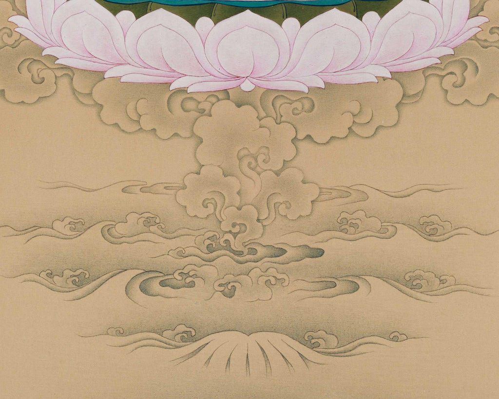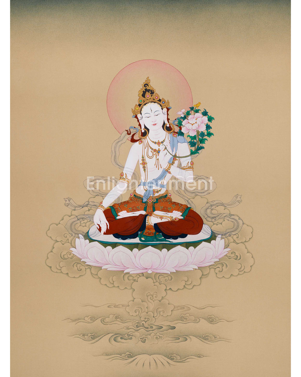 White Tara, the goddess of compassion and longevity, is honored for her healing abilities and endless mercy. As the symbol of wisdom and grace, she is often shown with seven eyes—on her forehead, palms, and soles—representing her capacity to see and heal the suffering of all sentient beings. In this thangka, White Tara sits gracefully on a blooming lotus, her calm expression providing comfort and protection to those who seek it. She is holding a lotus flower in her right hand, symbolizing purity and enlightenment, while her left hand is raised in a blessing gesture. Set against a backdrop of soft clouds and celestial beauty, this thangka beautifully conveys the gentle, peaceful energy of White Tara. It serves as a heartfelt visual tribute to her everlasting compassion and healing power, inviting viewers into a serene and uplifting experience.