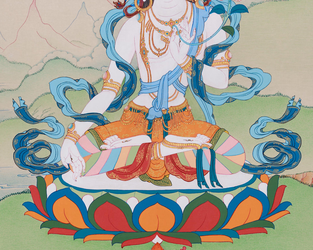 This thangka portrays White Tara, a revered deity celebrated for her compassion, protection, and ability to overcome obstacles. The seven eyes symbolize her deep wisdom and her capacity to see the suffering of all beings. Seated on a lotus, her posture signifies purity and spiritual achievement, while the Varada Mudra, with her hand extended outward, signifies generosity and compassion. Her tranquil expression and gentle stance embody divine knowledge and safeguarding qualities. This image emphasizes her vital role in guiding and shielding practitioners on their spiritual paths.