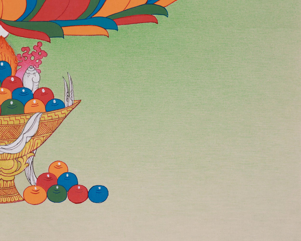 The Seven-Eyed Sita Tara Thangka is a magnificent work of sacred art, illustrating the goddess's compassionate presence and spiritual resilience through every detailed element. This thangka is meticulously hand-painted in the distinguished Karma Gadri style, renowned for its spacious arrangement and gentle, flowing lines that augment the artwork's contemplative quality. The cotton canvas offers a robust, textured foundation, facilitating intricate brushwork and enduring longevity. Vivid acrylic pigments are expertly applied to emphasize fine details and depth. At the same time, authentic 24K gold is used to highlight the sacred symbols and radiate the deity's divine essence. Collectively, these components forge a visually compelling and spiritually profound piece that exemplifies the esteemed tradition of Tibetan Buddhist artistry.