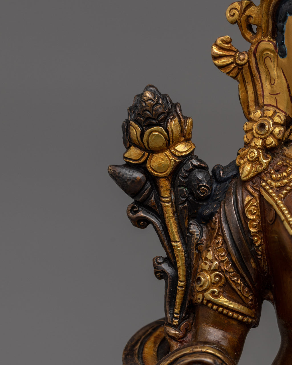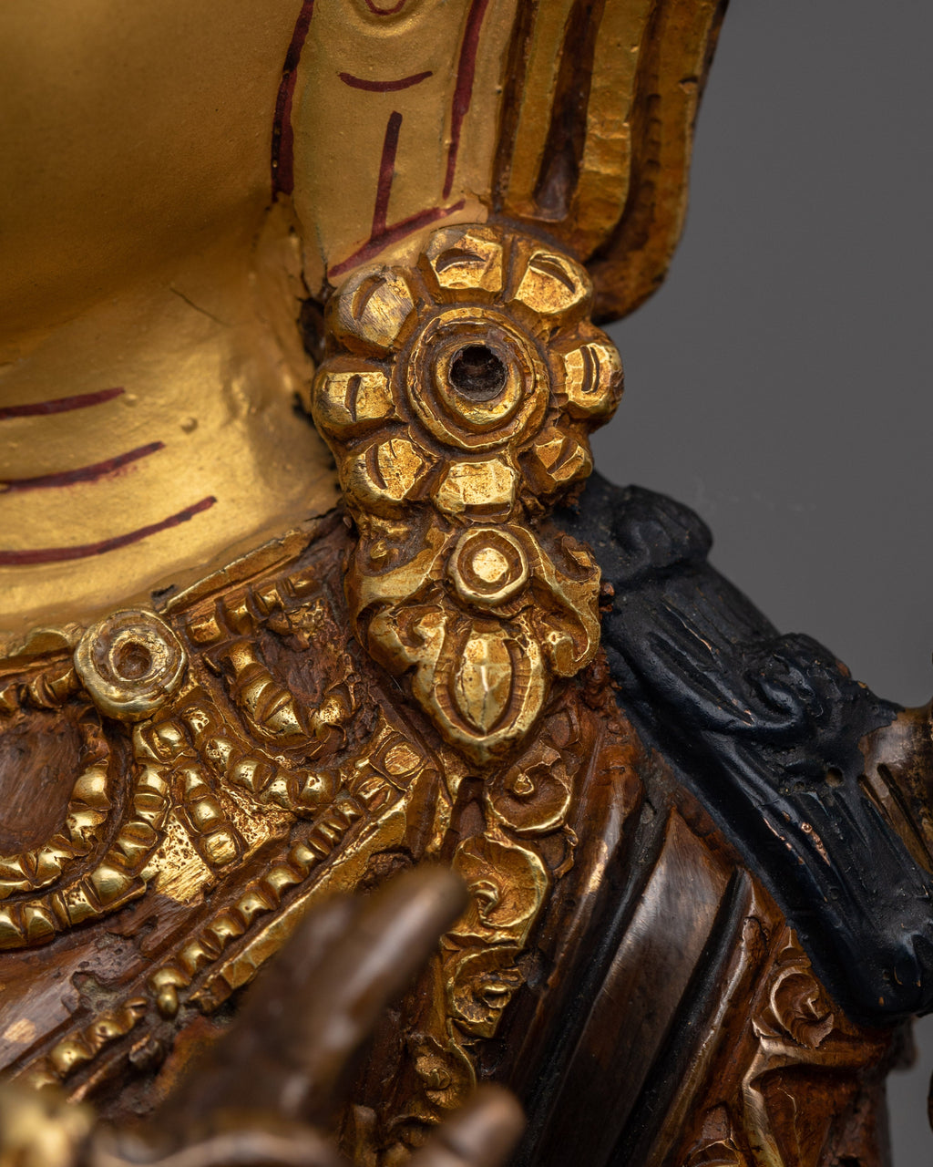 The Seven Eyes Deity White Tara Sculpture is a symbol of compassion, healing, and longevity, which radiates divine grace and spiritual blessings. This wonderfully handcrafted statue, which measures 12.6" (Height) x 8.7" (Base) and weighs 1.73 kg, is made of oxidized copper, 24K gold gilding, gold, and acrylic paints. This figure, crafted by talented Nepalese artisans, symbolizes the spiritual traditions of Himalayan Buddhism, making it an important addition to altars, meditation places, or sacred collections.